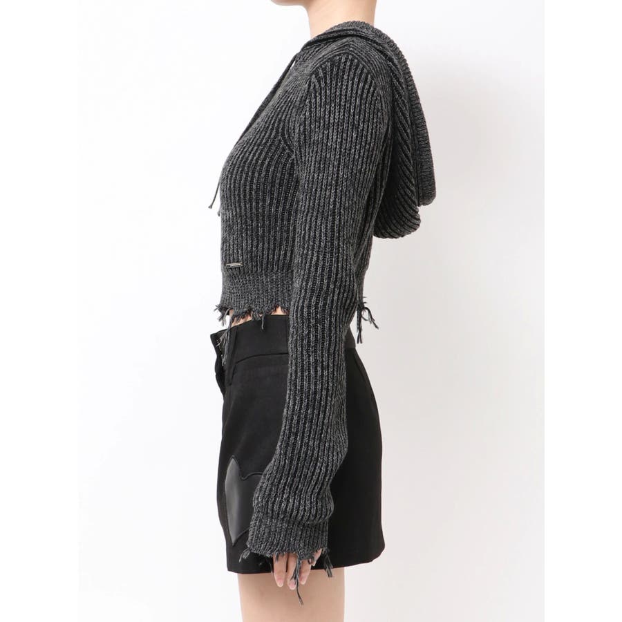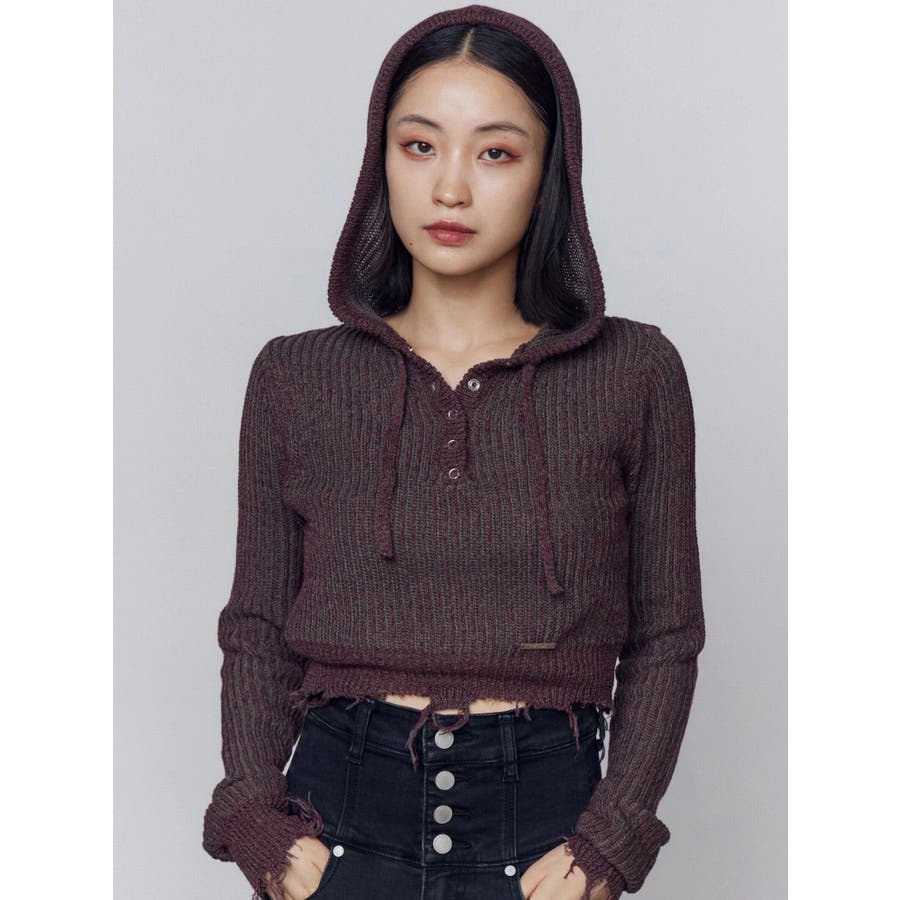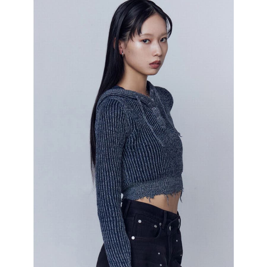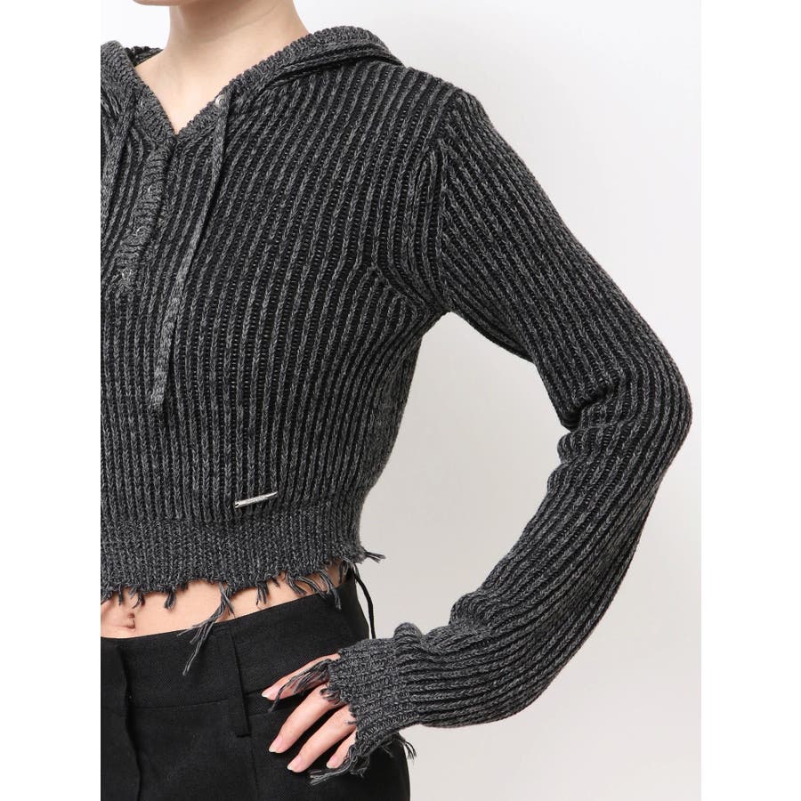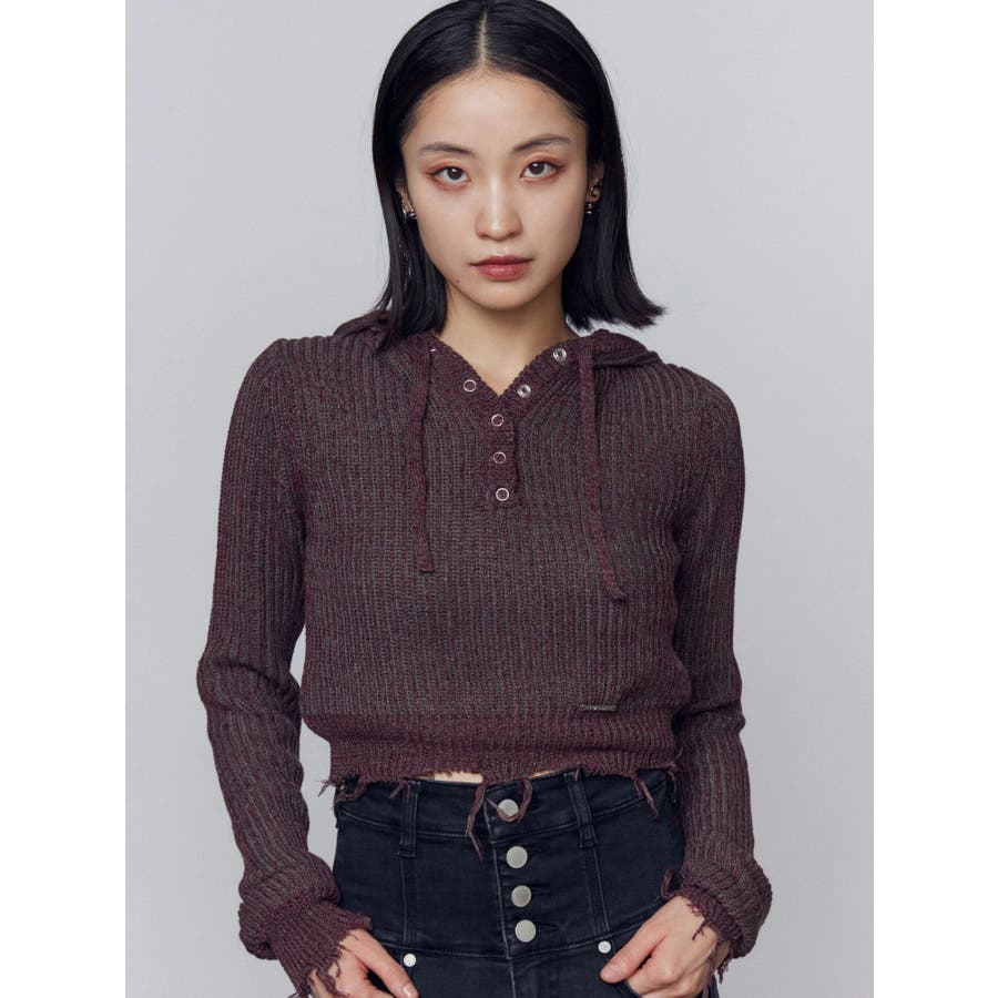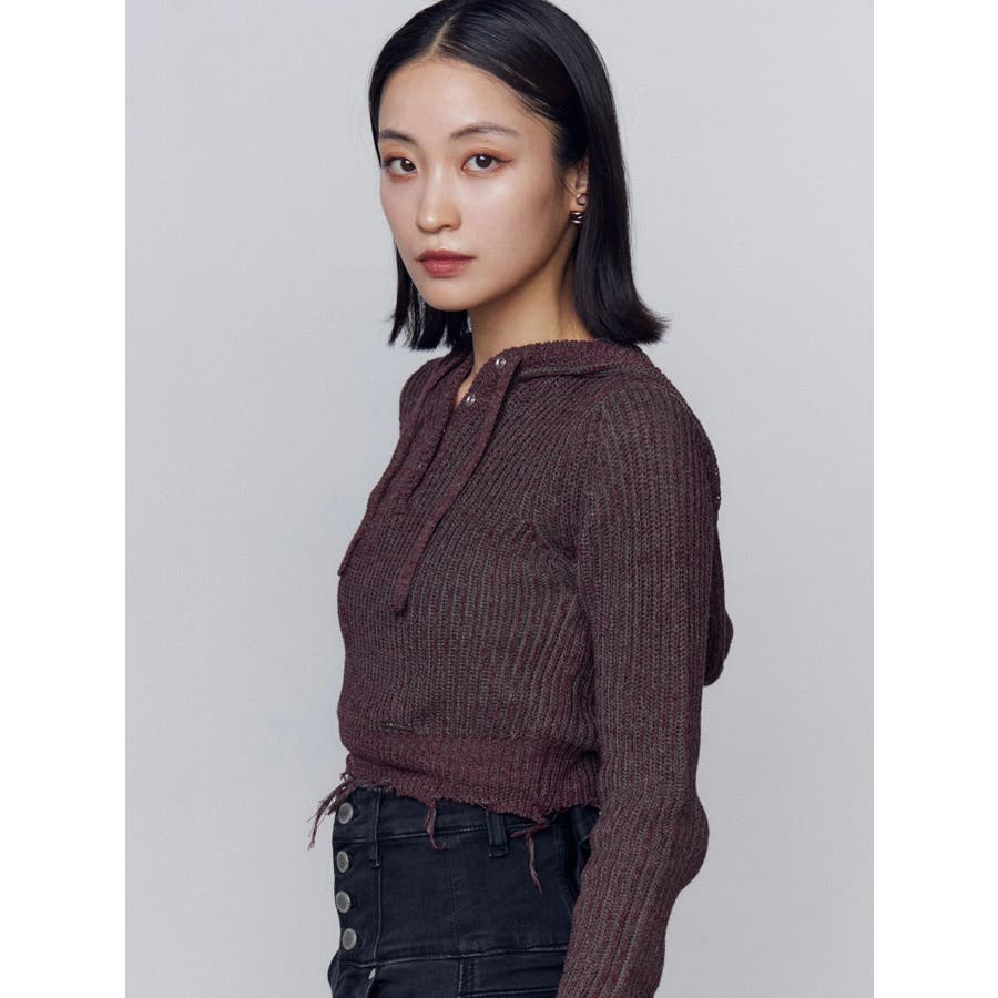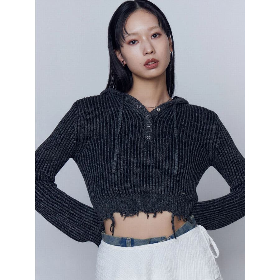 プルオーバータイプのニットパーカー■デザイン袖口と裾はダメージ加工を施しカジュアルな雰囲気に。フロントにはリングボタンとプレートを付けてクールさをプラス。プレーティング編みにしているのでミックスされた糸の色がさりげなくおしゃれな印象に見せてくれます。ボディはコンパクトですが片畦編みでルーズに仕上げているのでどんな方でも着やすいサイズ感です。■スタイリング一枚着はもちろん、シャギージャケットコートのようなアウターのインナーに使用しフードを出す着こなしもおすすめです。ワイドパンツ合わせでメリハリのあるバランスで着用するのがイチオシです。※着用画像はフラッシュの加減で実際の製品と色味等が異なる場合がございますので、生地のズームアップ画像をご確認ください。※ご利用の端末画面の設定により実際の商品と色味が異なる場合がございます。【商品特徴】透け感:なし伸縮性:ややあり生地の厚さ:普通サイズ感:普通裏地:なしポケット:なし