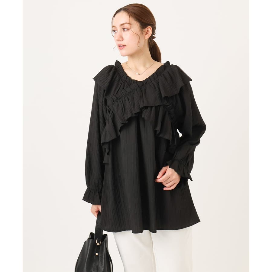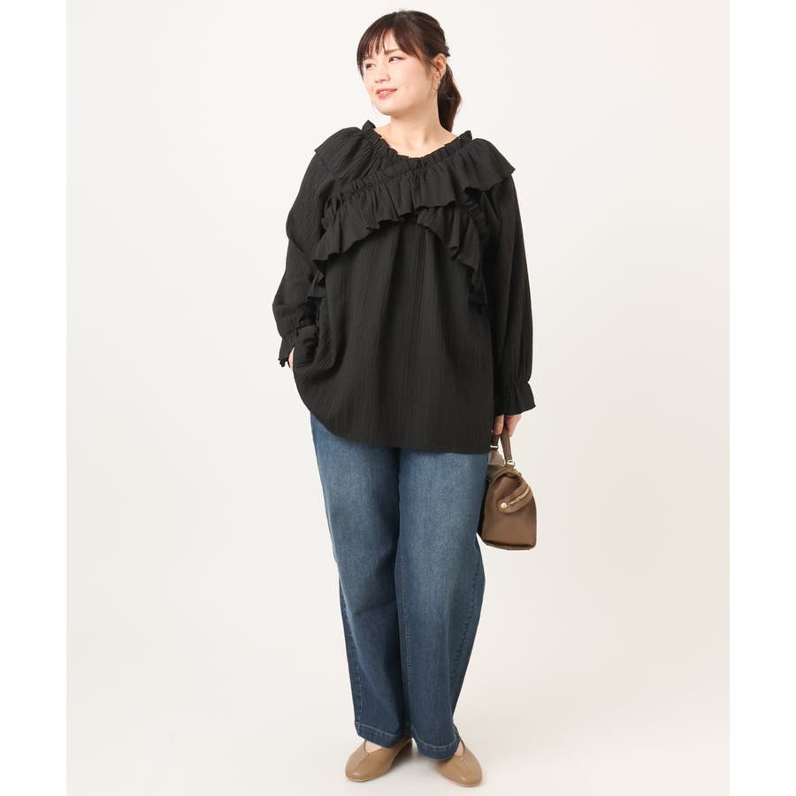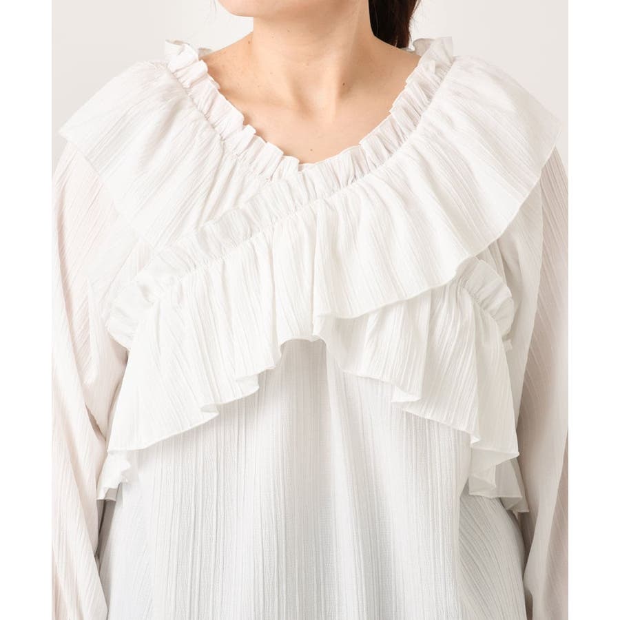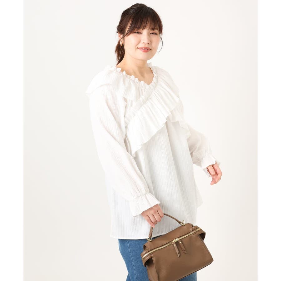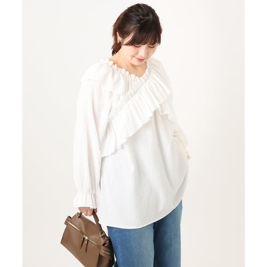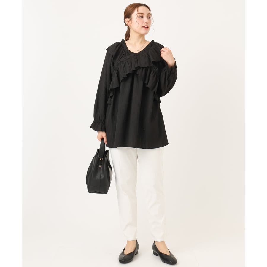 程よいボリューム感のフリルがフェミニンな印象のフリルブラウス。