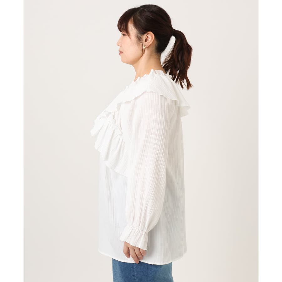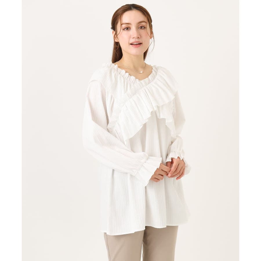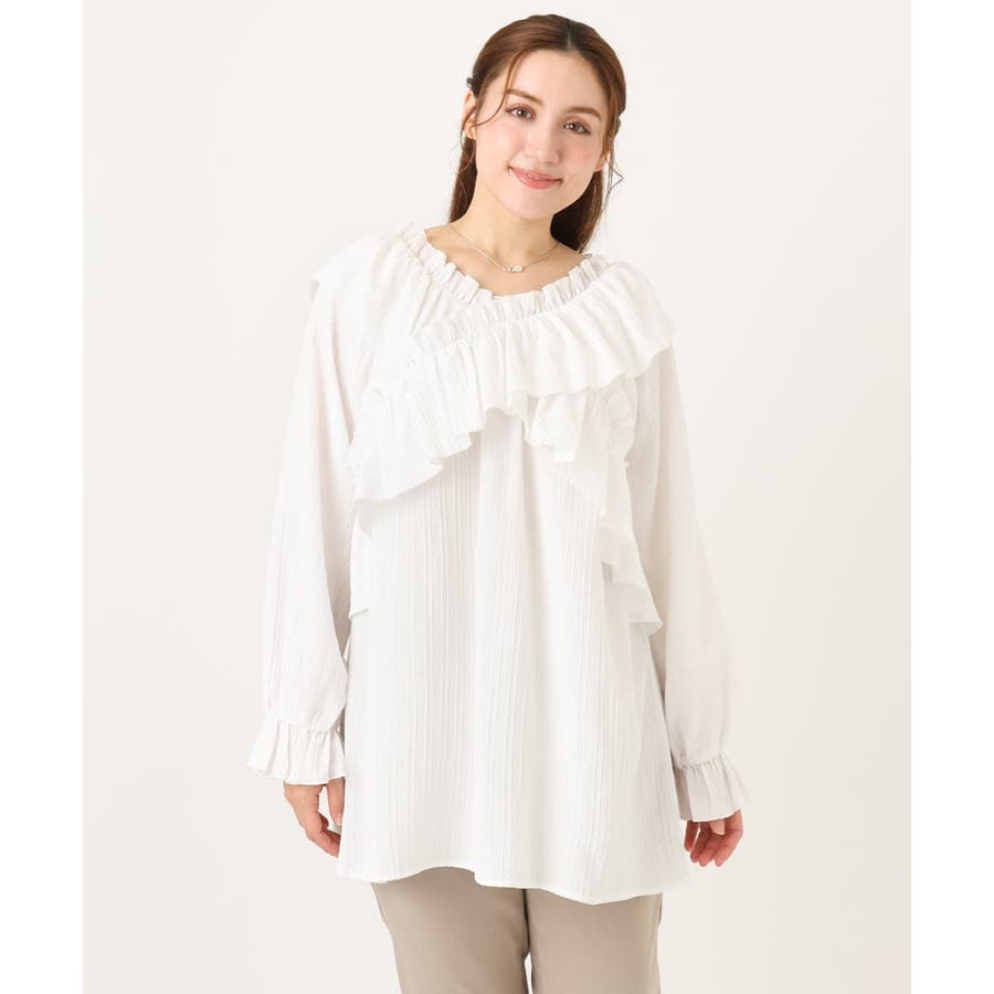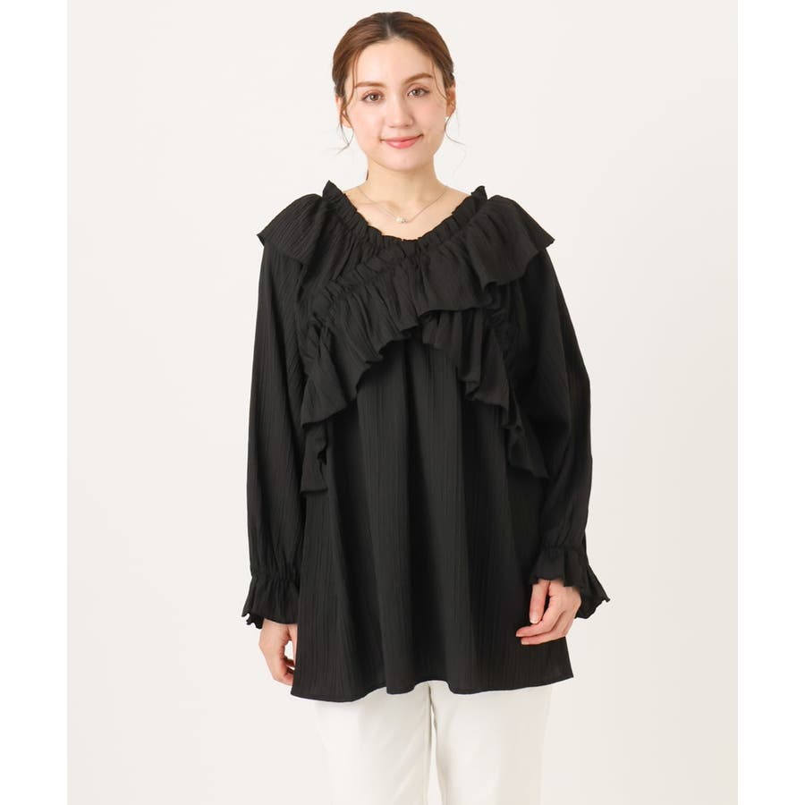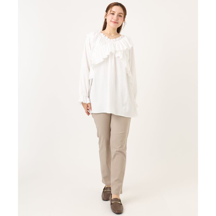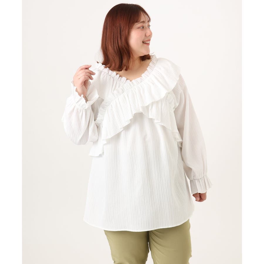 程よいボリューム感のフリルがフェミニンな印象のフリルブラウス。