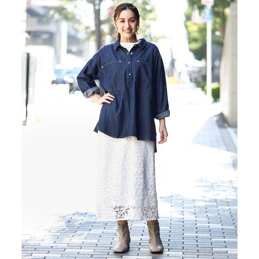 ボタンを開けてレースインナー(品番OLKDA03089)を見せて着る甘辛スタイルがおすすめ。