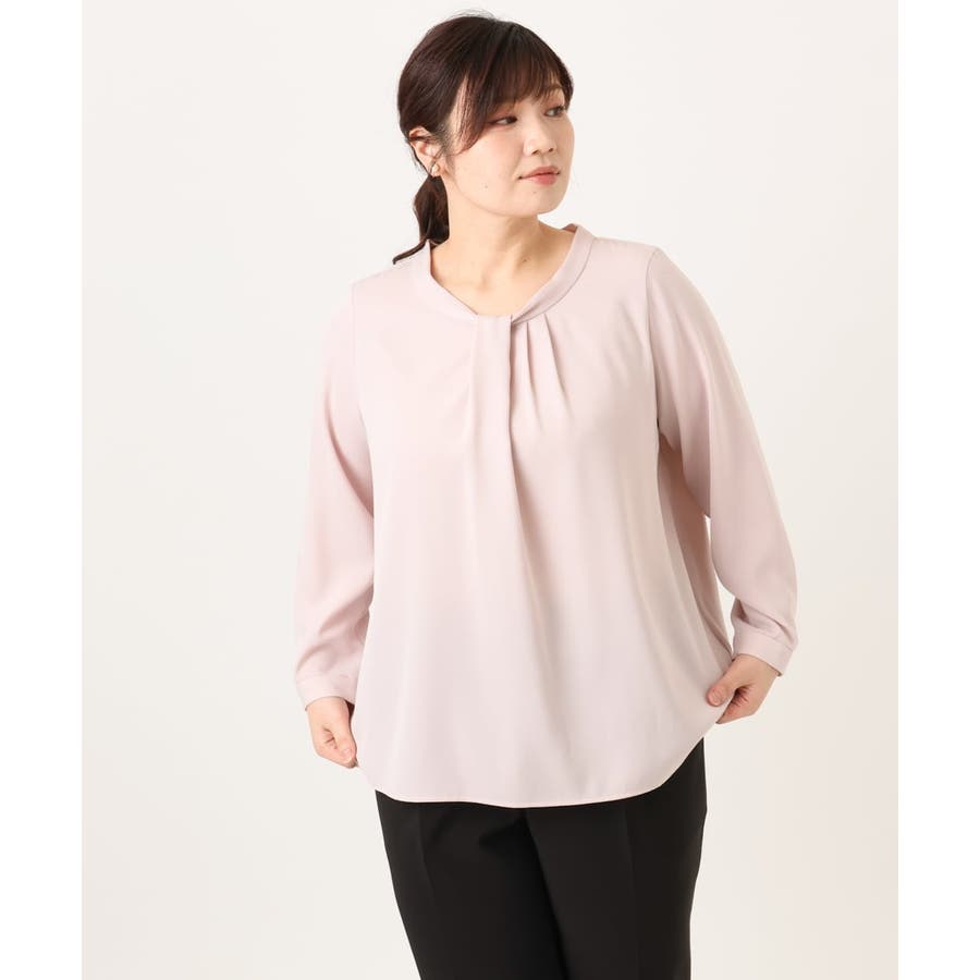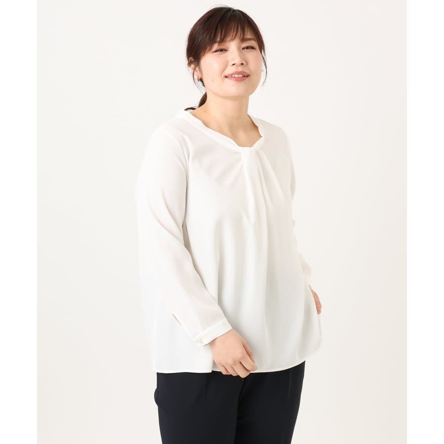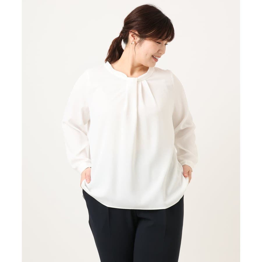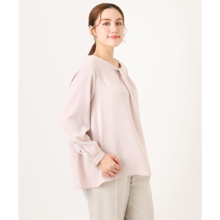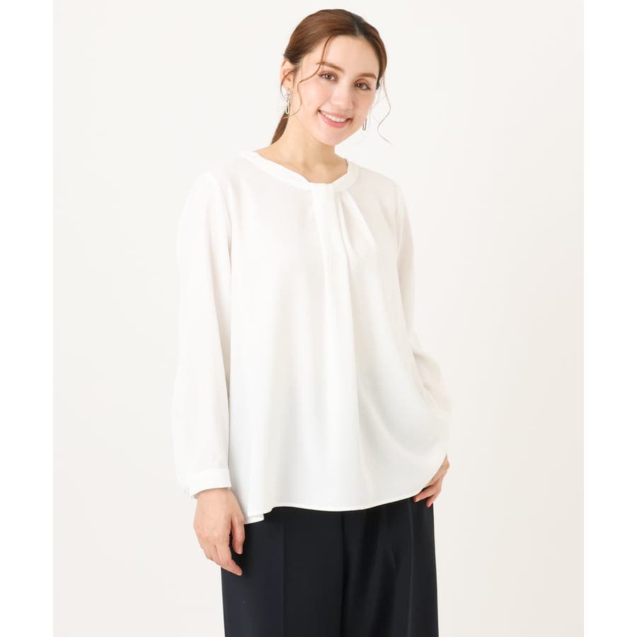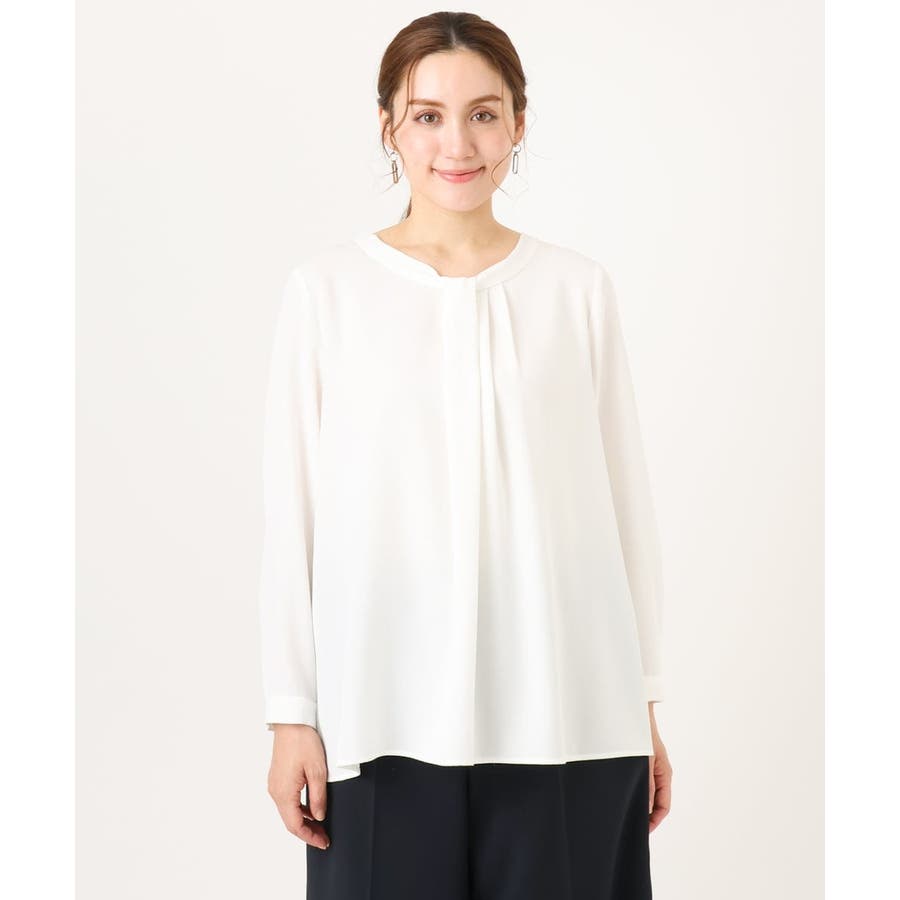 首元をすっきり見せる洗練された印象の上品なブラウスです。