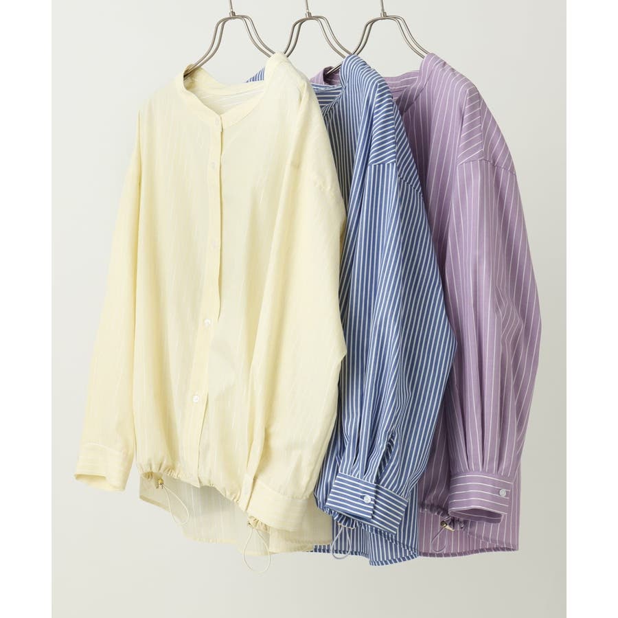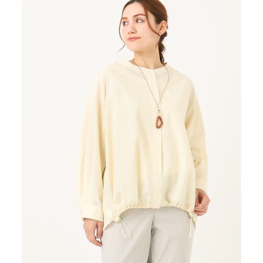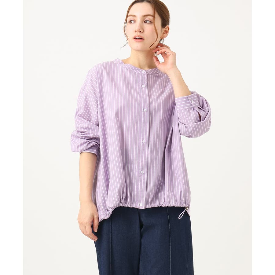 襟元スッキリと着用できるバンドカラ―シャツ。