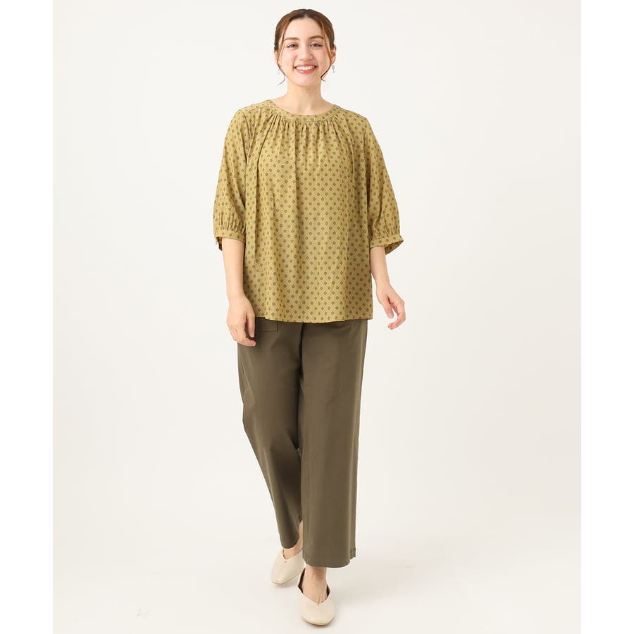 ギャザーを寄せた襟ぐりはジャケットやカーディガンのインナーにもすっきりきれいに決まります。