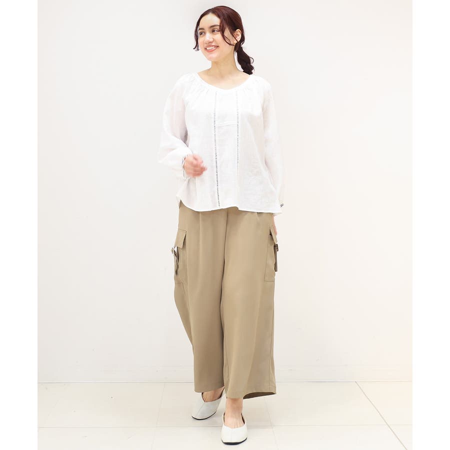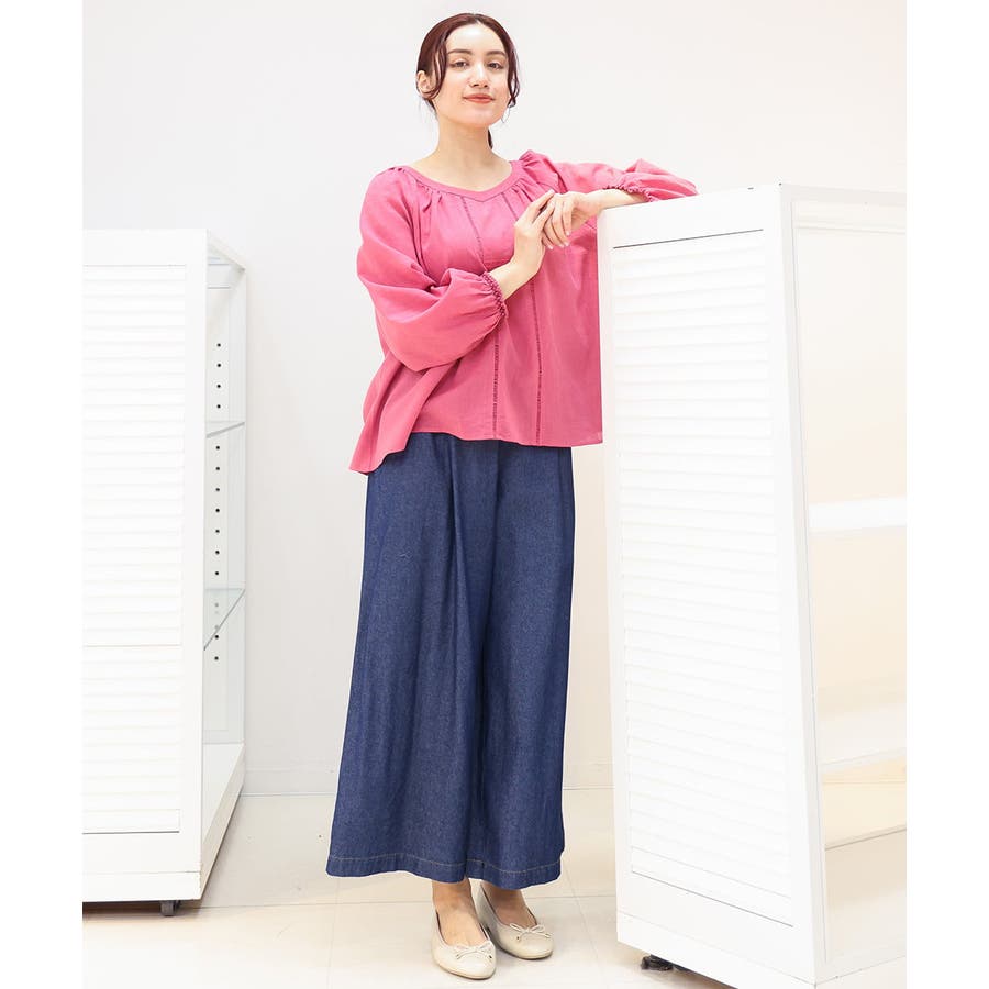 着丈が短めなのでワイドパンツと合わせたスタイリングがおすすめ。