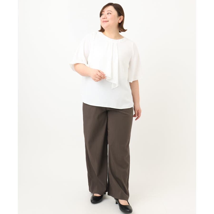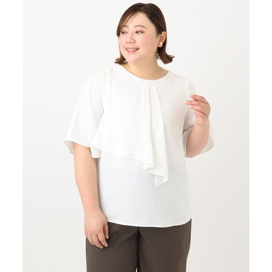 アシンメトリーに入れたドレープがボウブラウス風に見えるフェミニンな印象のブラウス。