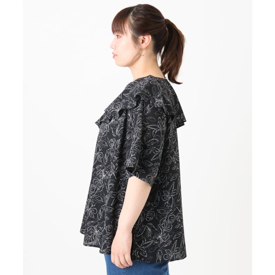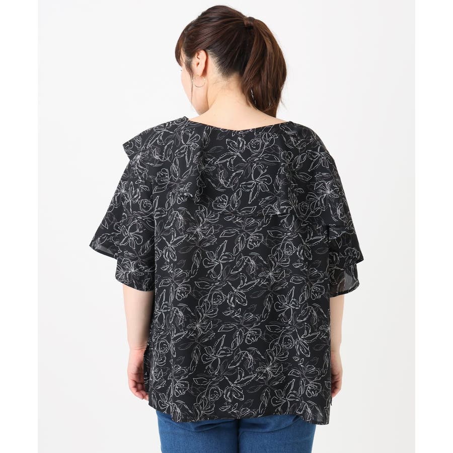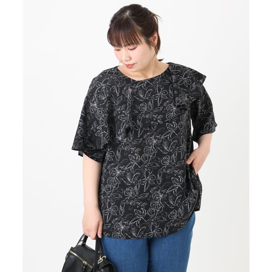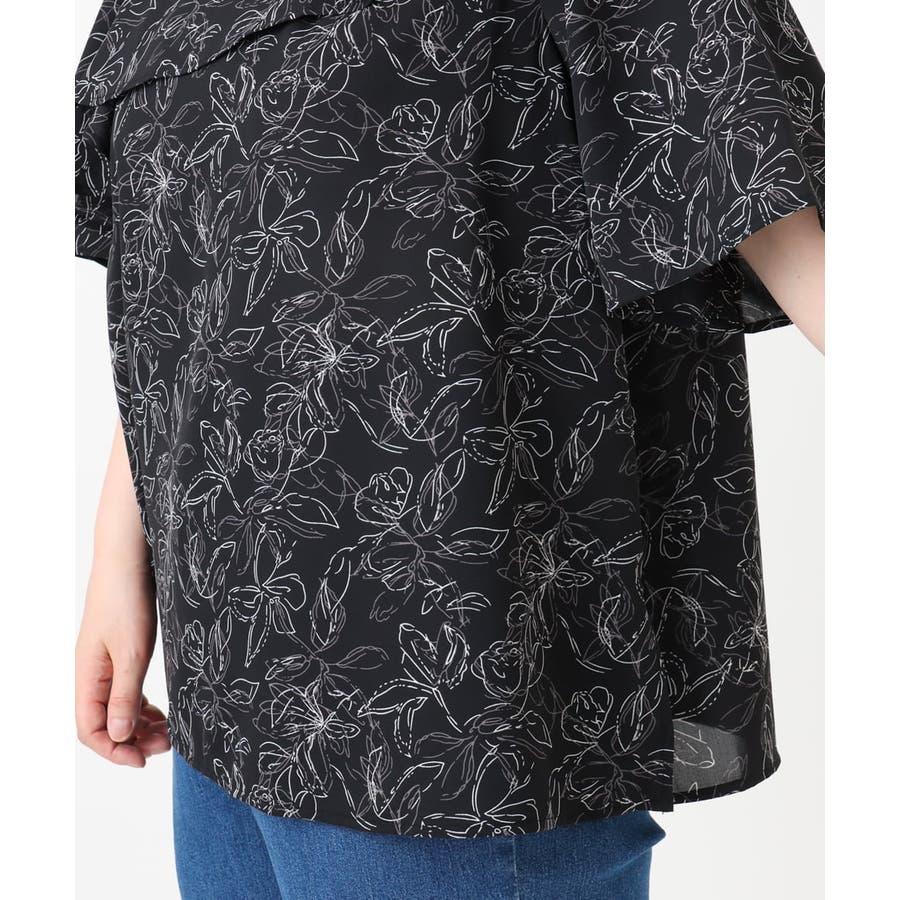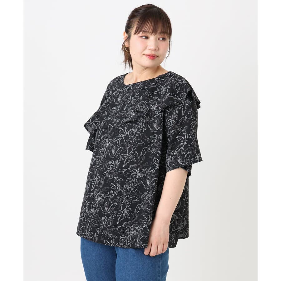 【大きいサイズ】フリルカラーフラワープリントブラウス