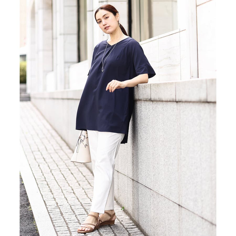 襟元がすっきり見えるの浅めのVネックブラウス。