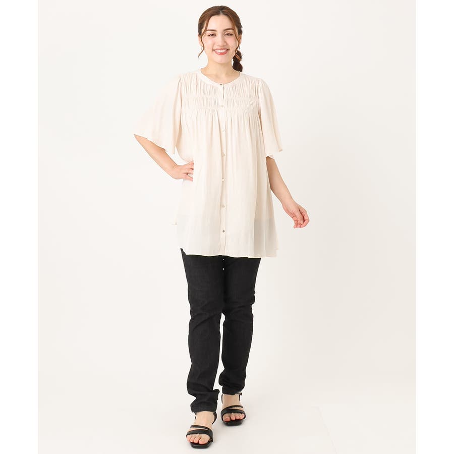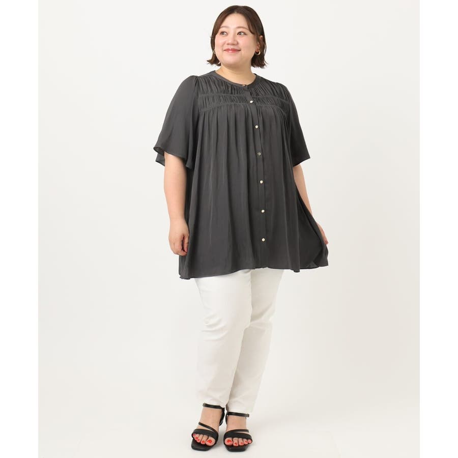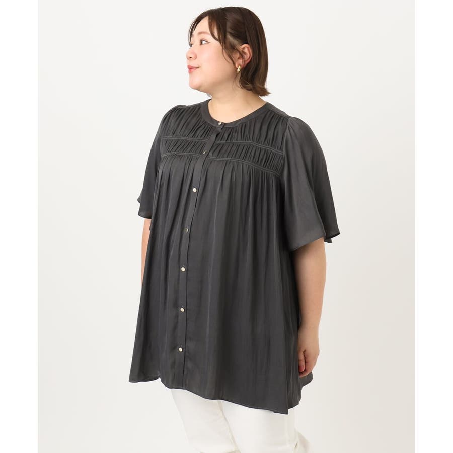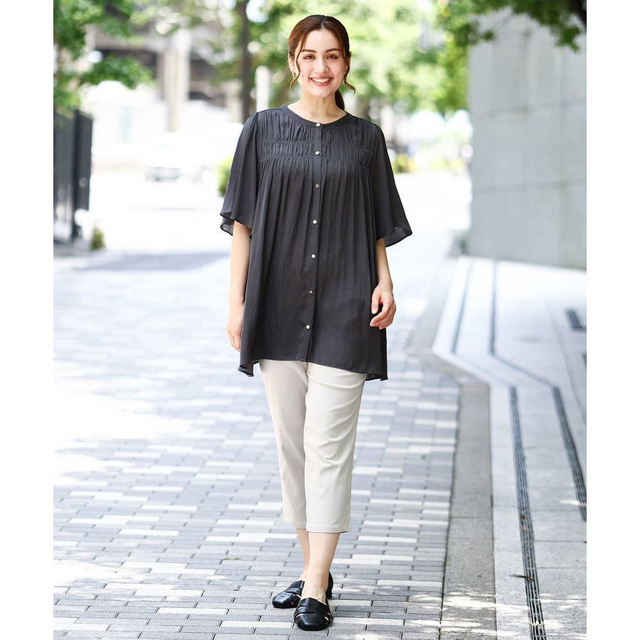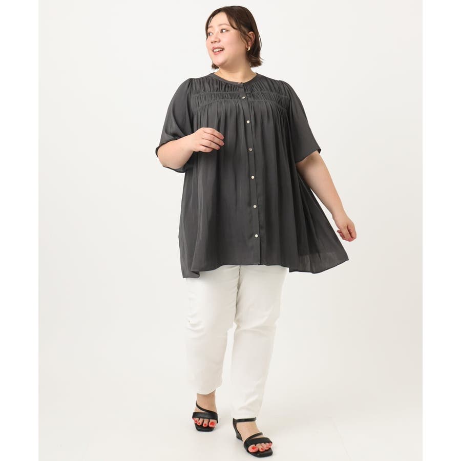 さらっとした落ち感が心地よい合繊素材に、胸元にゴムシャーリングを2段入れたトレンドディテールブラウス。