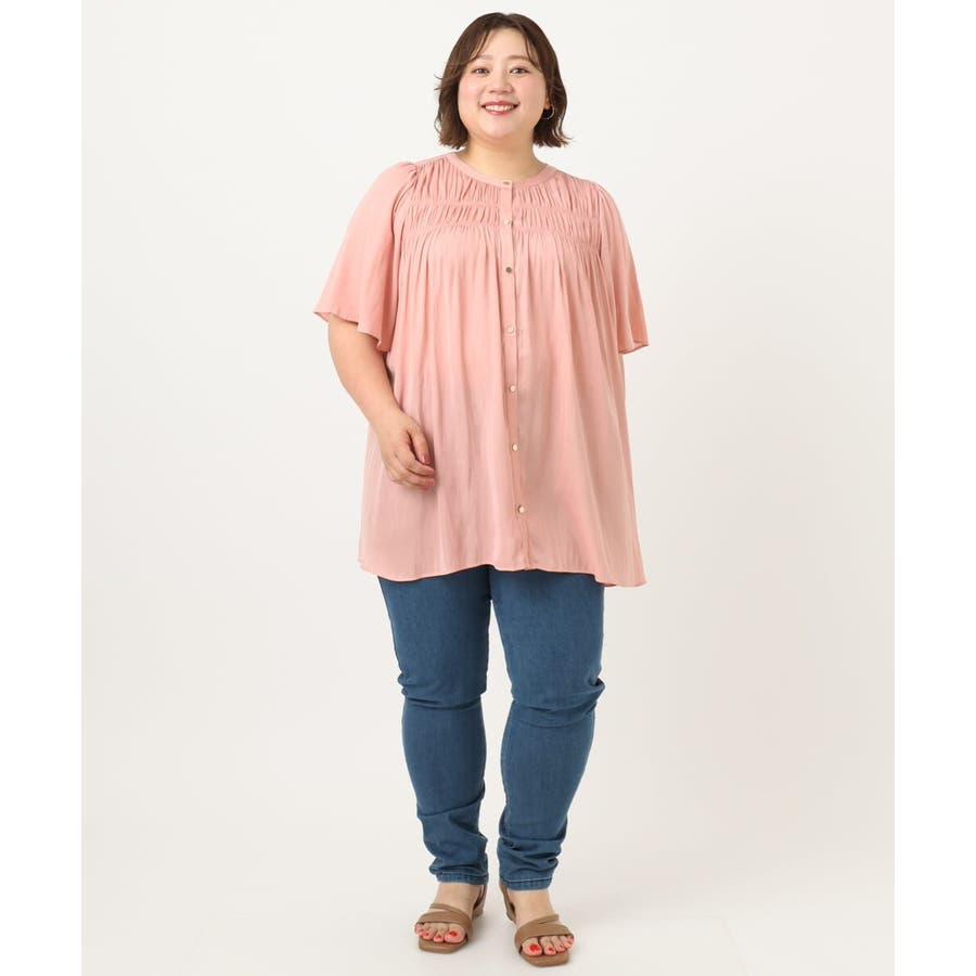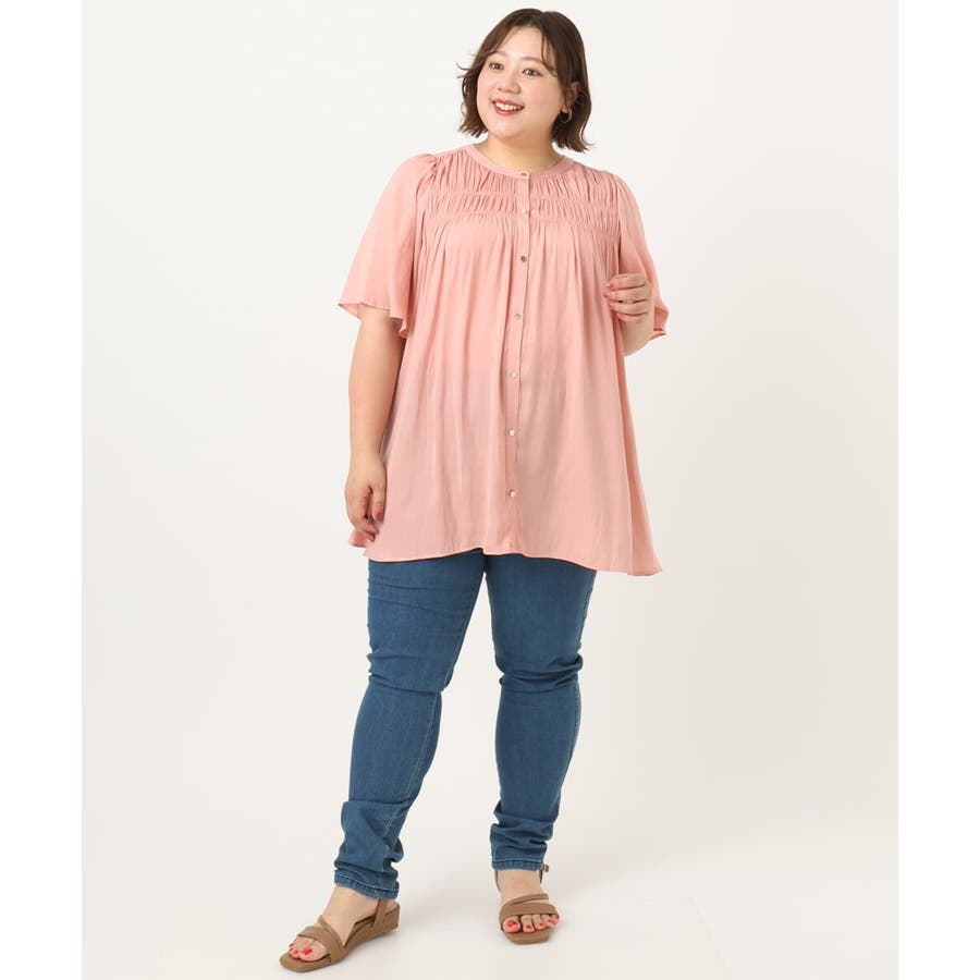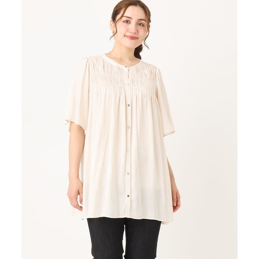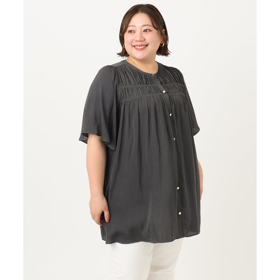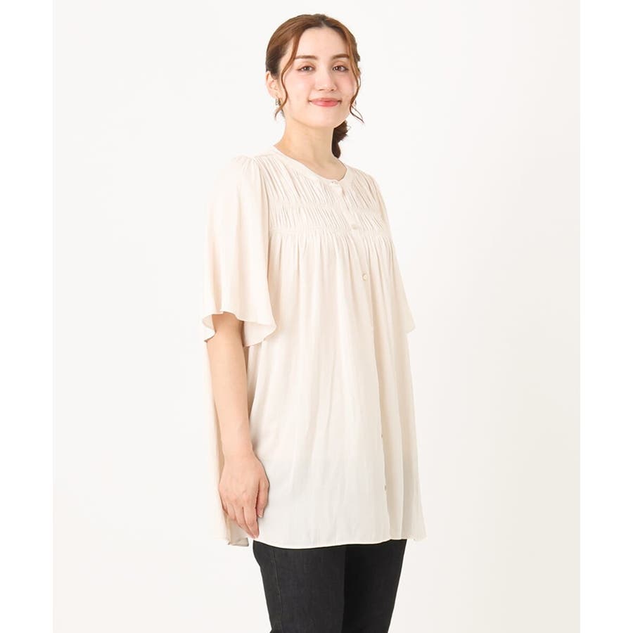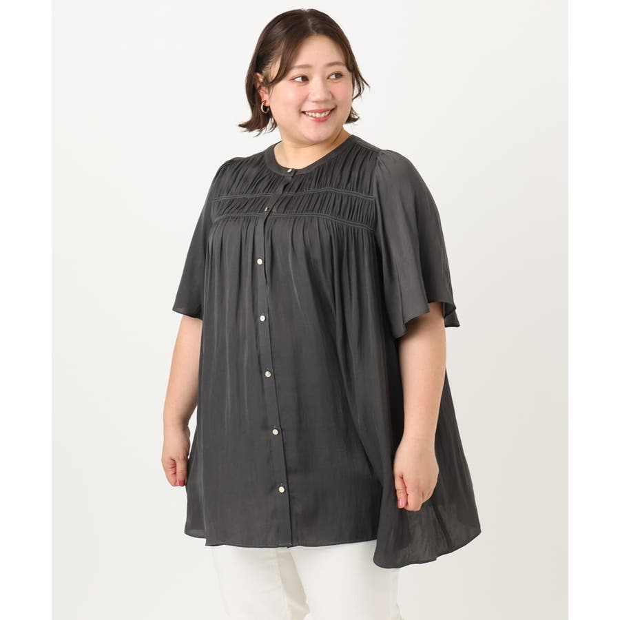 さらっとした落ち感が心地よい合繊素材に、胸元にゴムシャーリングを2段入れたトレンドディテールブラウス。