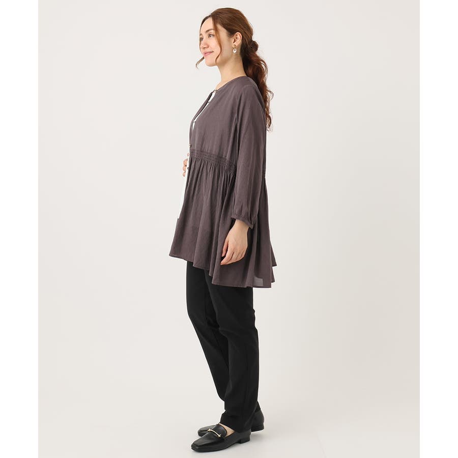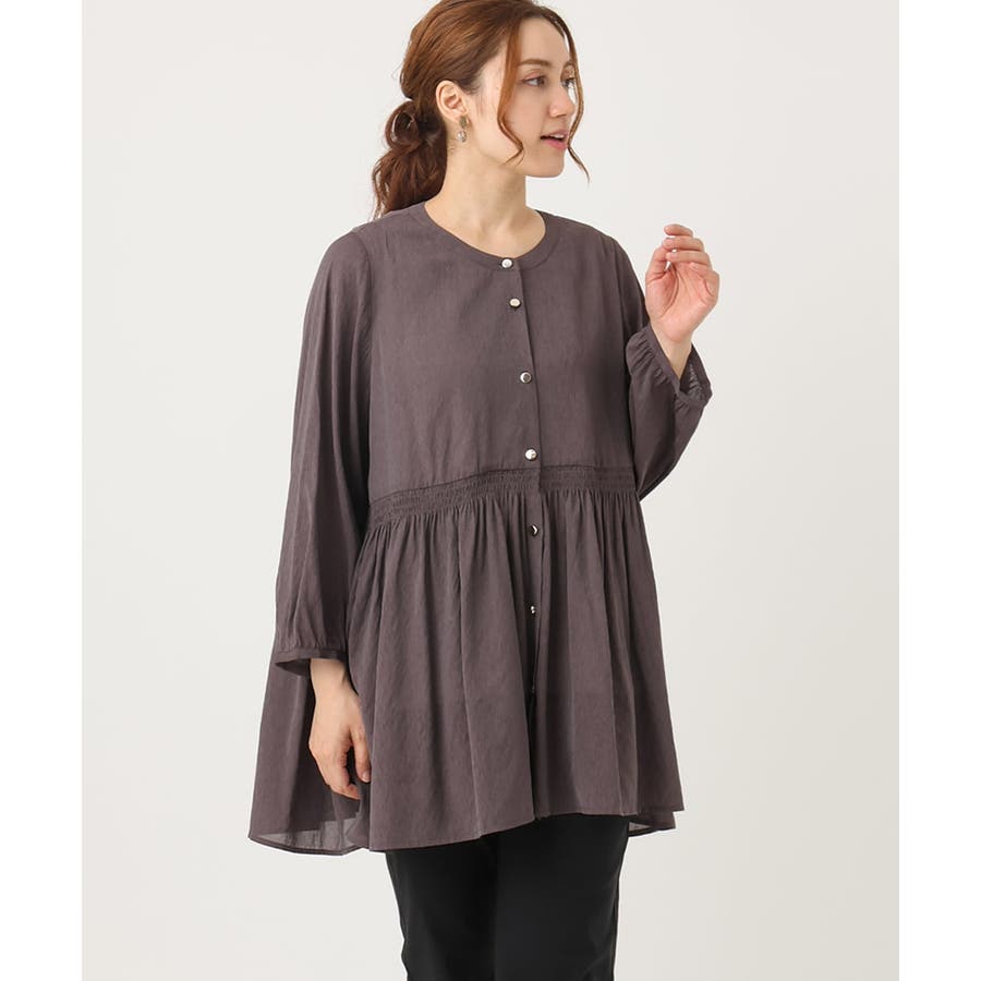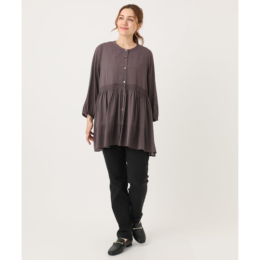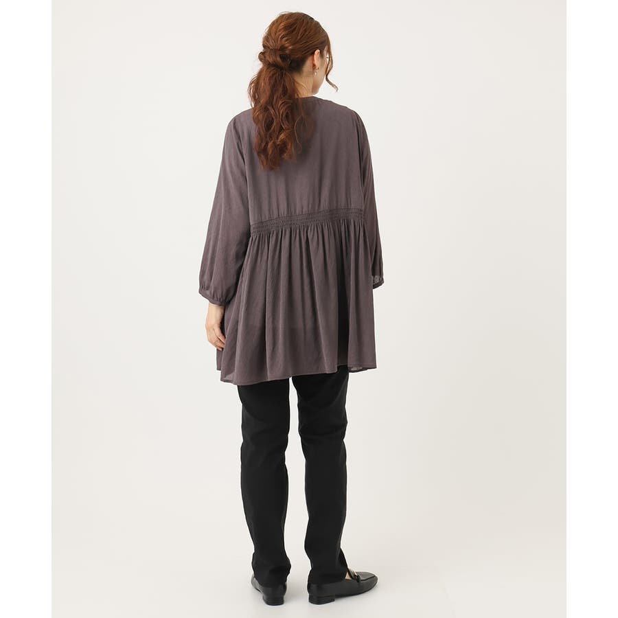 トレンドのシャーリングディテールの入ったチュニックブラウス。