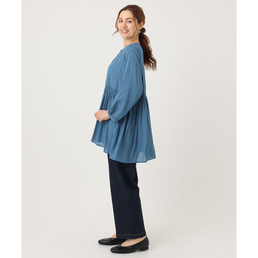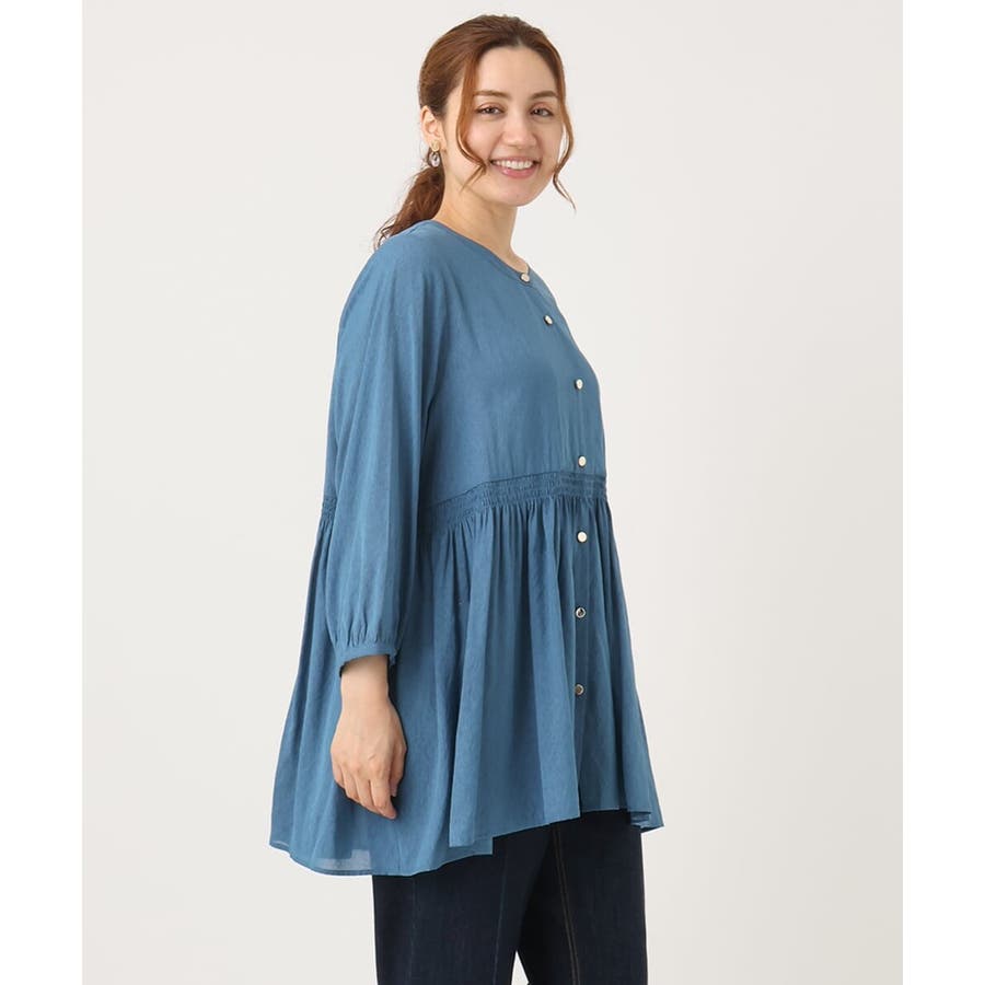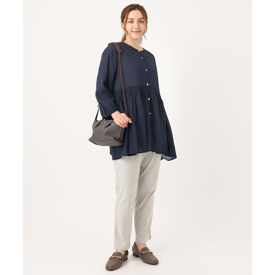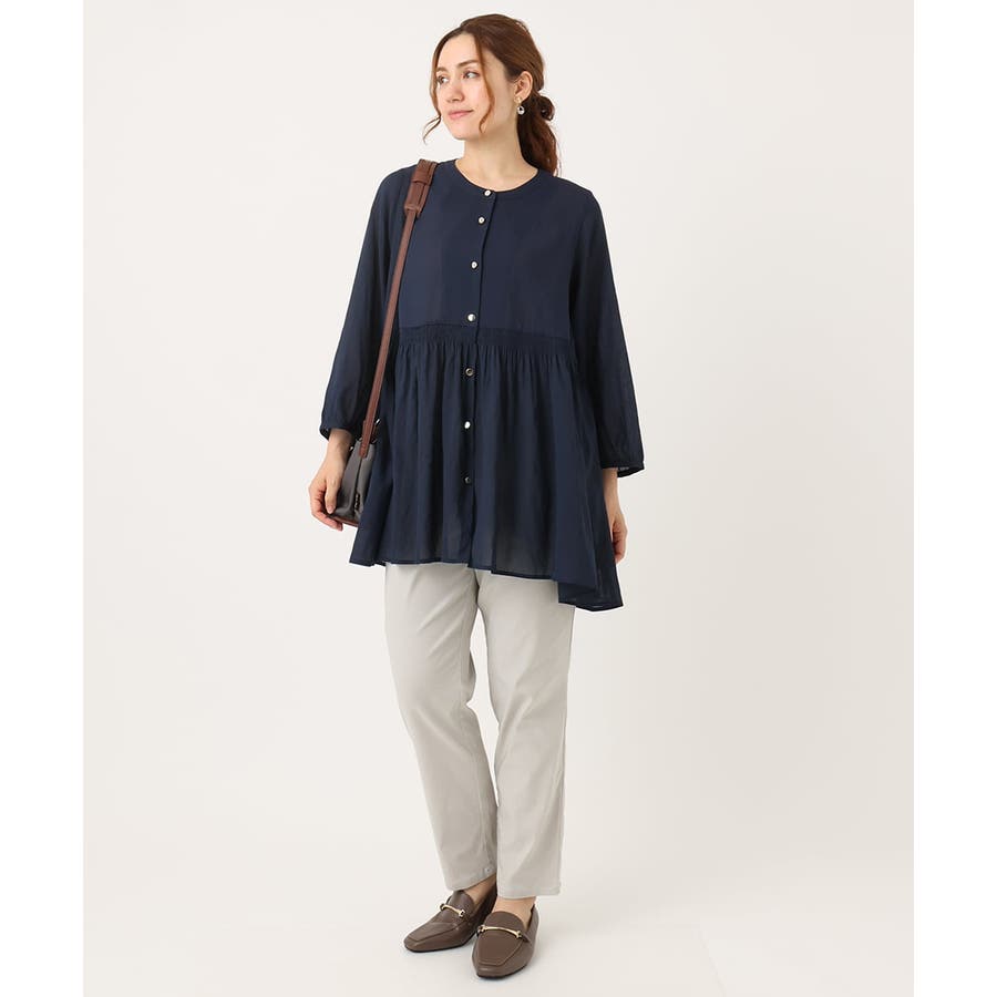 トレンドのシャーリングディテールの入ったチュニックブラウス。