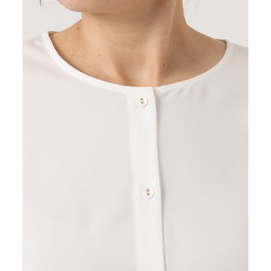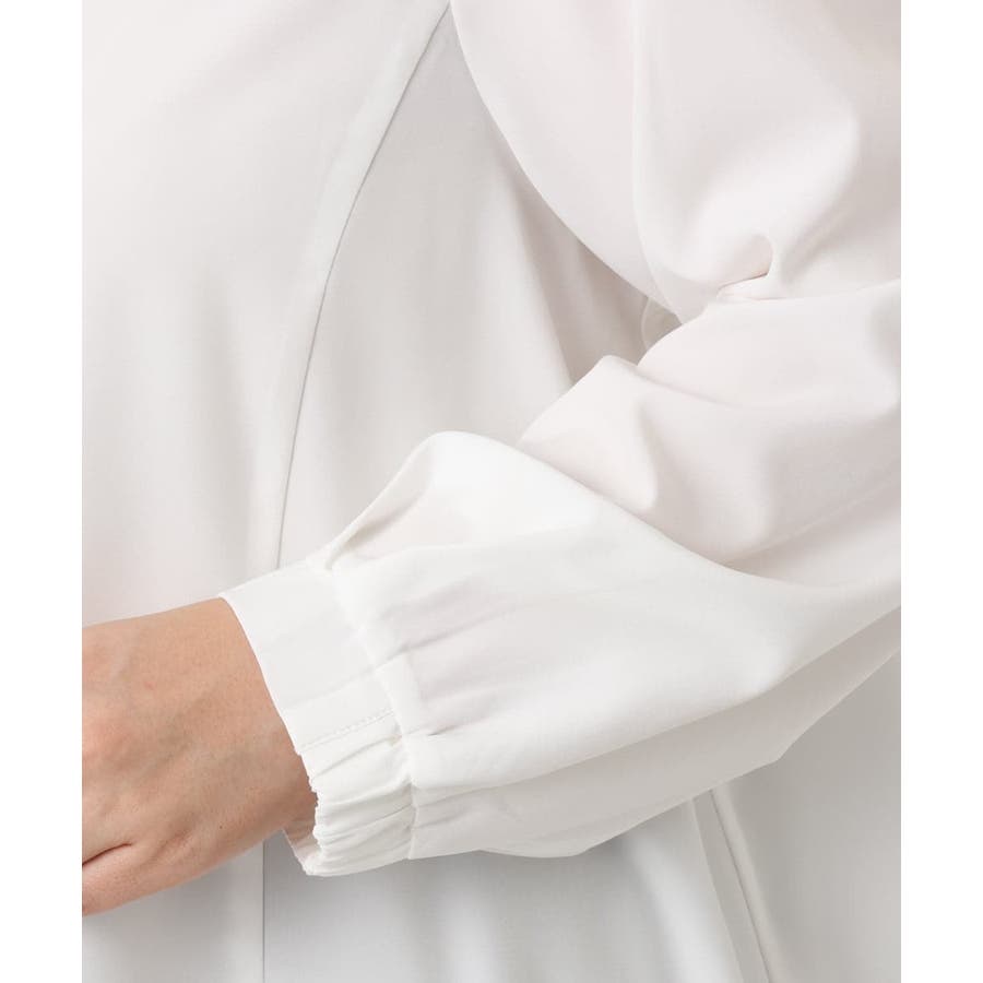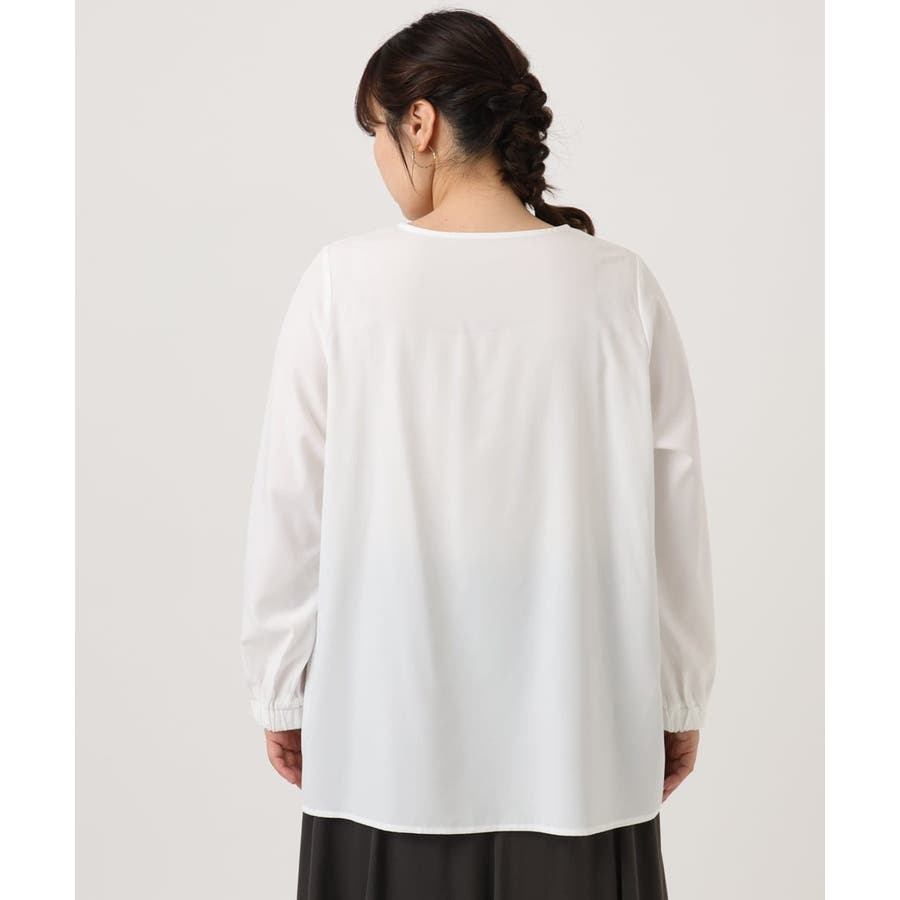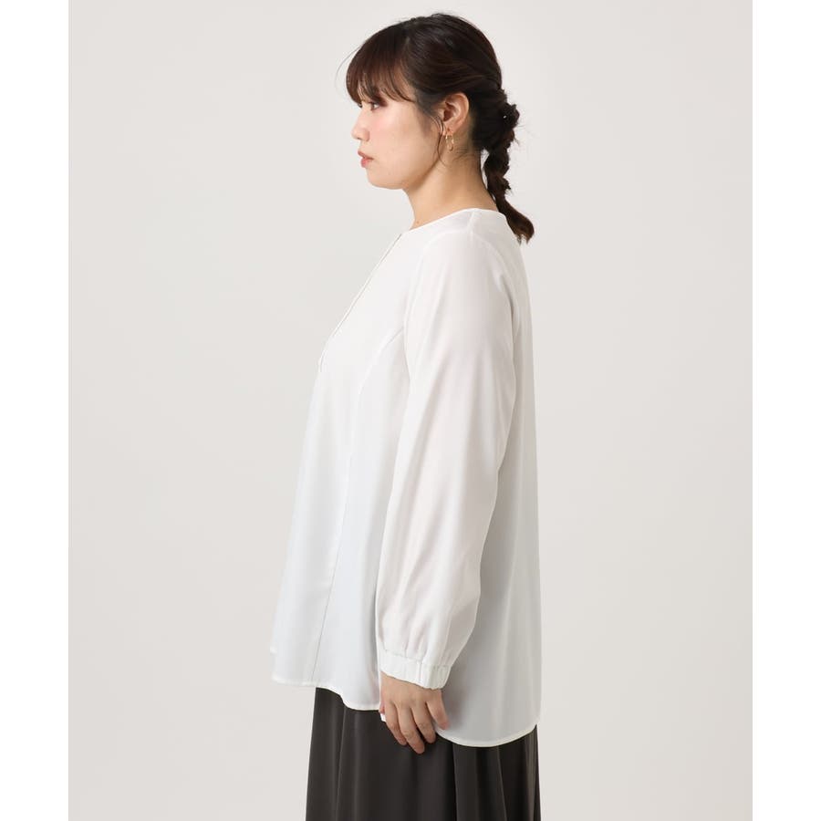 ブラウスは腰回りがカバーできる着丈なのでパンツでもスカートでもすっきり合わせられます。
