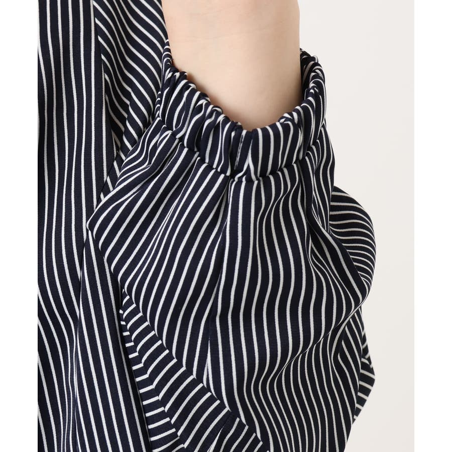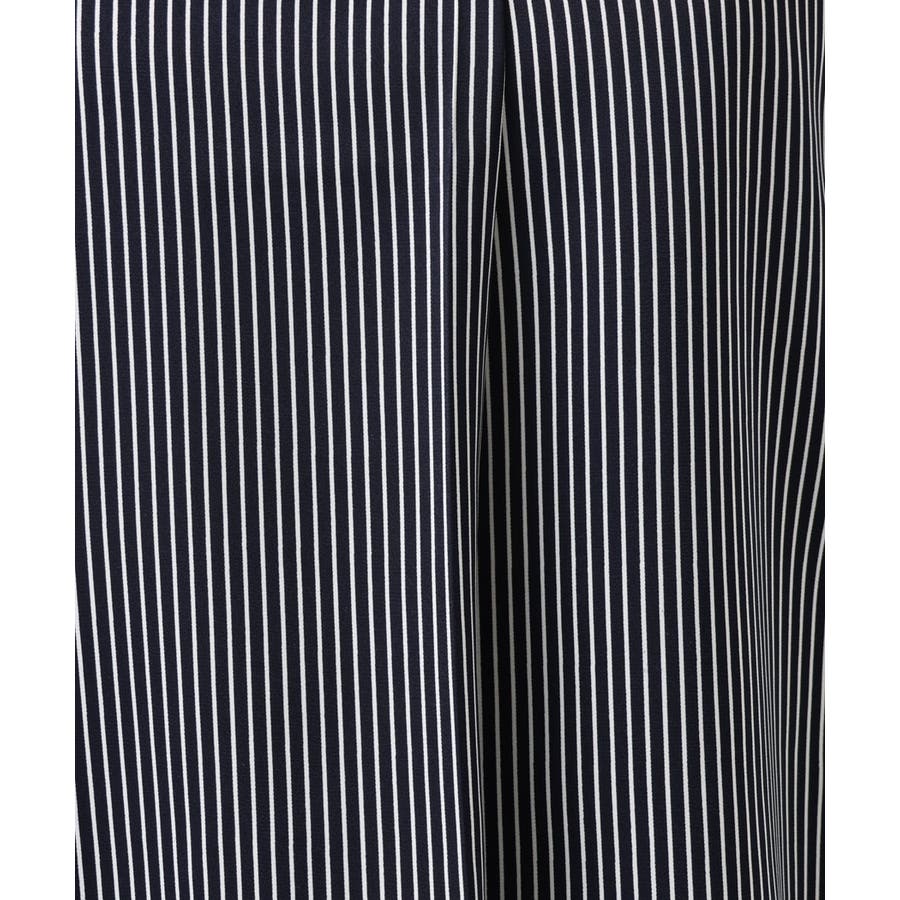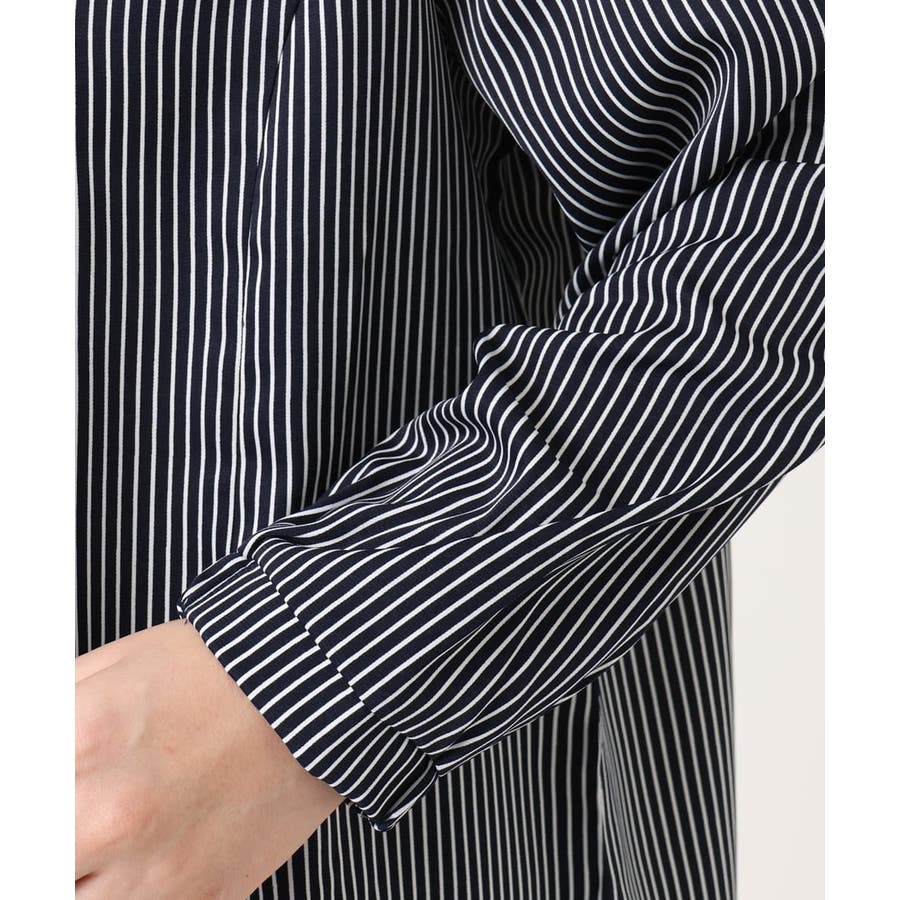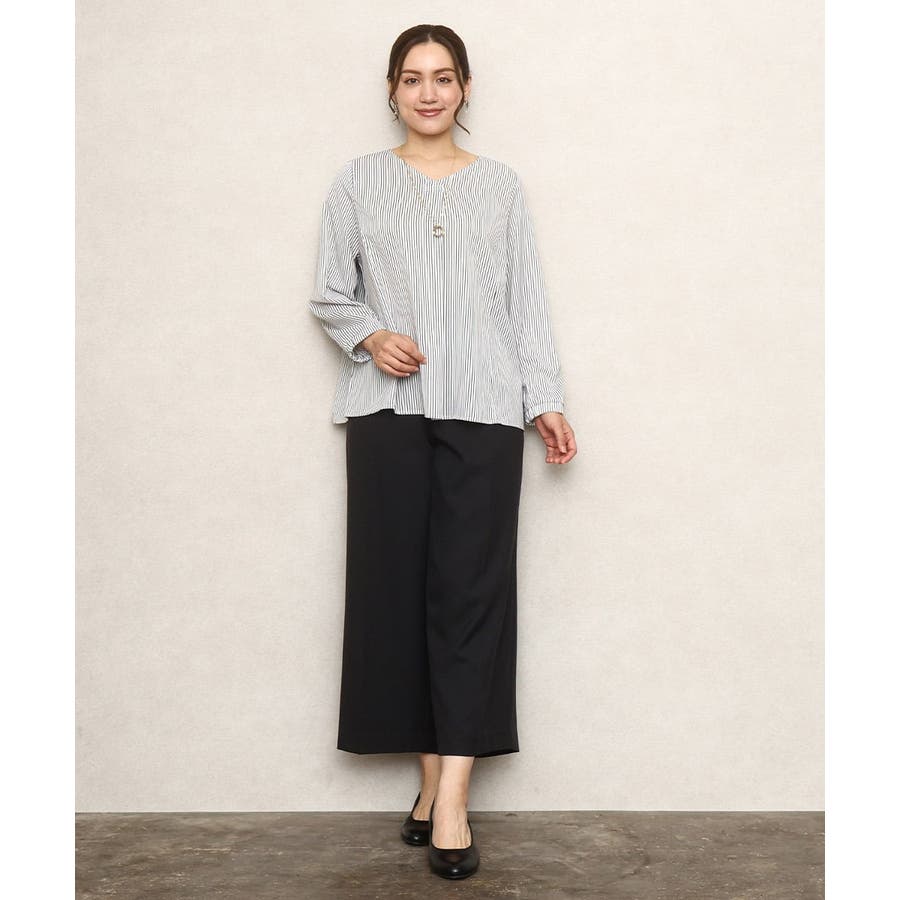 ペンシルなストライプの合繊生地はジャケットのインナーとしても、1枚着のブラウスとしてもすっきり決まります。
