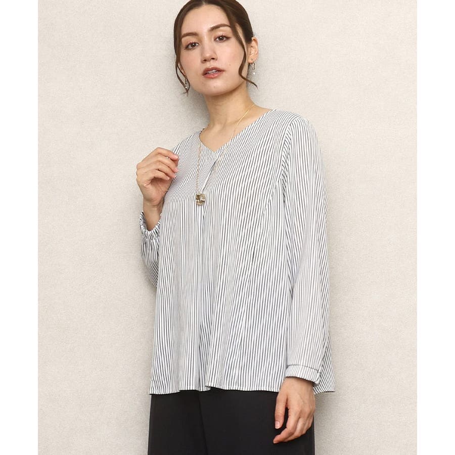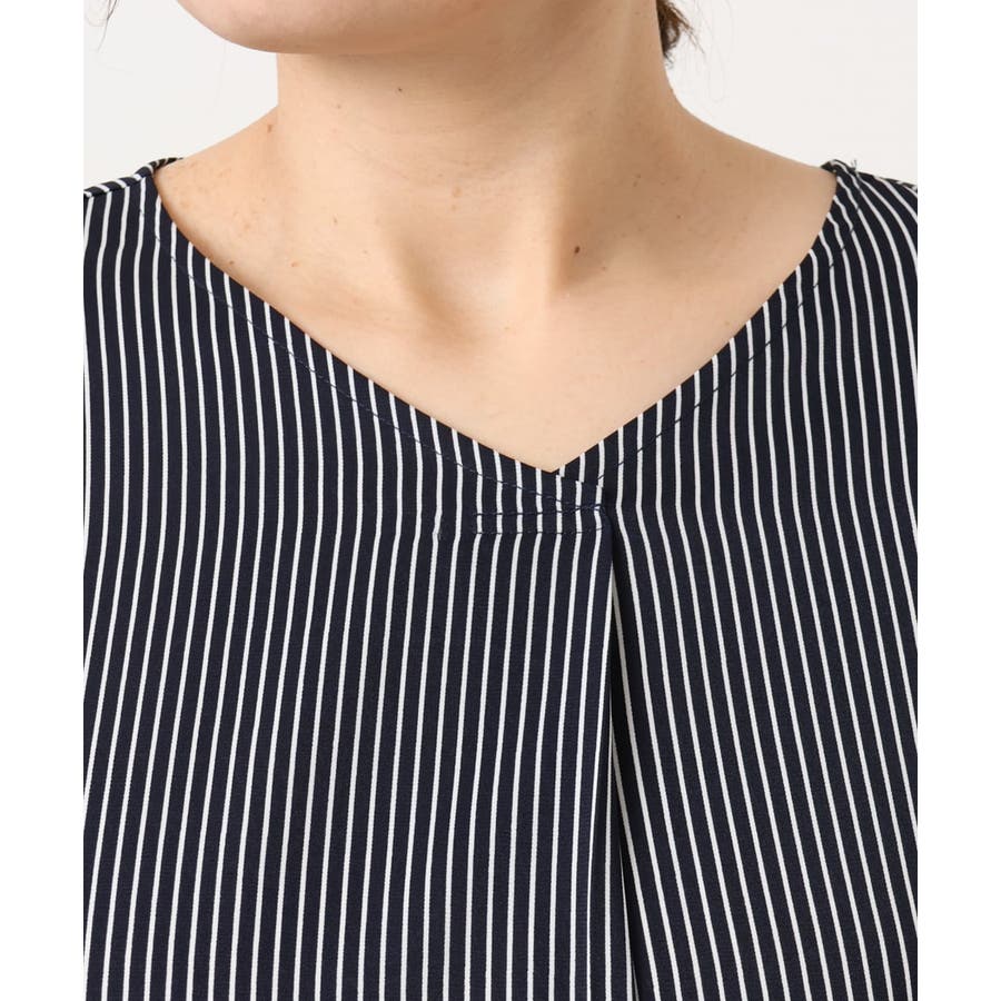 ベーシックなストライプ柄のVネックブラウス。