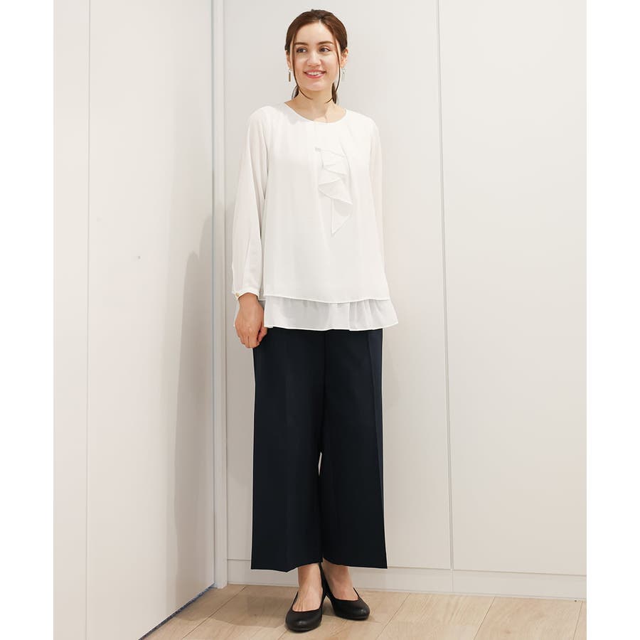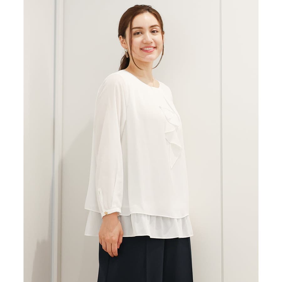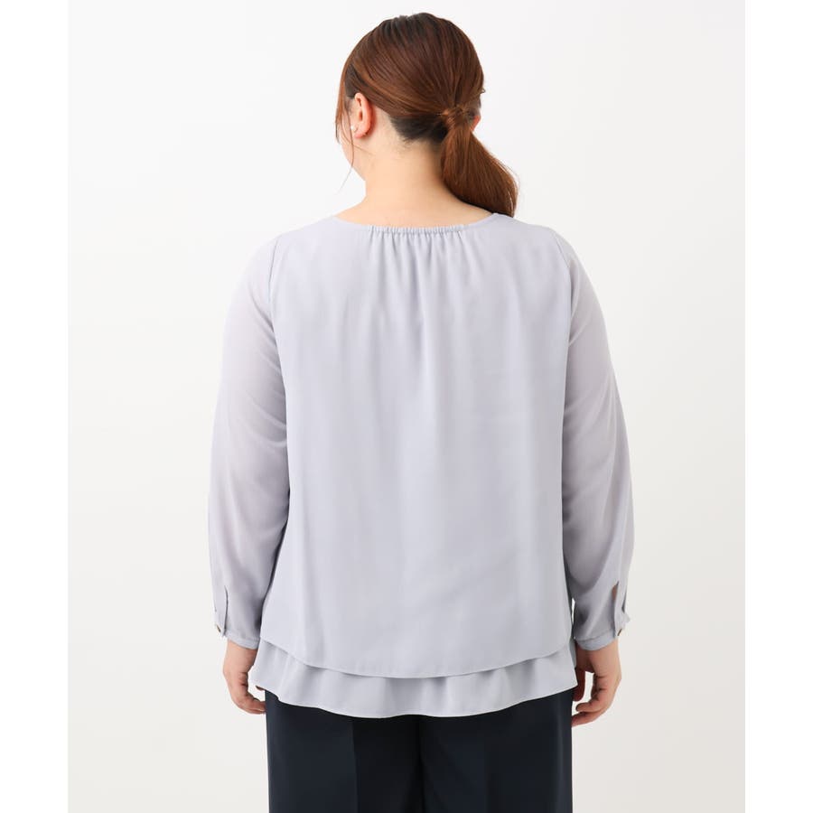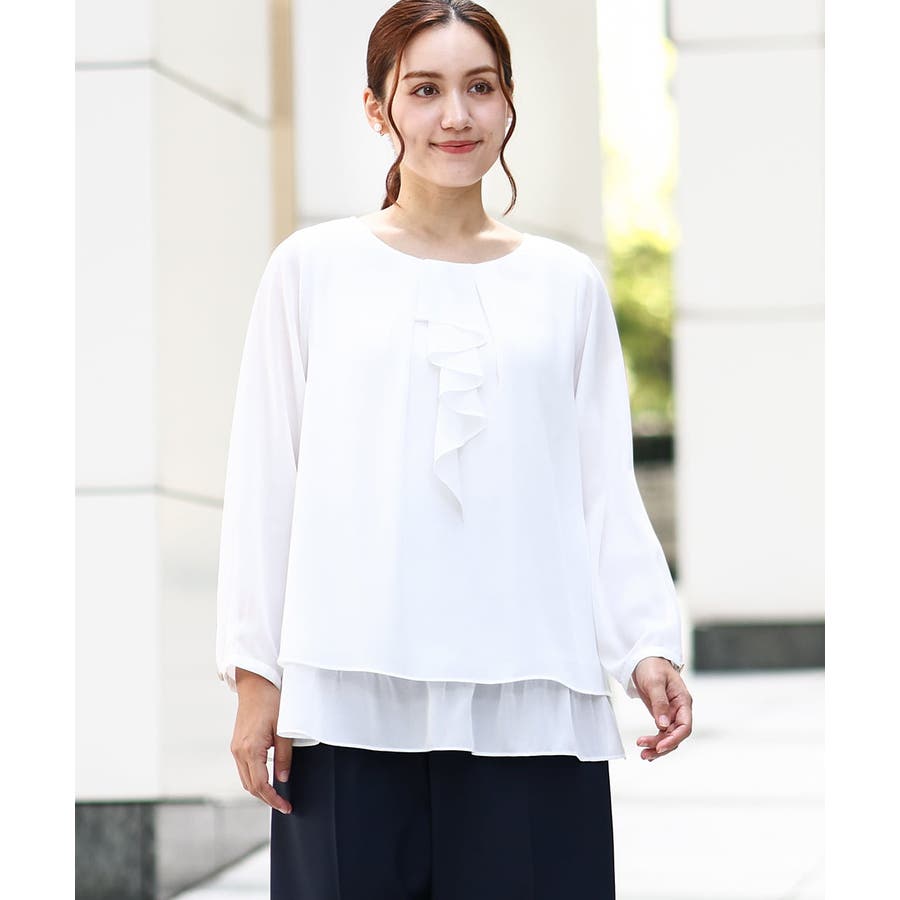 裾は2段のレイヤードになっており、1段をボトムインすることでジャケットを羽織っても表からブラウスが見えずすっきりご着用いただけます。