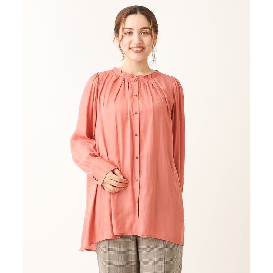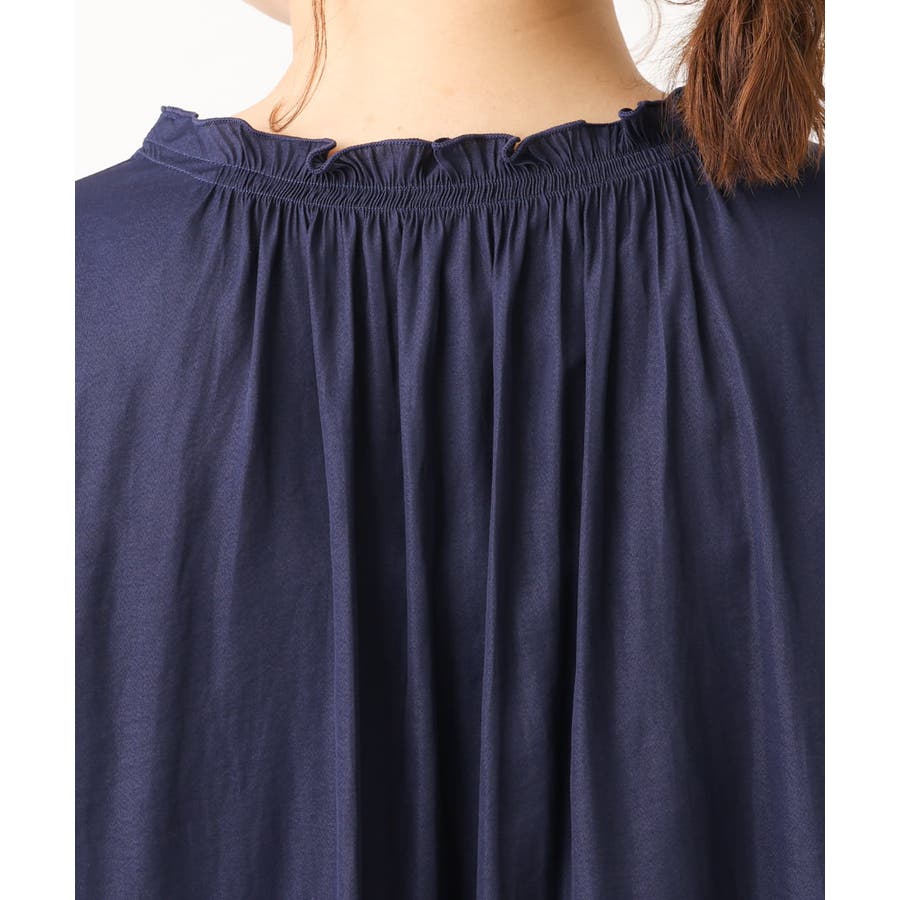 肩周りを華奢にみせる細かなギャザーを袖つけに入れ、ターンバックできる長めカフスがかわいいデザインです。