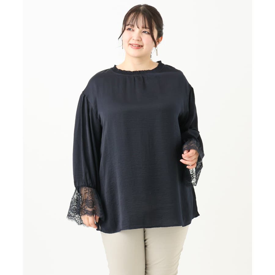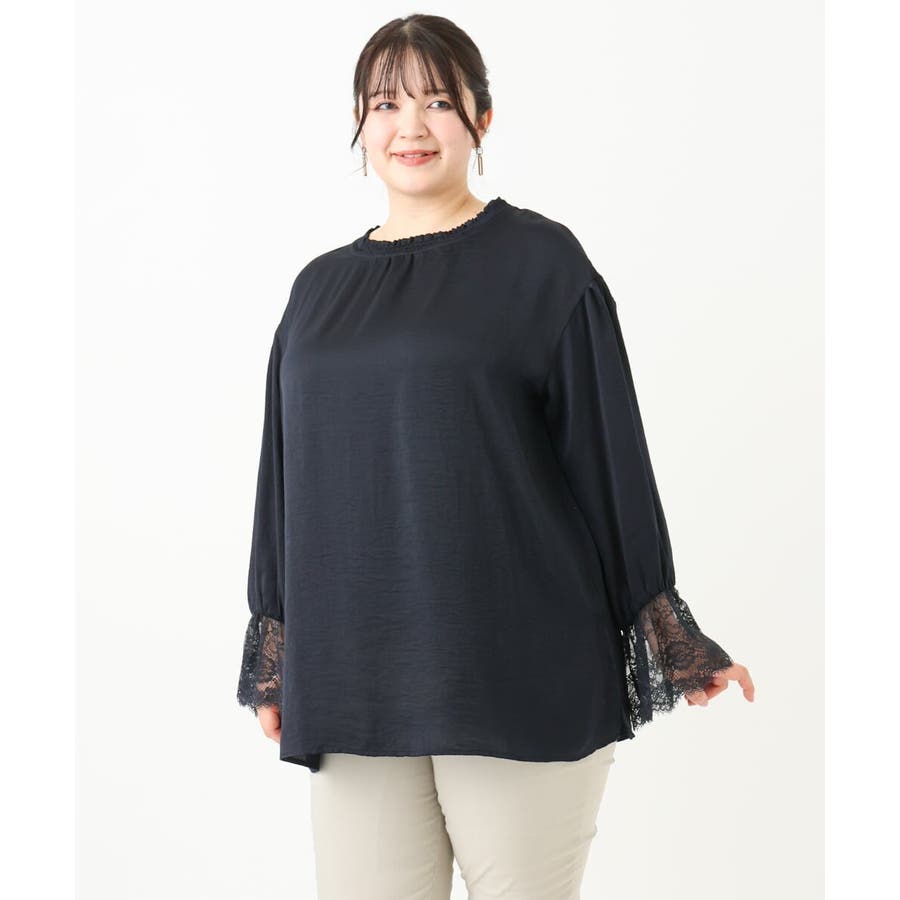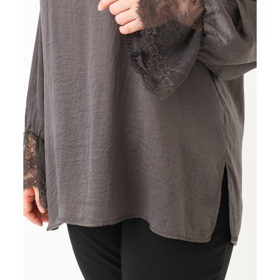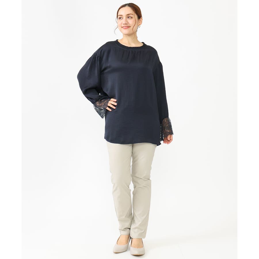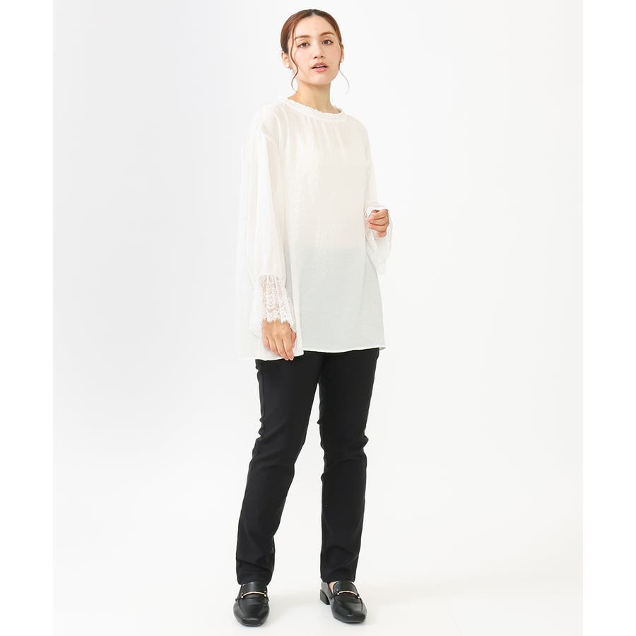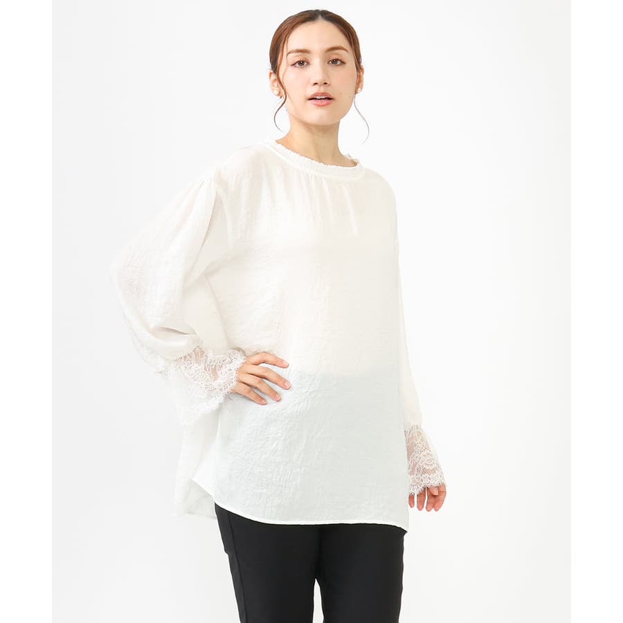 袖口に配した繊細なレースが大人可愛いブラウス。