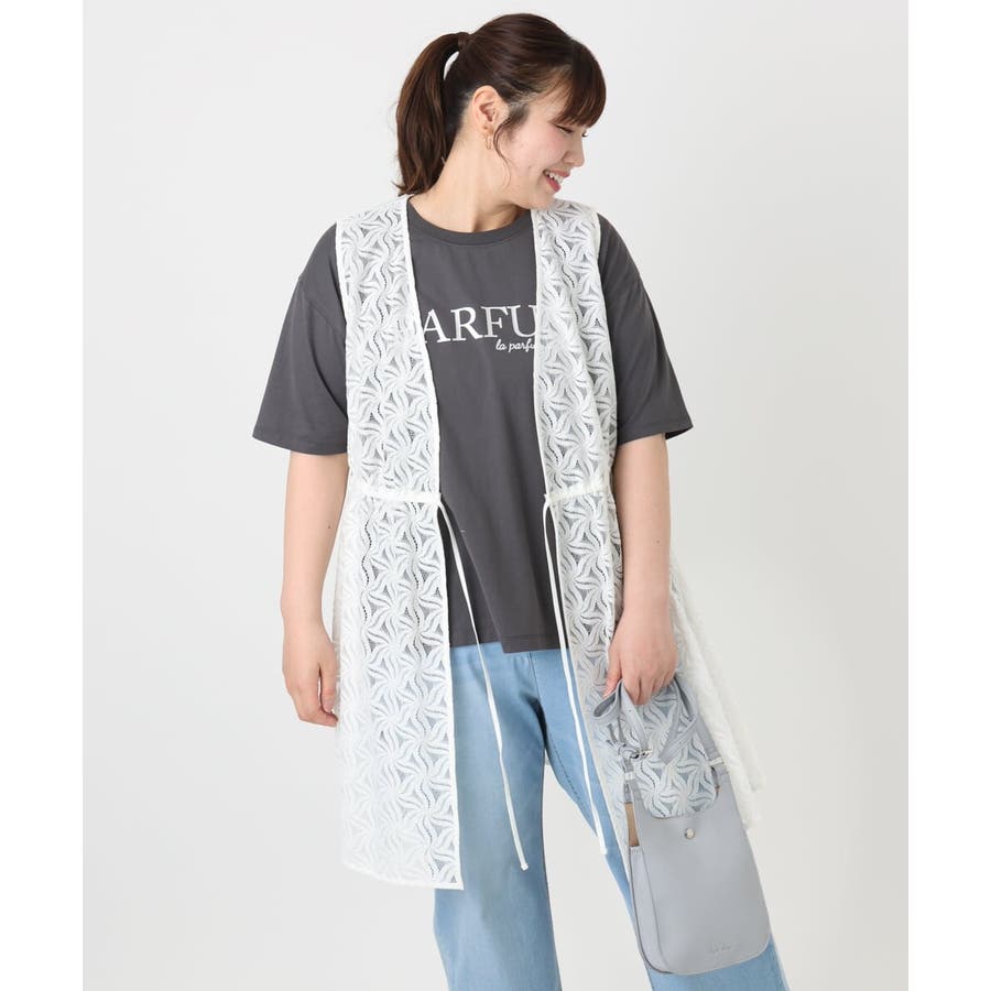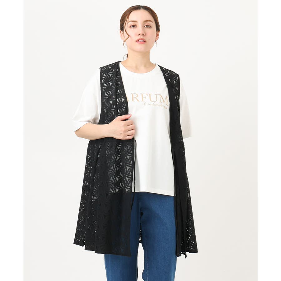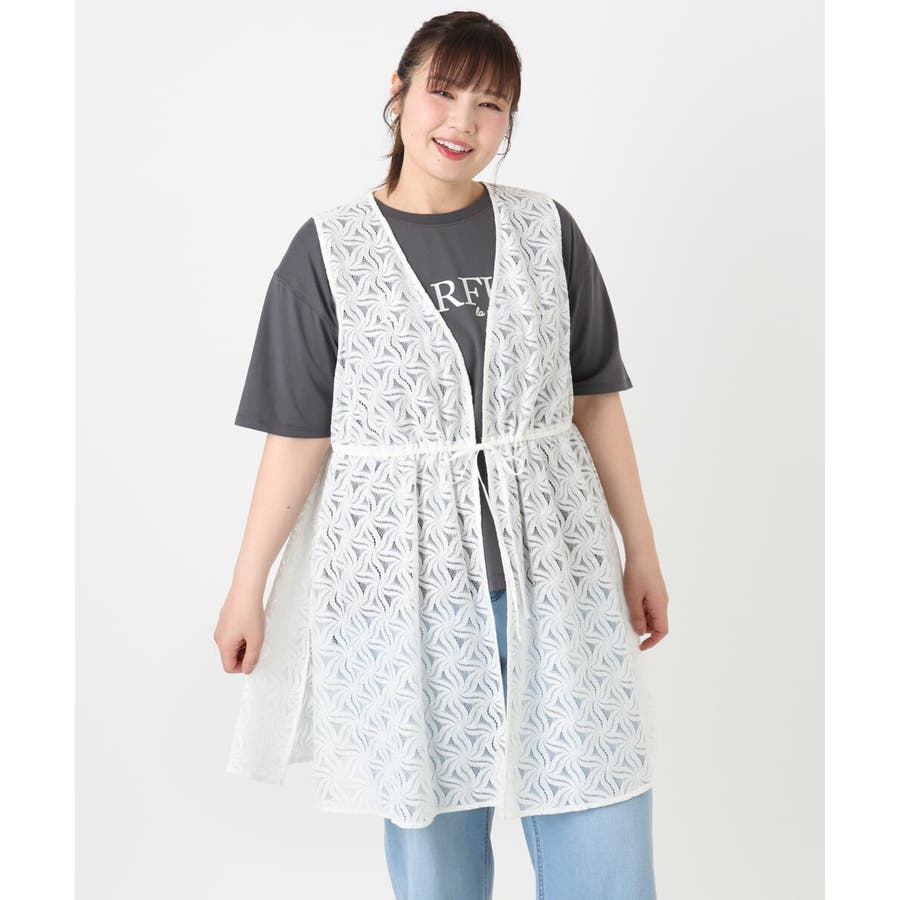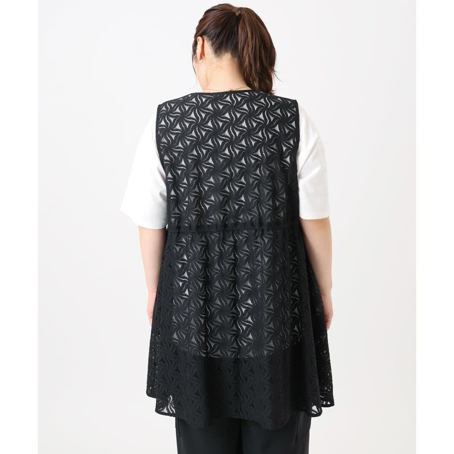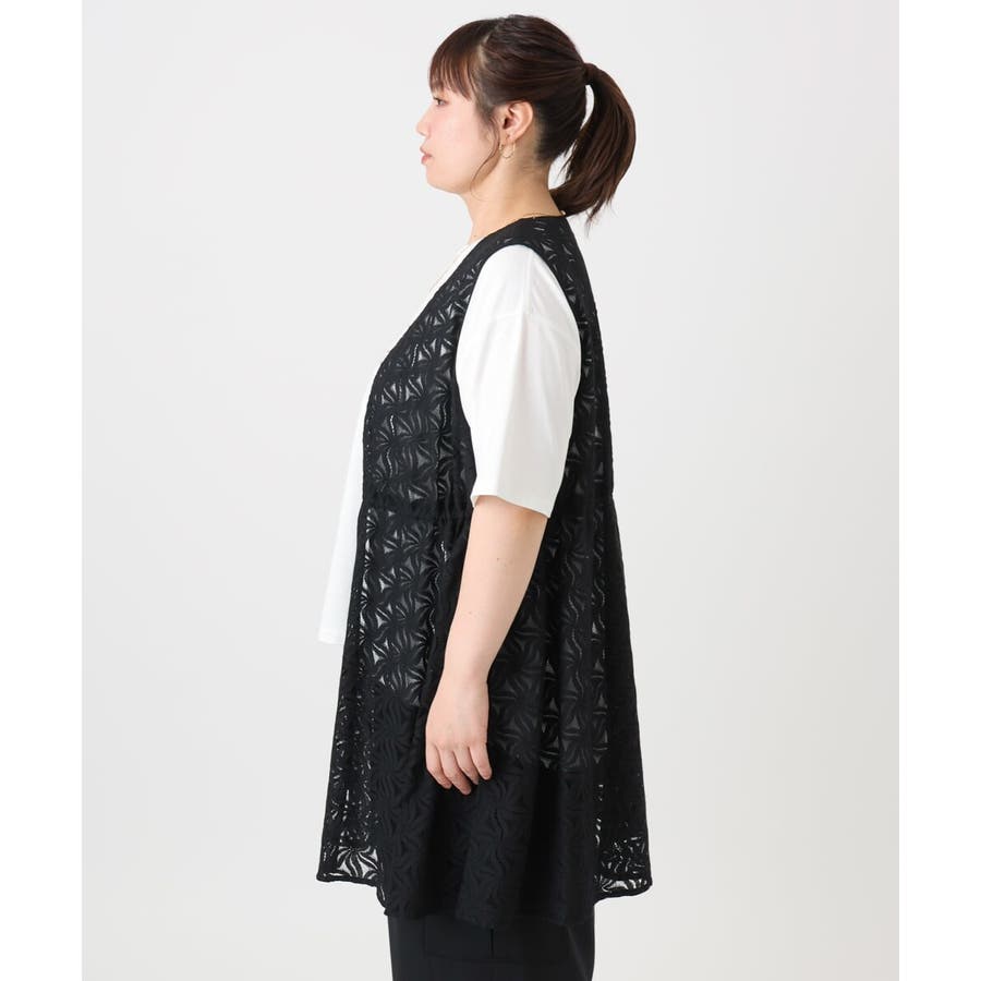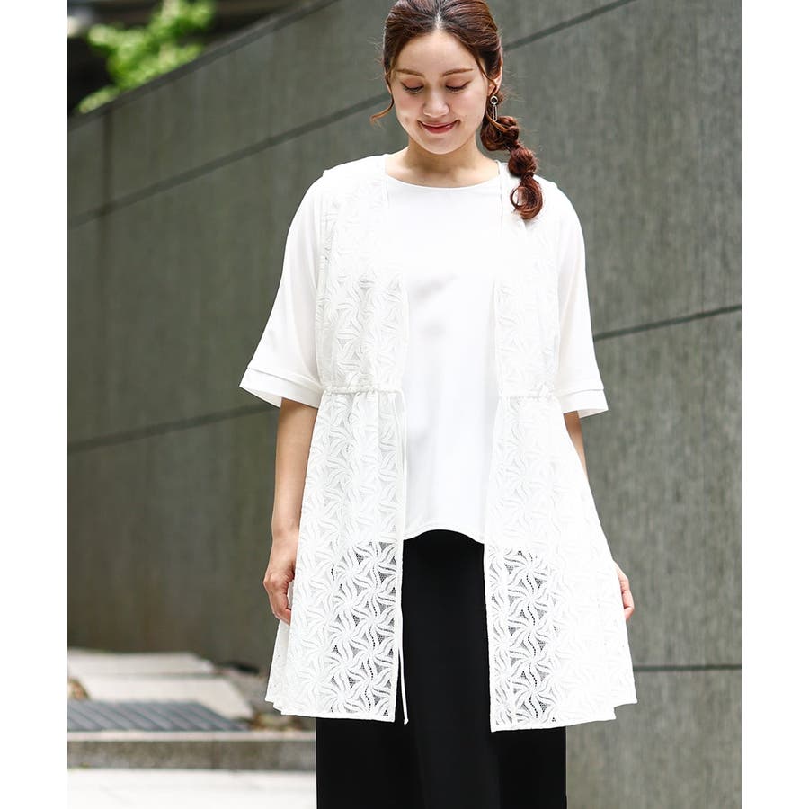 トレンドのレース生地を使用した長め丈のジレ。