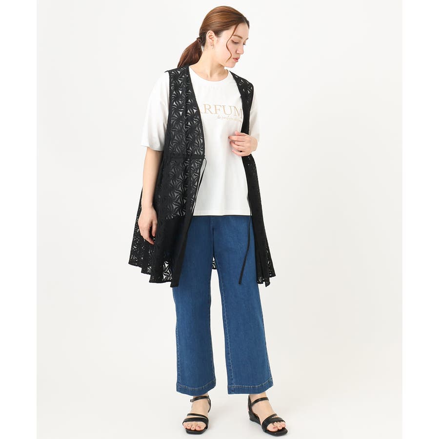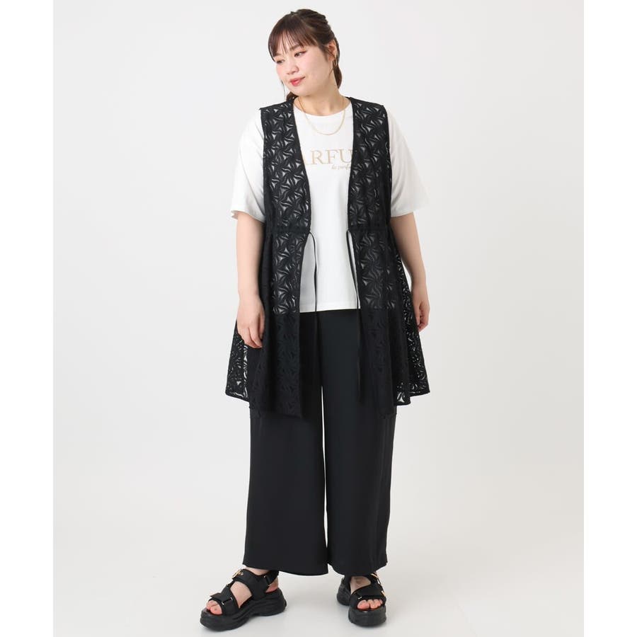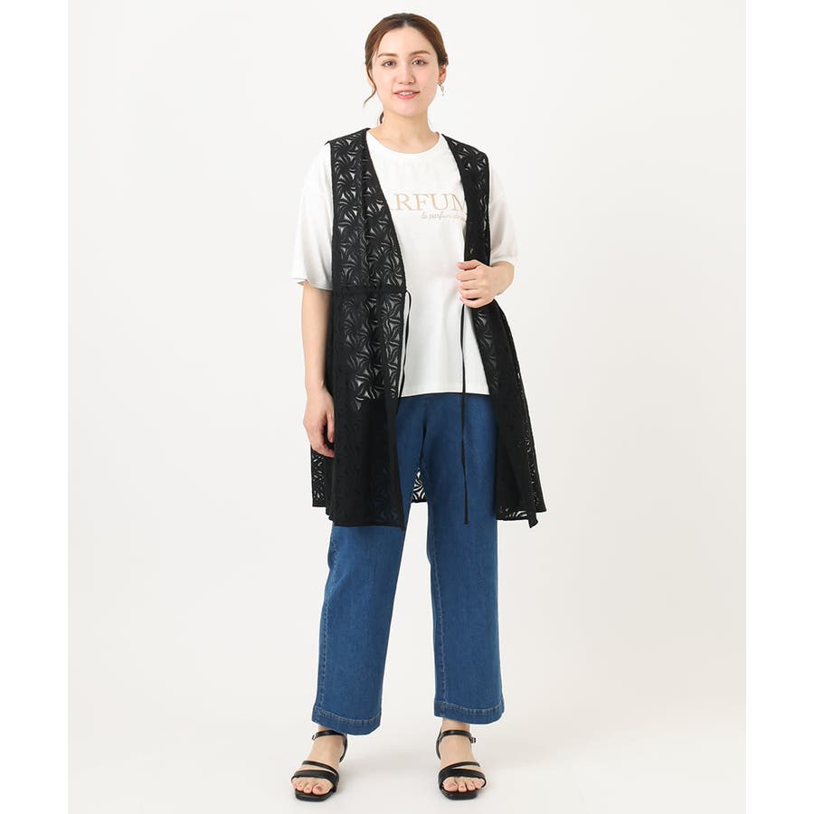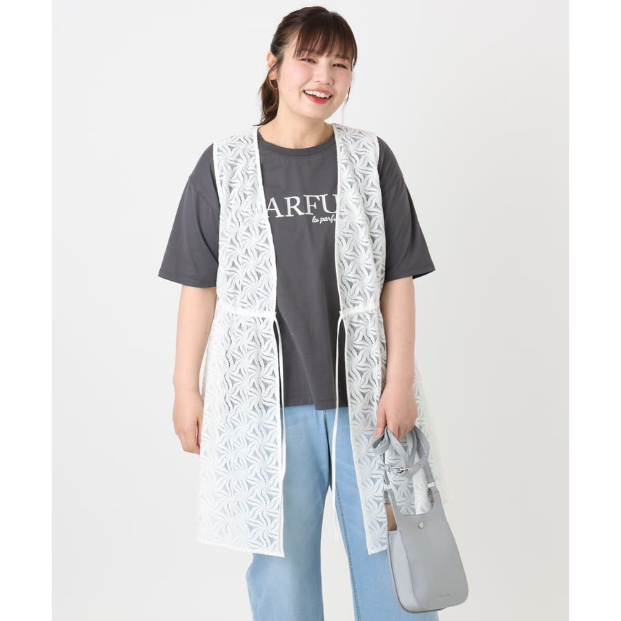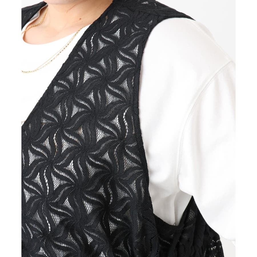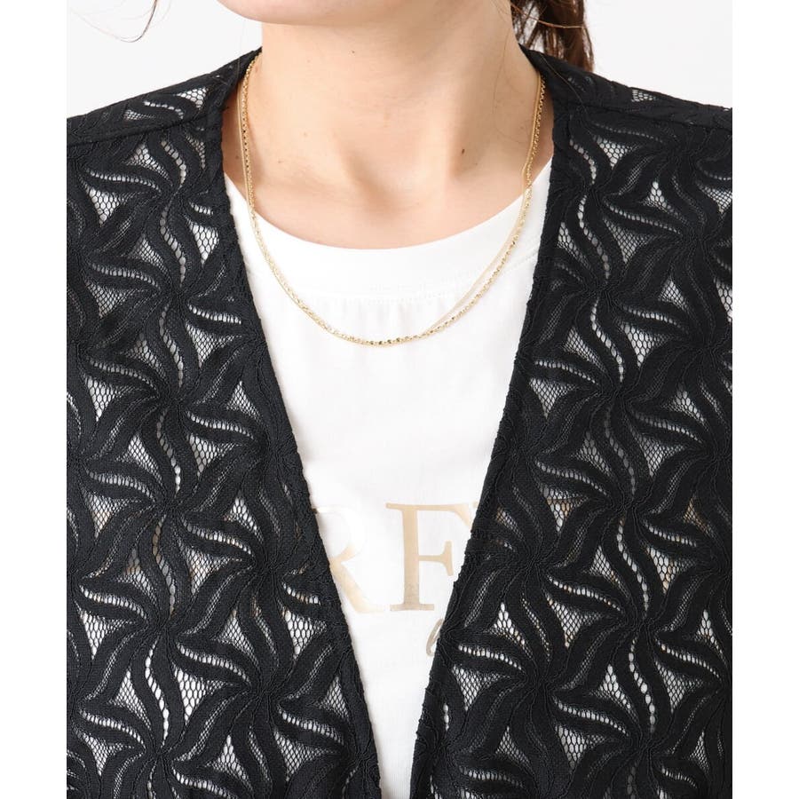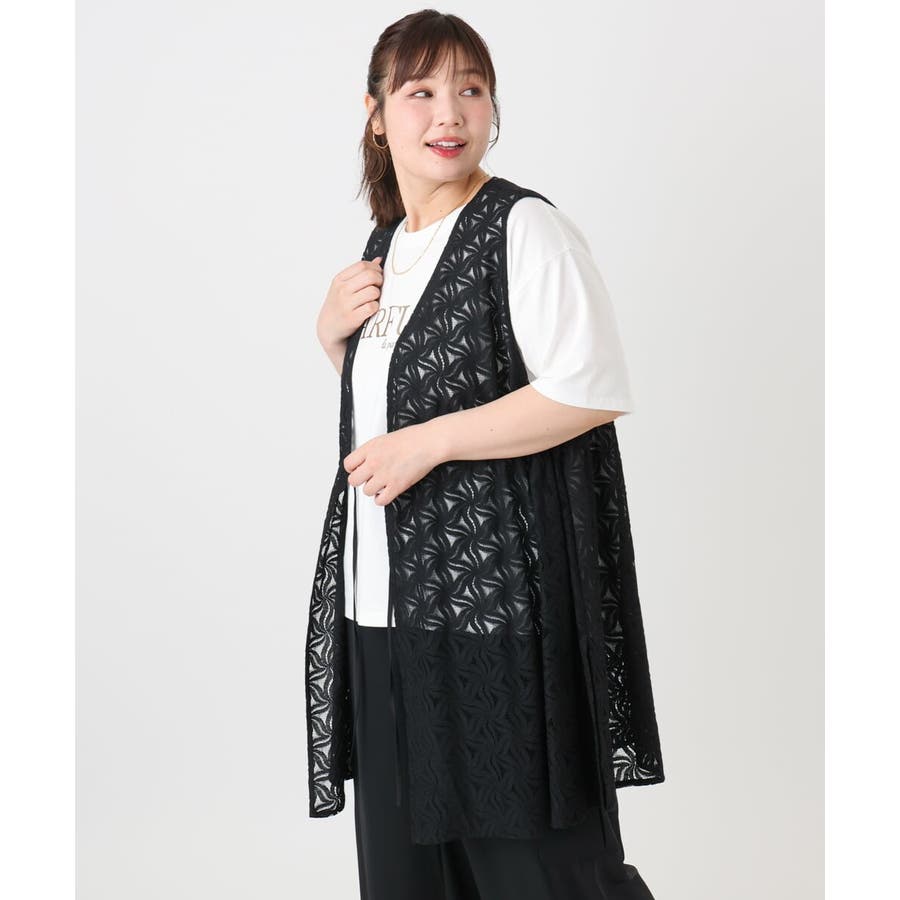 トレンドのレース生地を使用した長め丈のジレ。