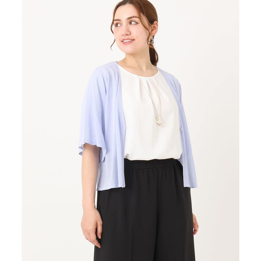さりげなくきらめく同色の控えめなラメ感がきれいなハーフスリーブボレロカーディガン。