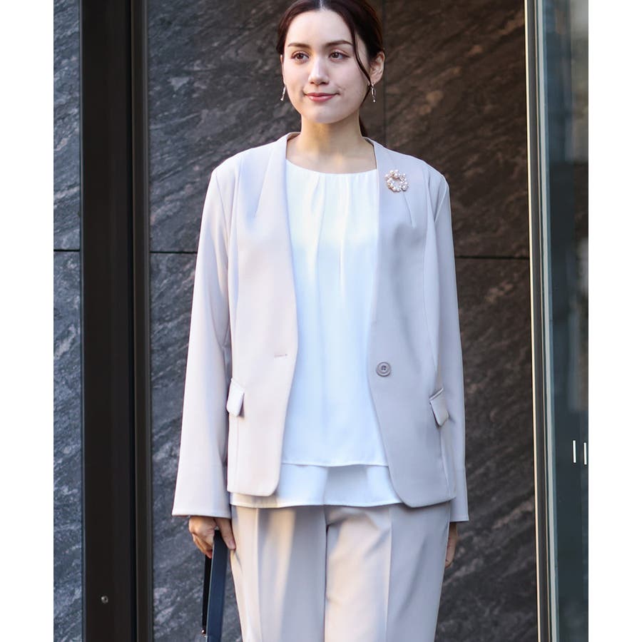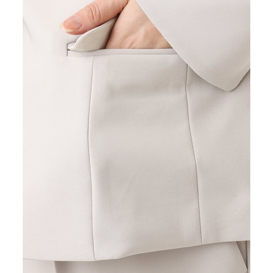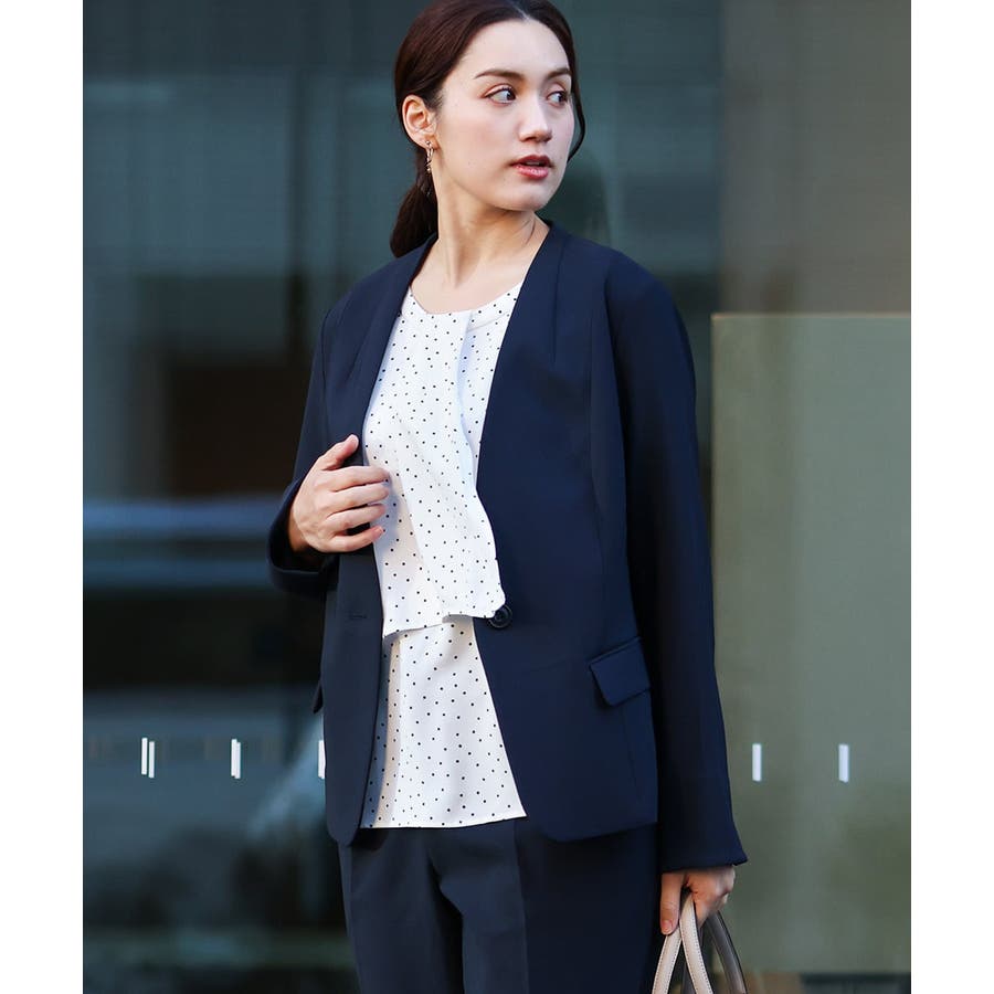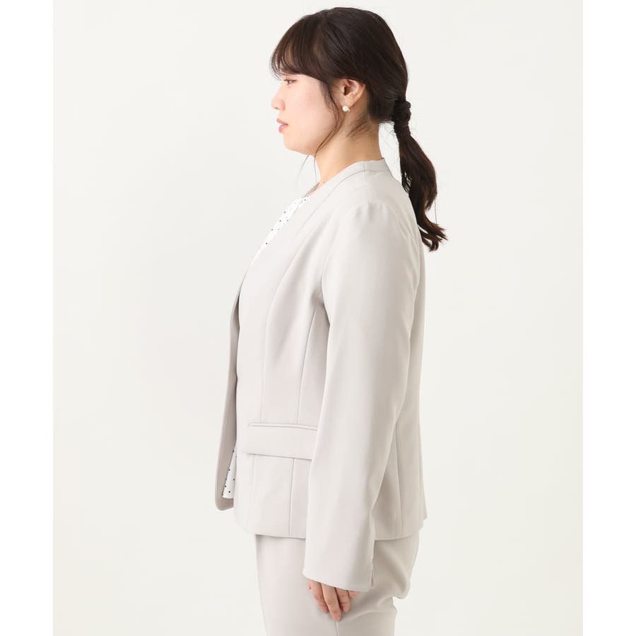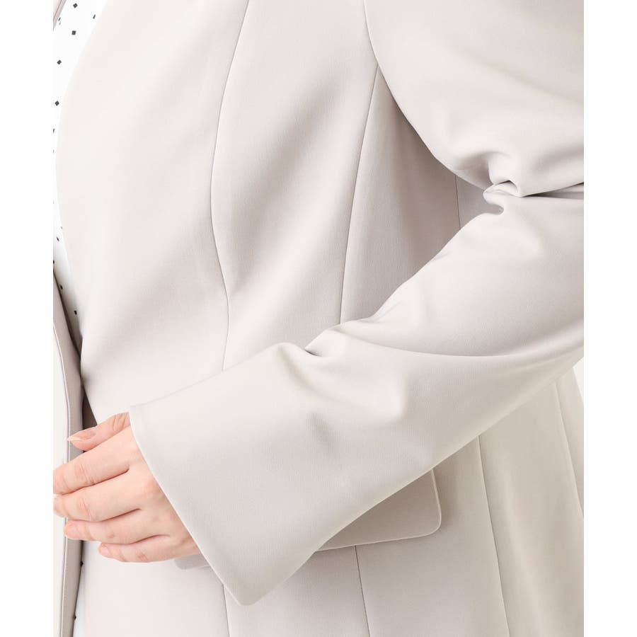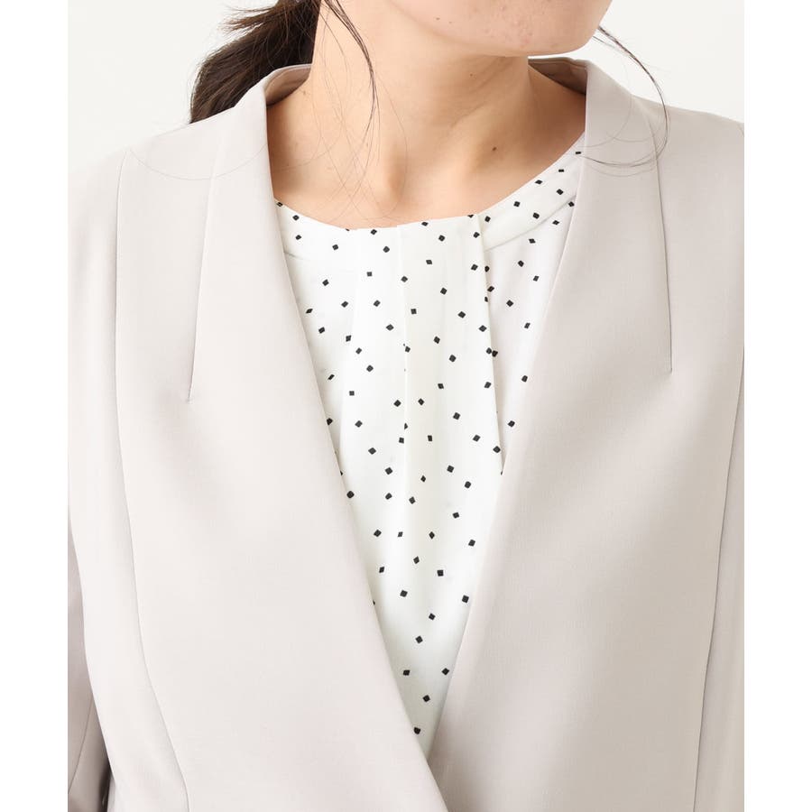 後ろ衿を少し立ち上げ、Vネックラインで胸元をすっきり見せるノーカラーデザインなのでワンピース合わせもパンツ合わせも女性らしくスッキリと決まります。
