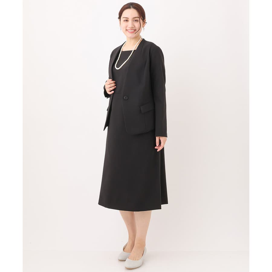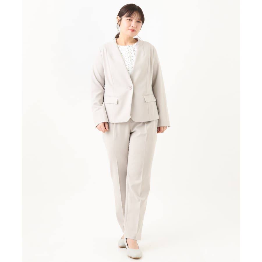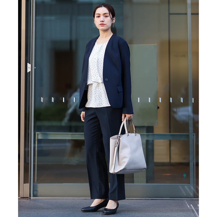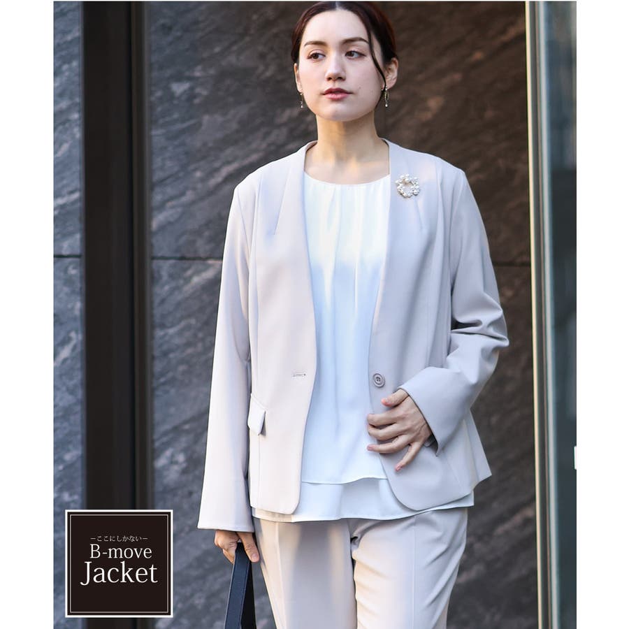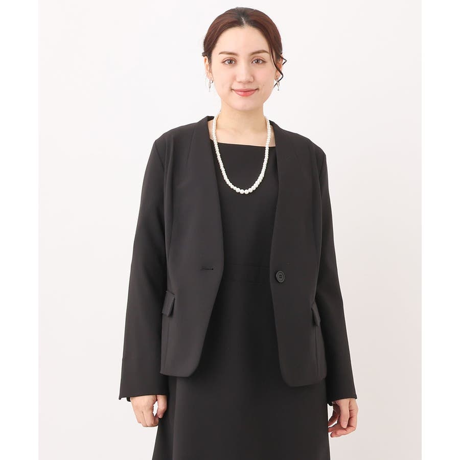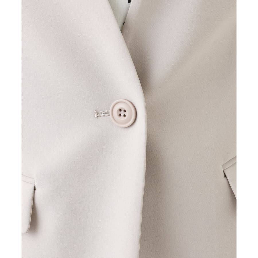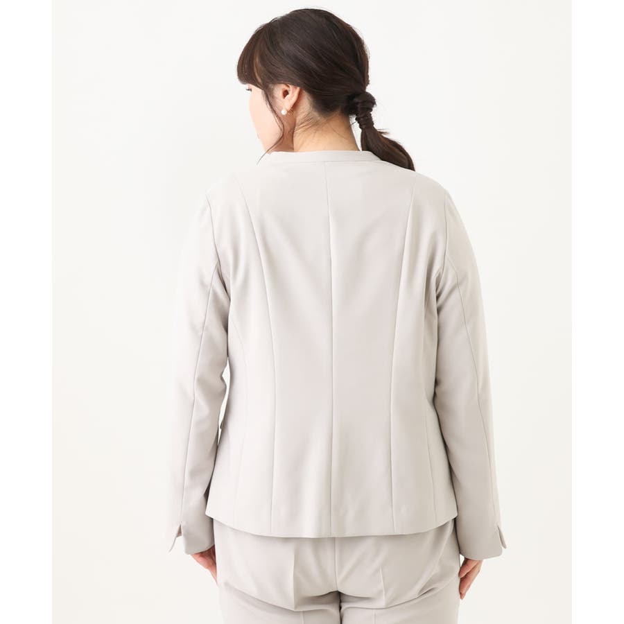 後ろ衿を少し立ち上げ、Vネックラインで胸元をすっきり見せるノーカラーデザインなのでワンピース合わせもパンツ合わせも女性らしくスッキリと決まります。