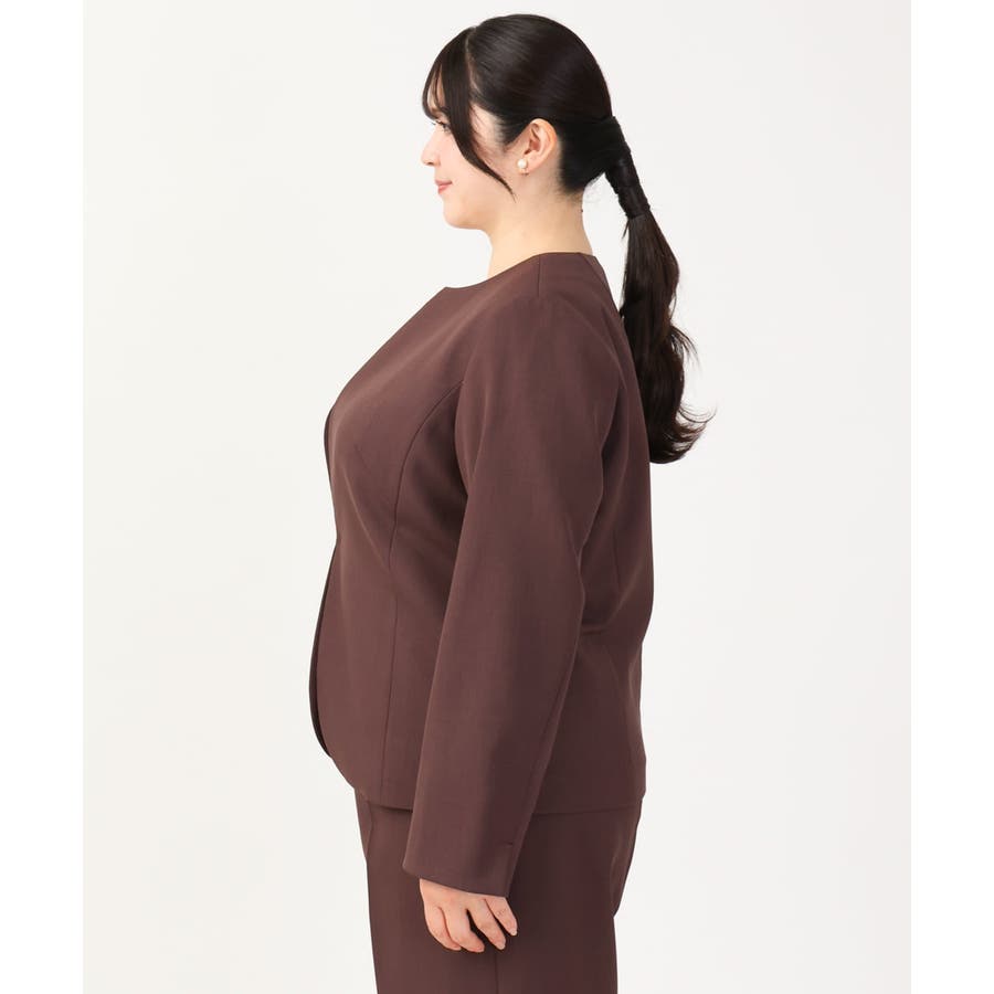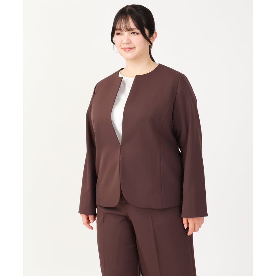 すっきり前ホックのノーカラージャケット。