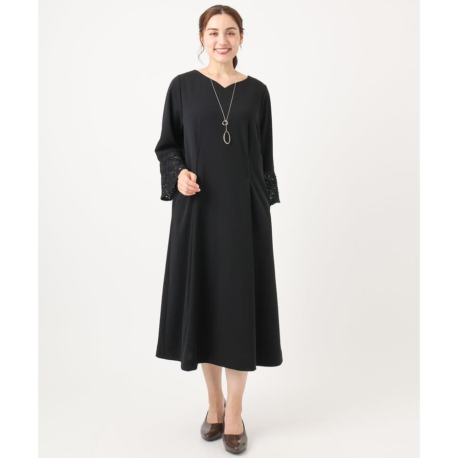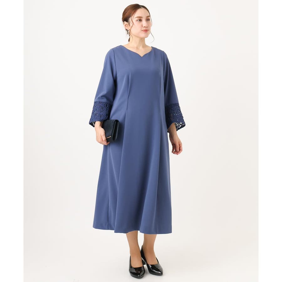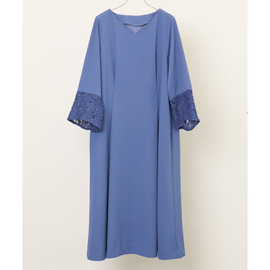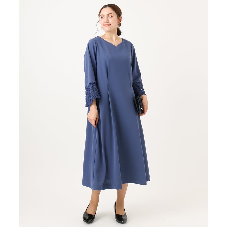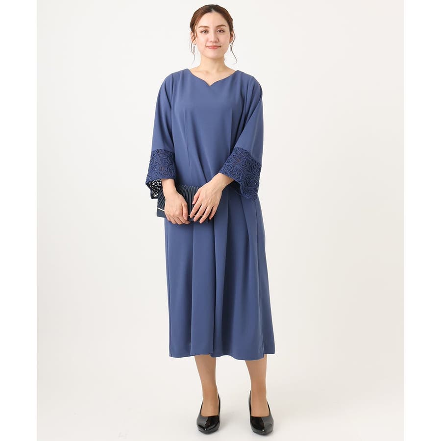 カービィなVネックに袖口のレースが上品な女性らしいドレス。