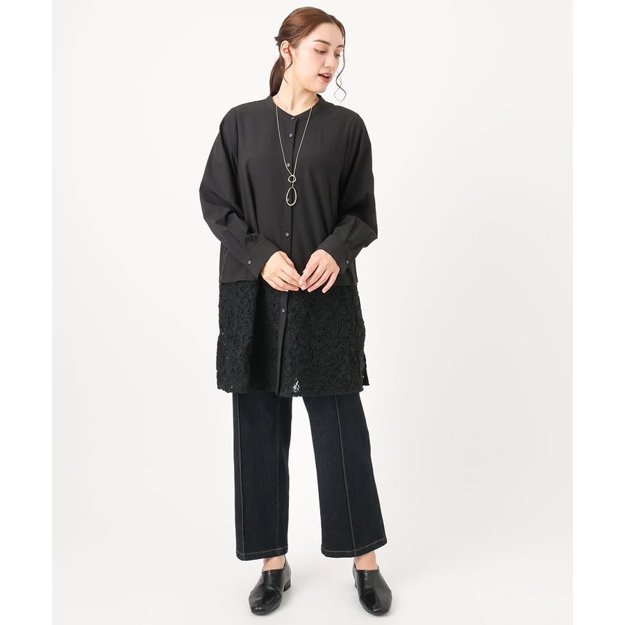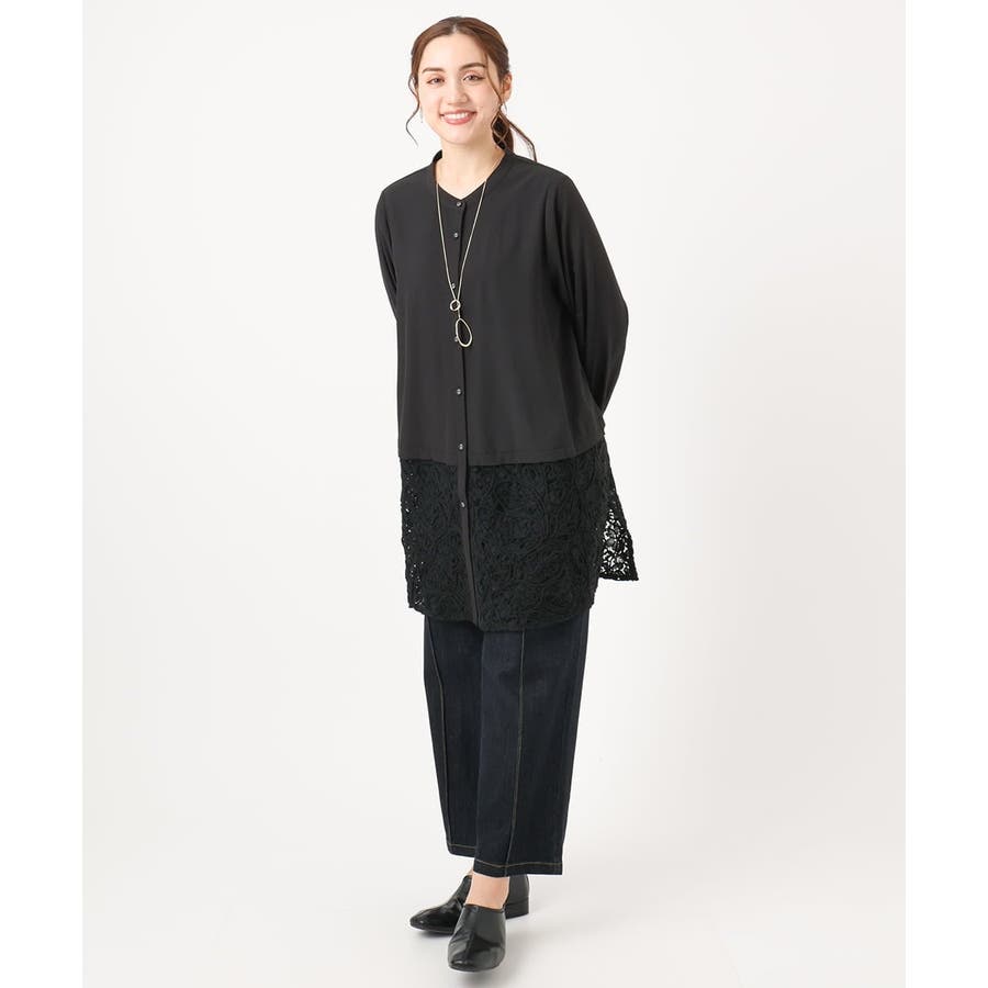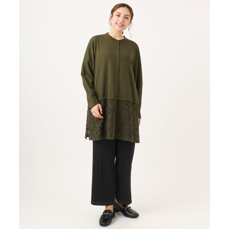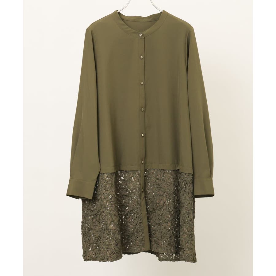 長めのシャツチュニックに裾レースをあしらった、大人可愛いデザイントップス。