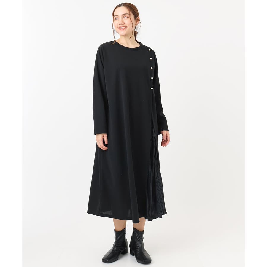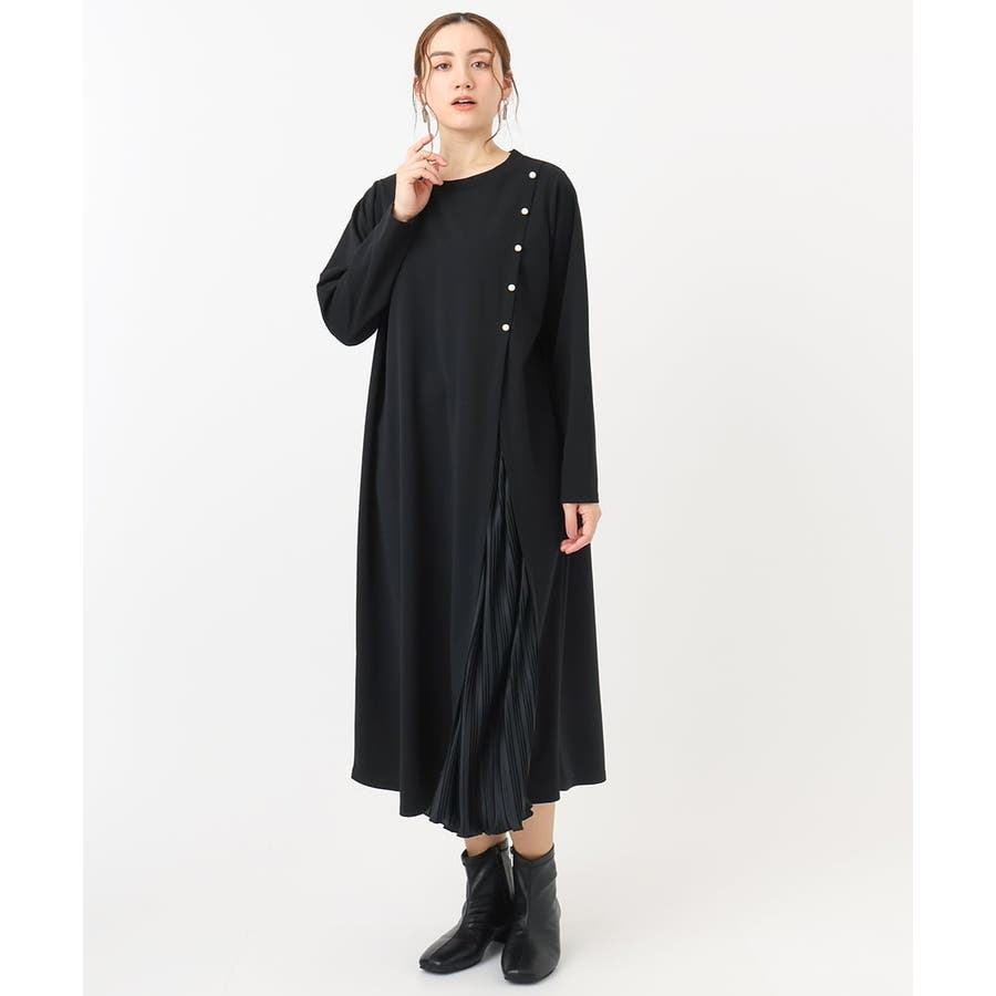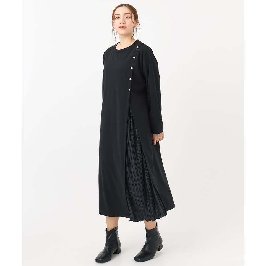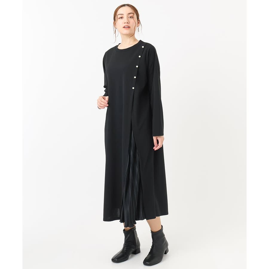 アシンメトリーにとった切替からプリーツがのぞくデザインワンピース。