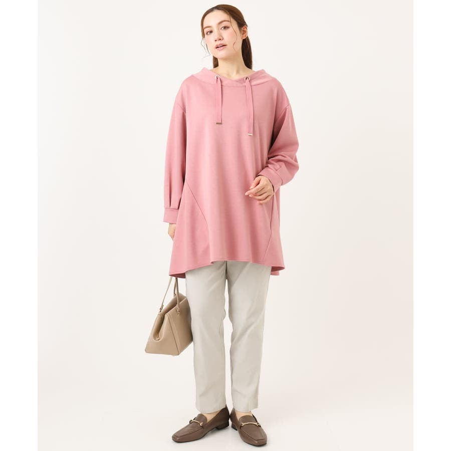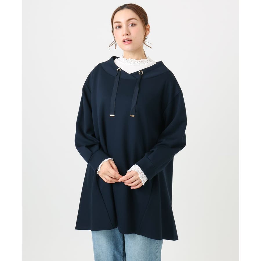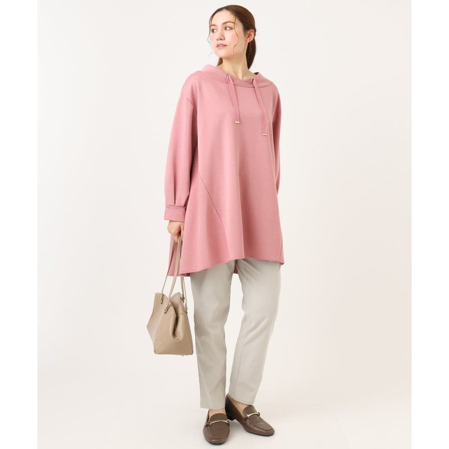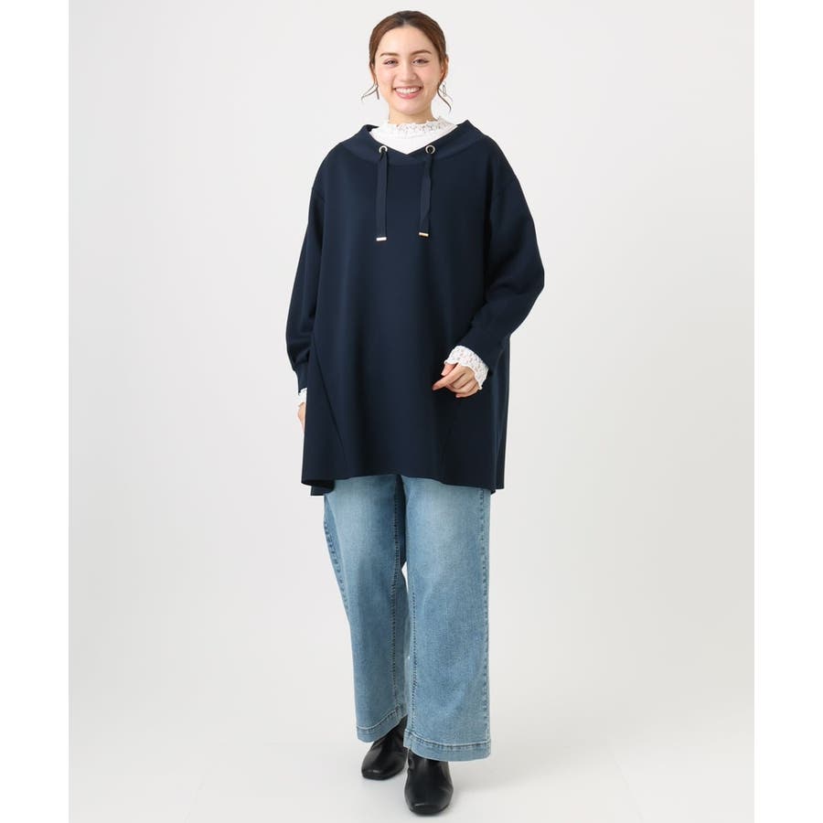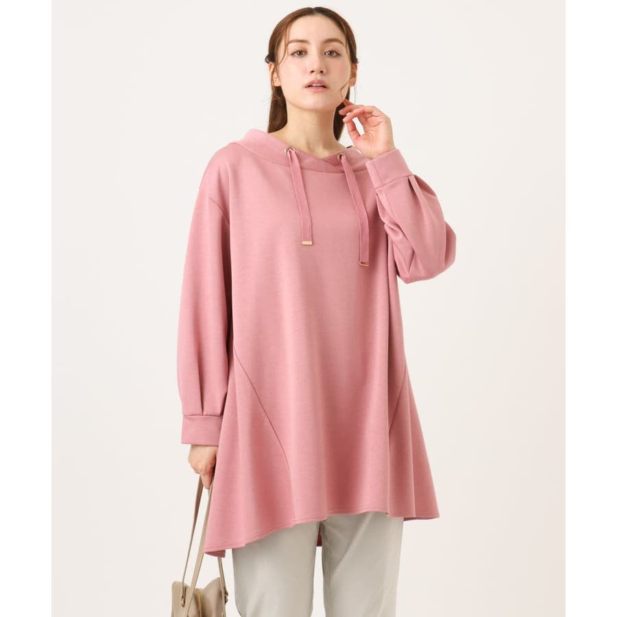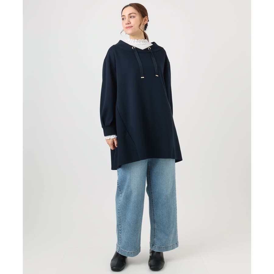 フーディー風に切り替え&スピンドルの入ったネックデザインはアウターを羽織ってもかさばらずご着用いただけます。