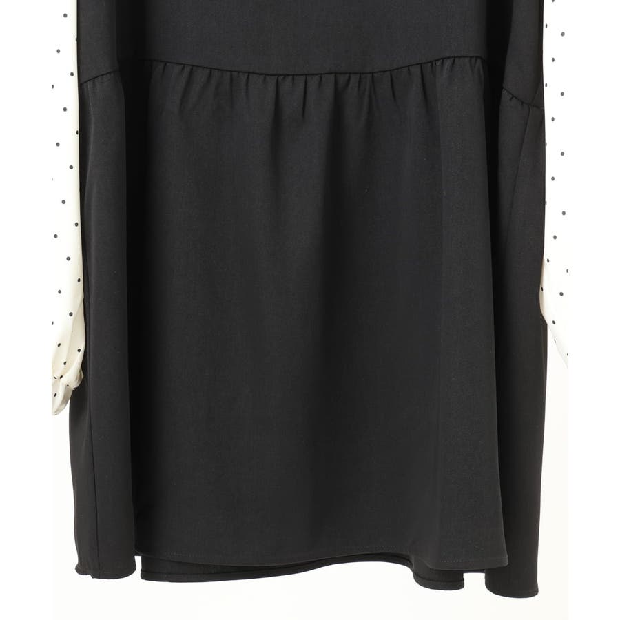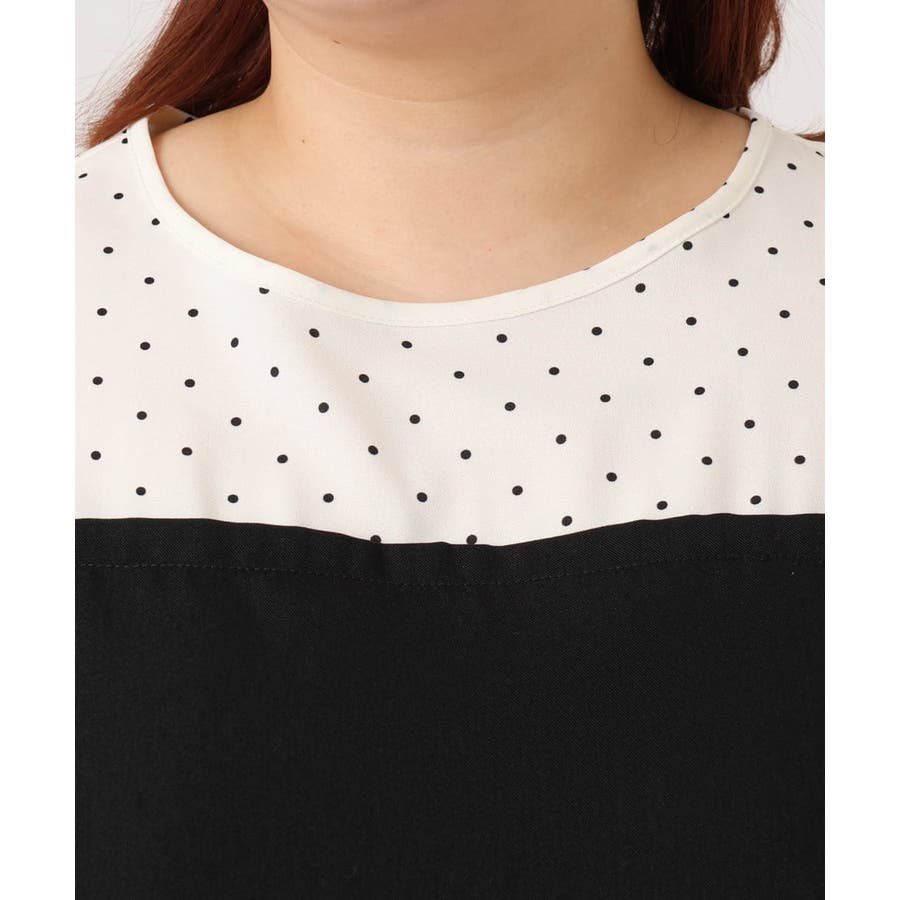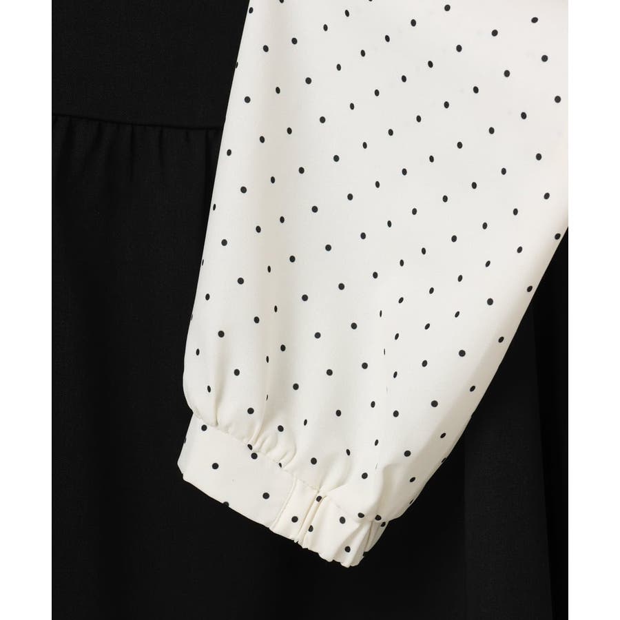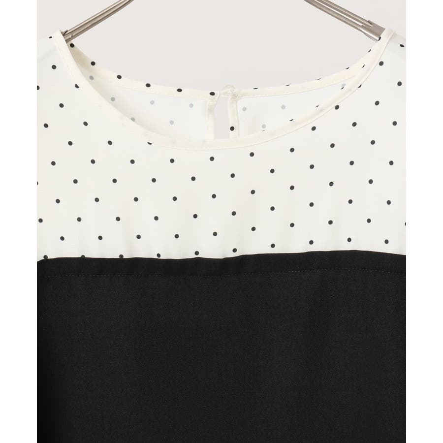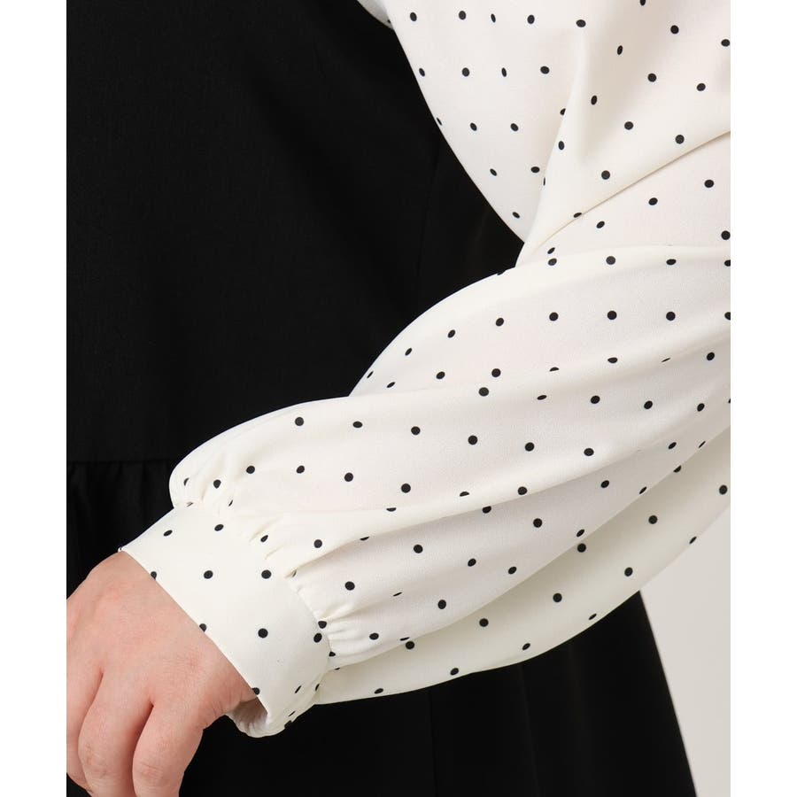 表面感あるポリエステル素材にドットプリントしたブラウスとビスチェ部分は少々ハリのあるツイル素材を使用しています。