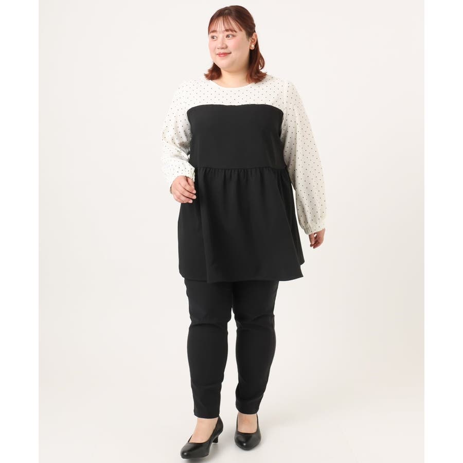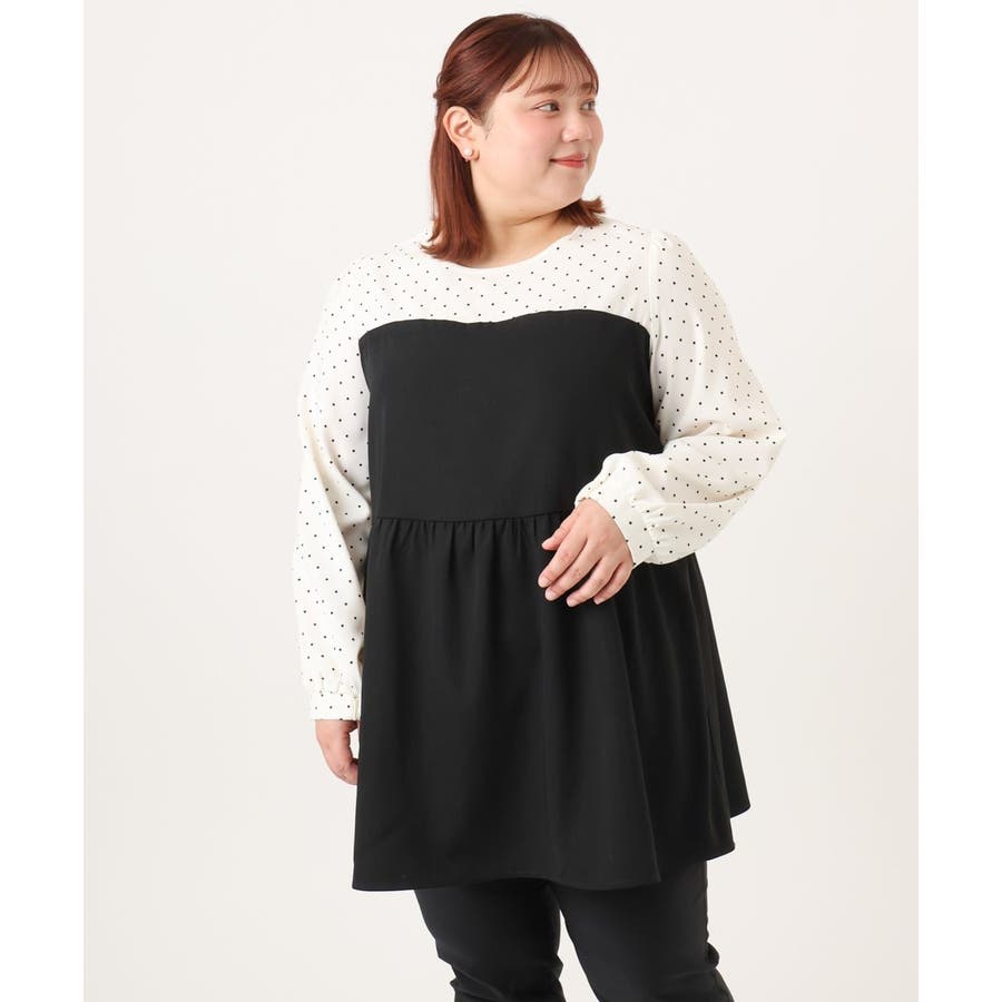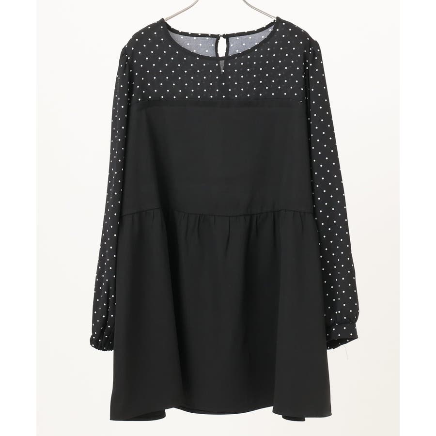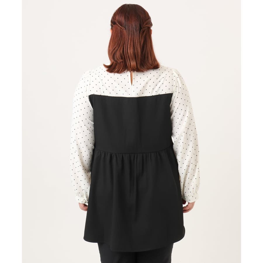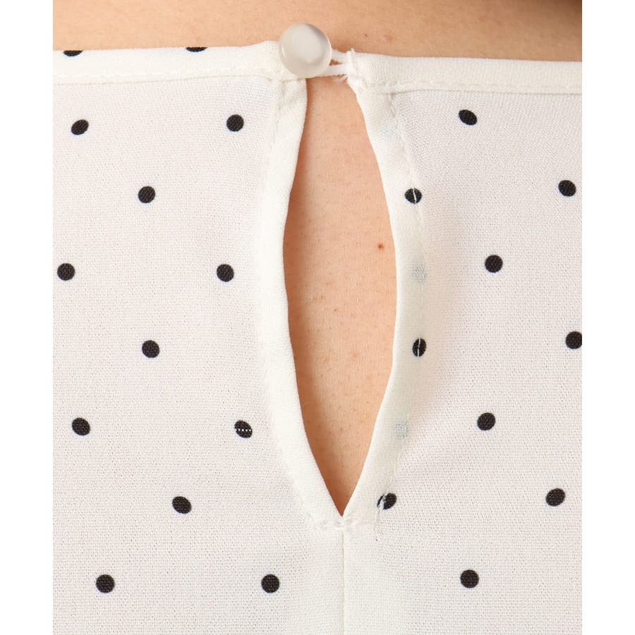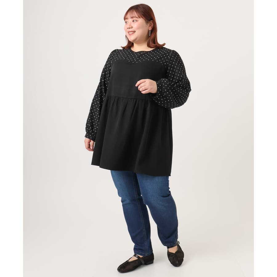 表面感あるポリエステル素材にドットプリントしたブラウスとビスチェ部分は少々ハリのあるツイル素材を使用しています。