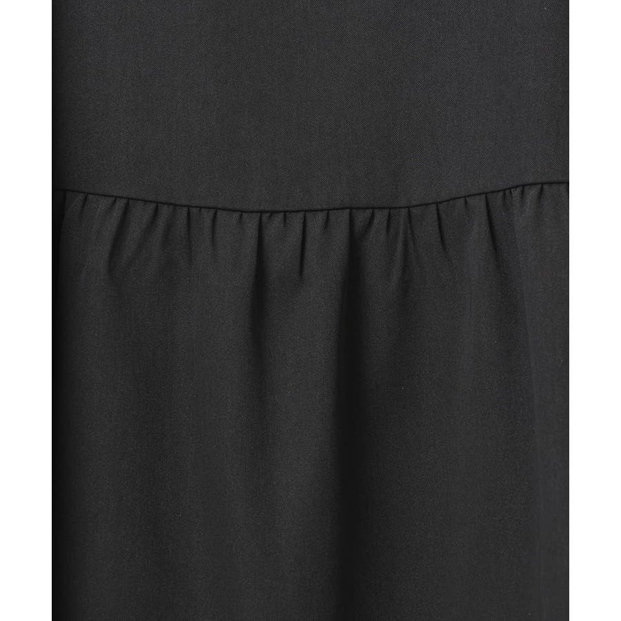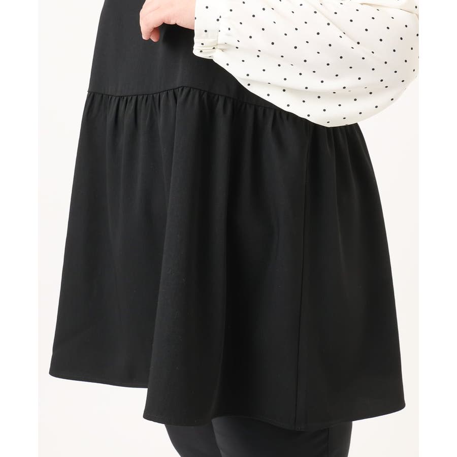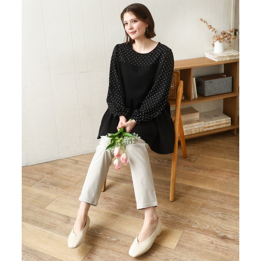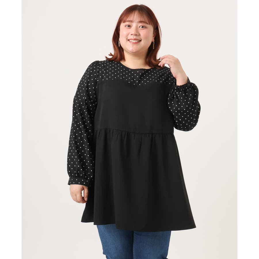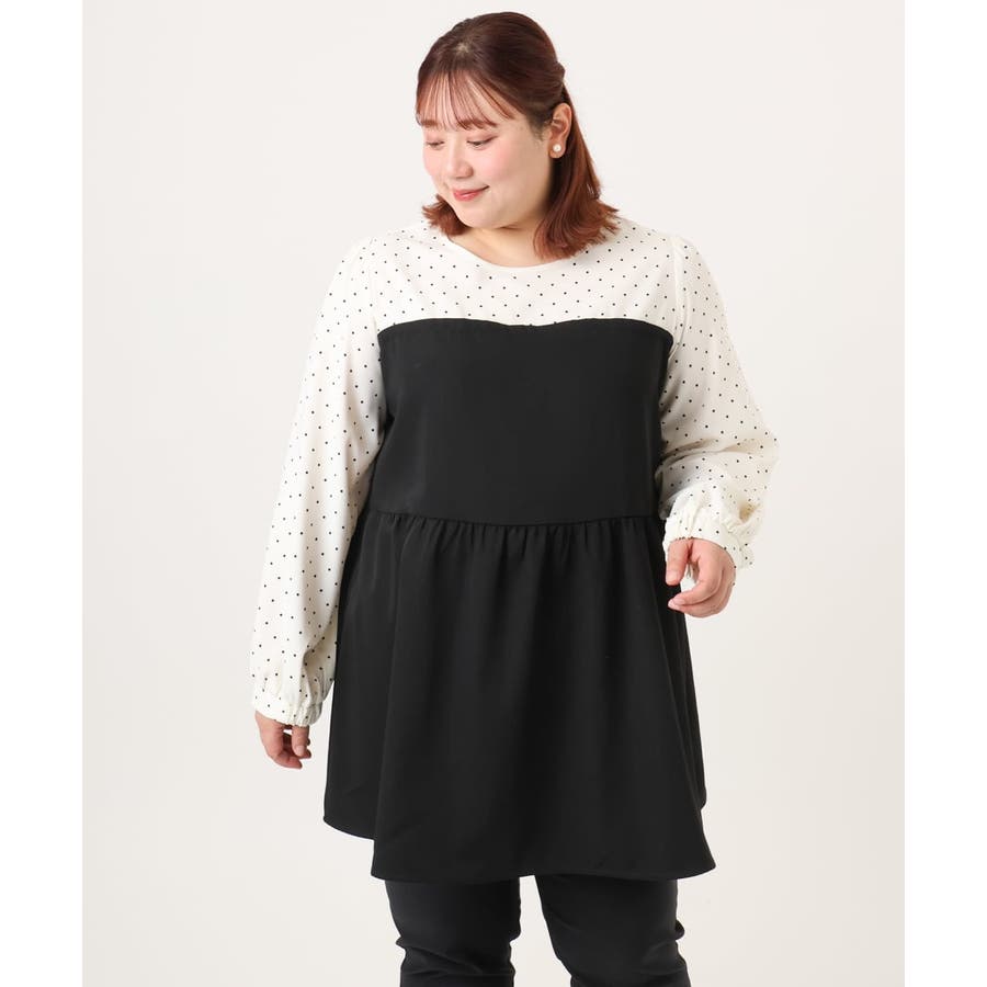 表面感あるポリエステル素材にドットプリントしたブラウスとビスチェ部分は少々ハリのあるツイル素材を使用しています。