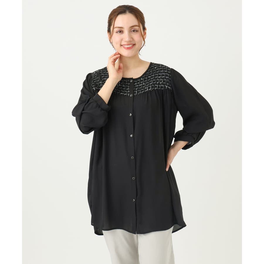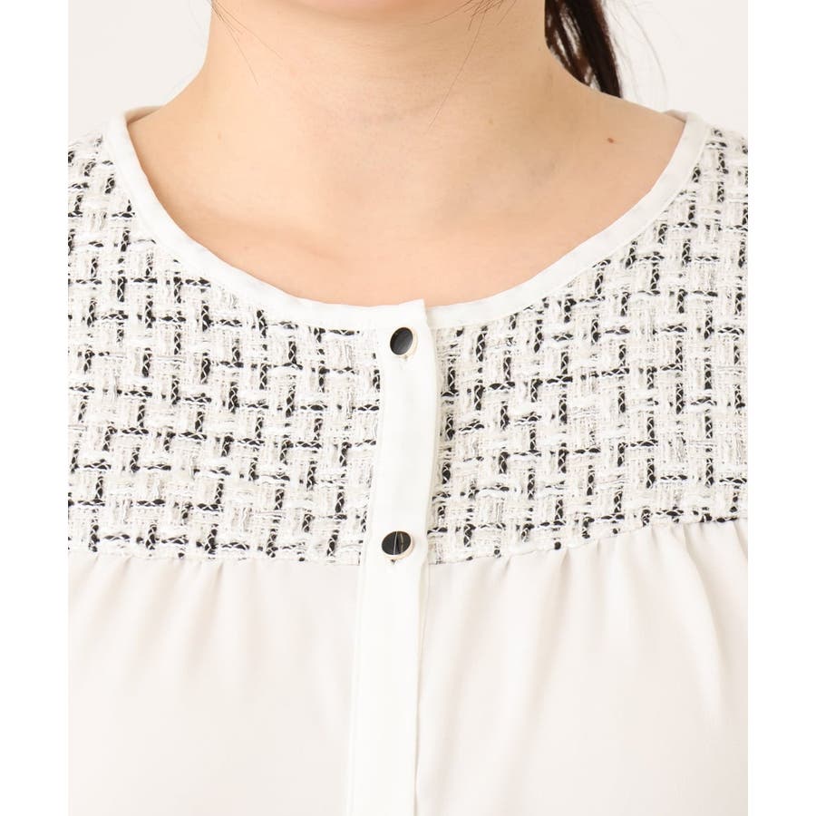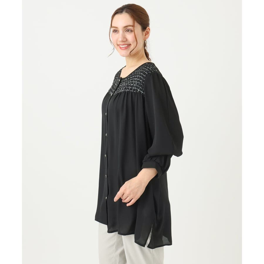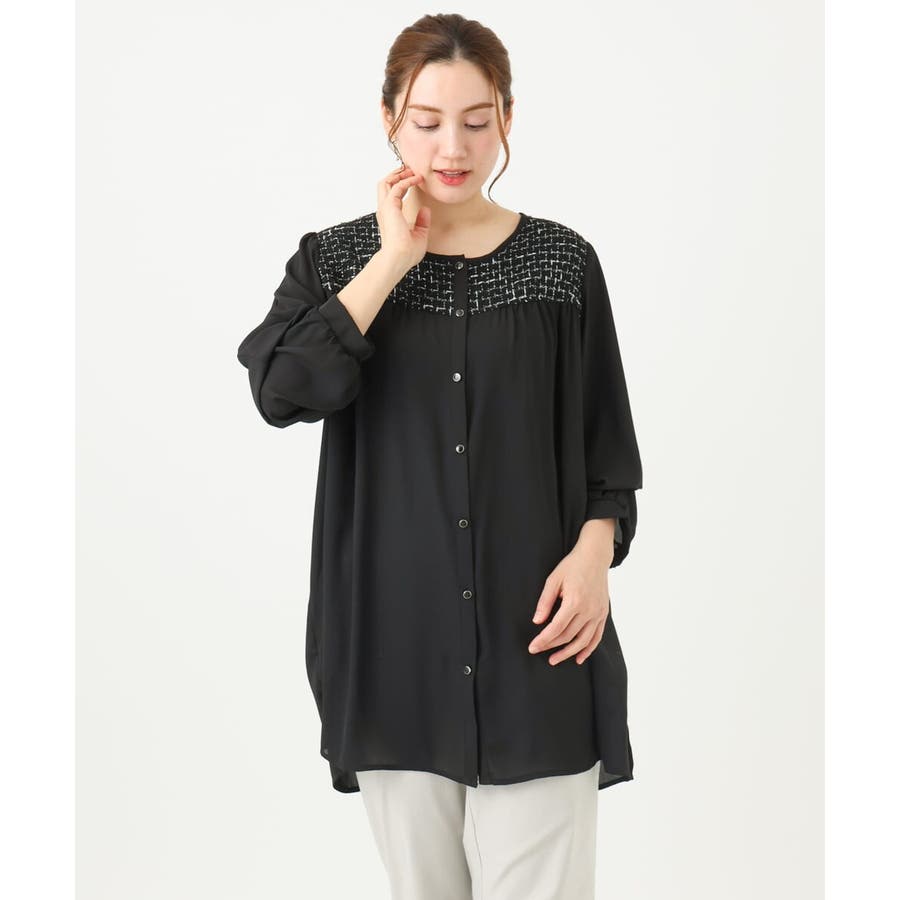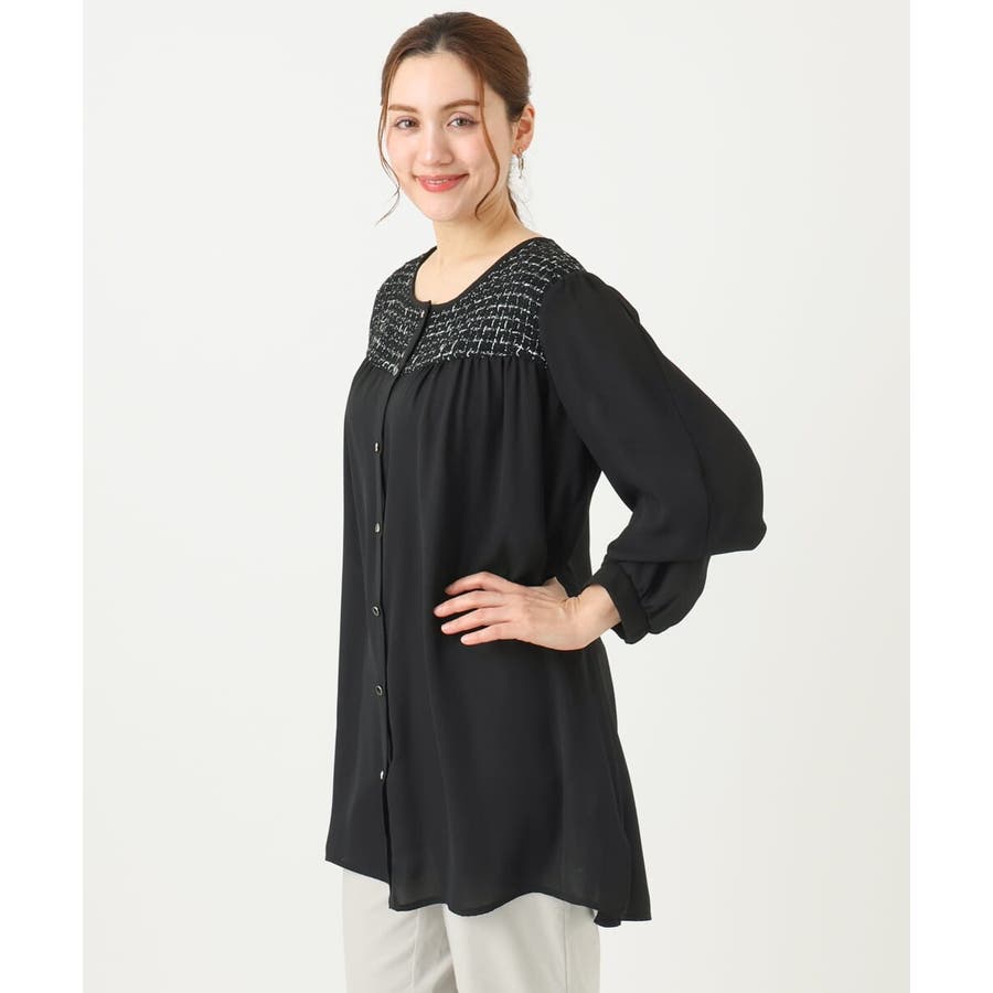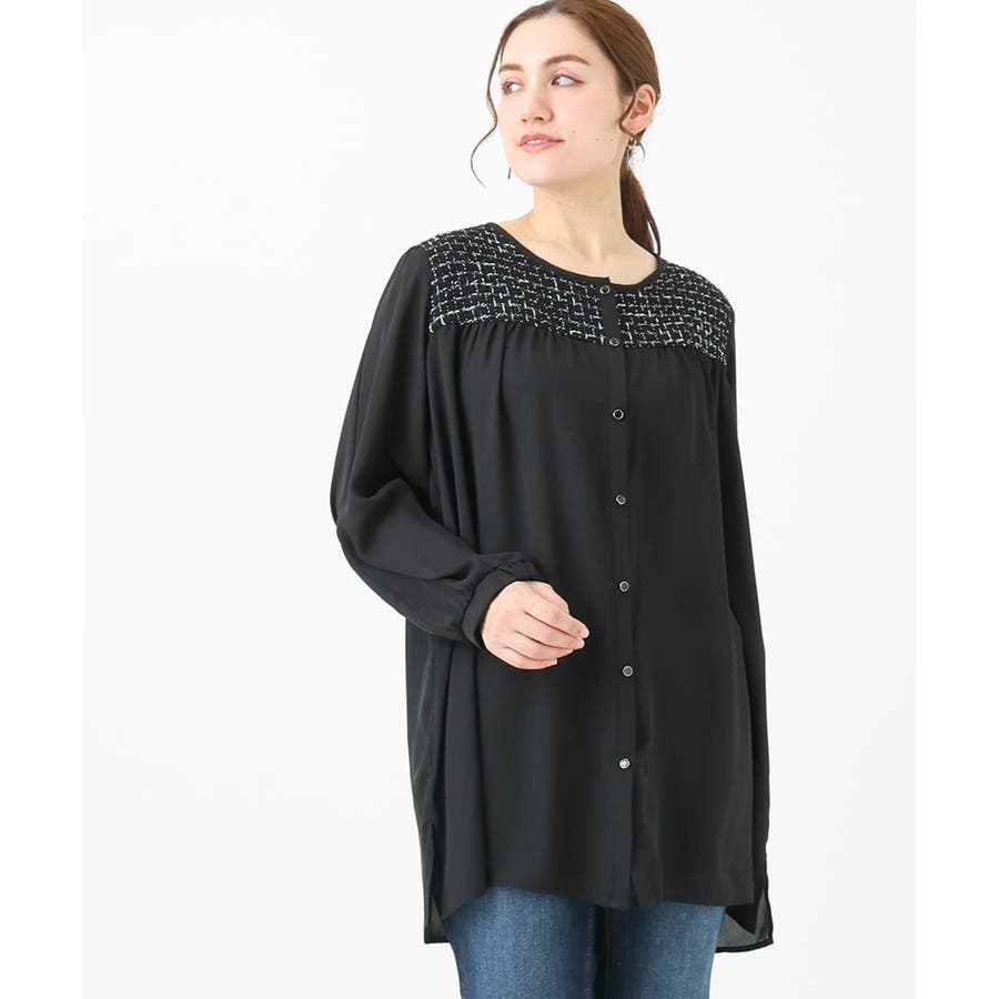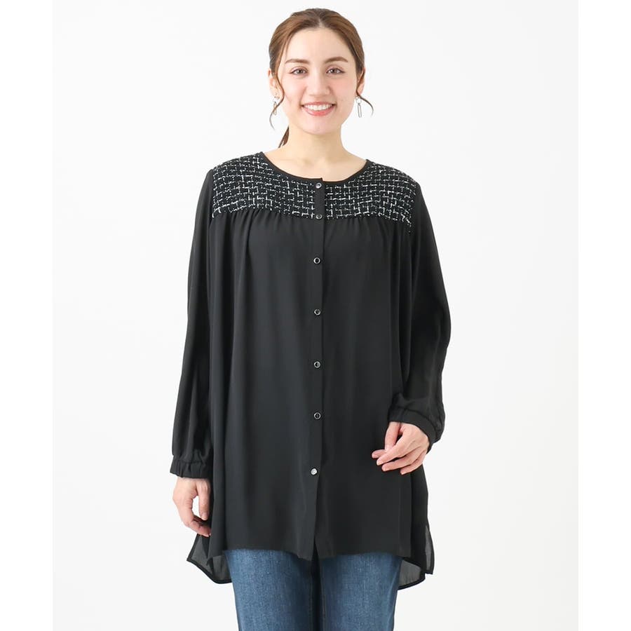 前のヨーク部分にツイード素材を使用しジョーゼットとドッキングさせたキレイ目にも着用いただけるブラウスです。