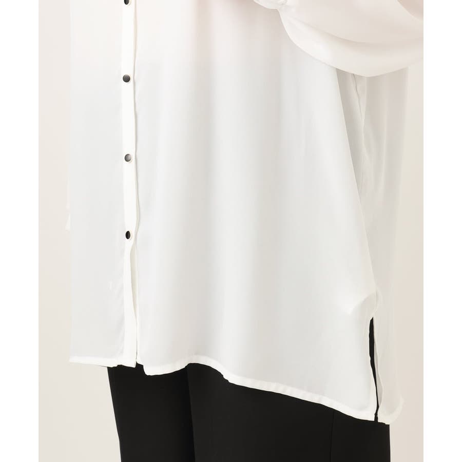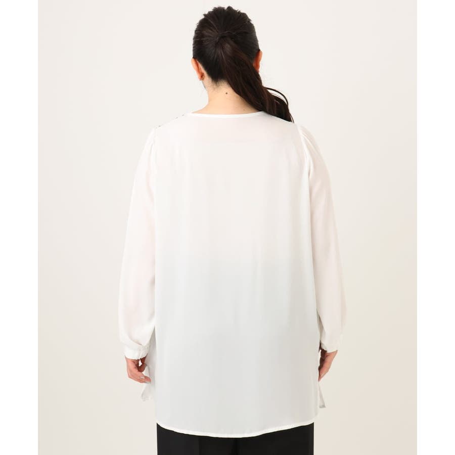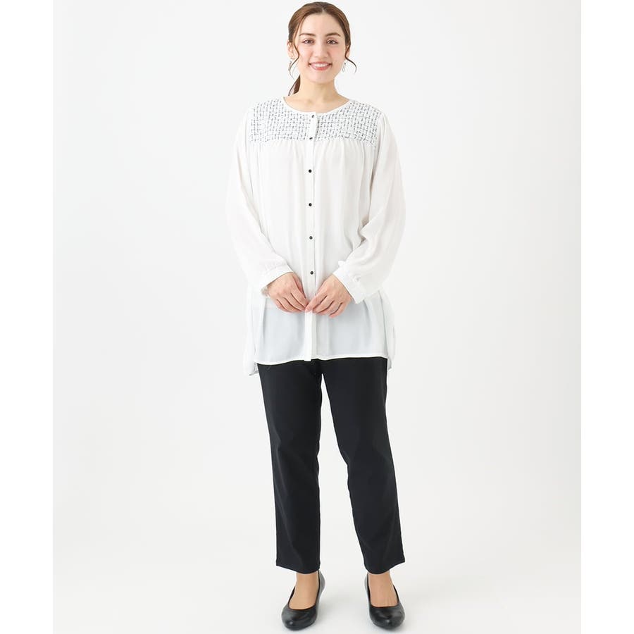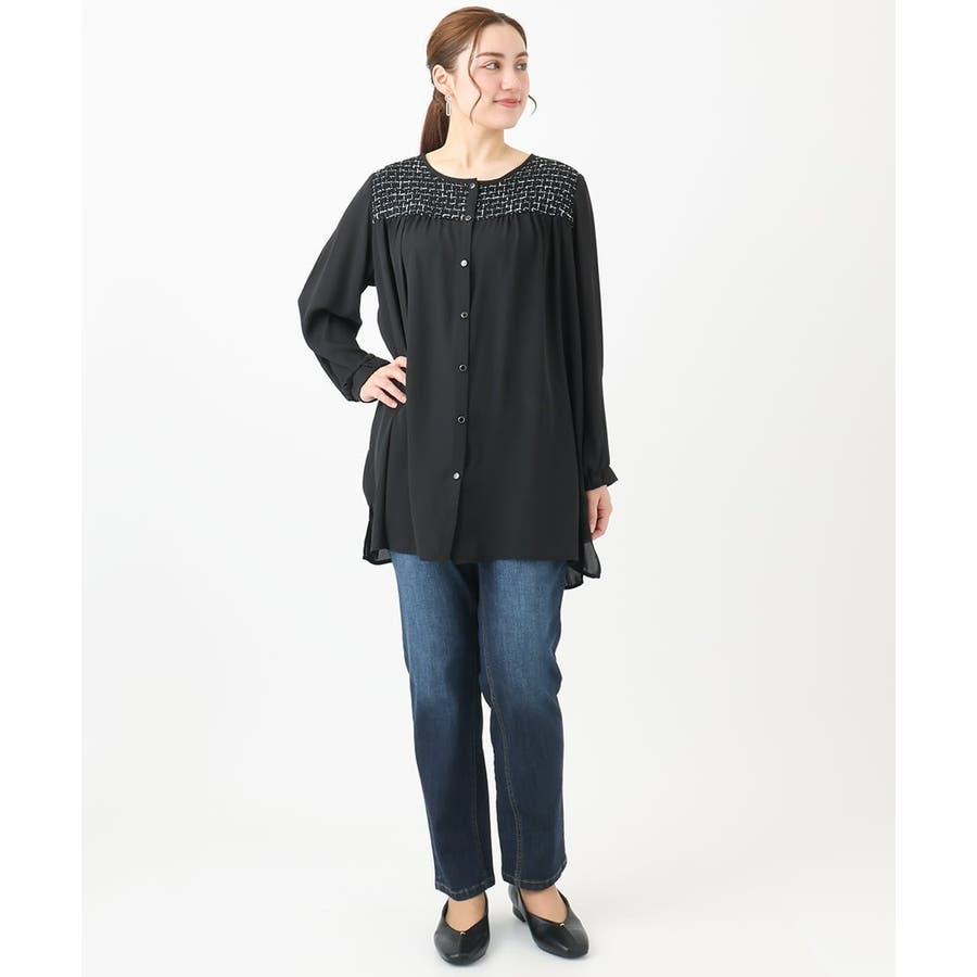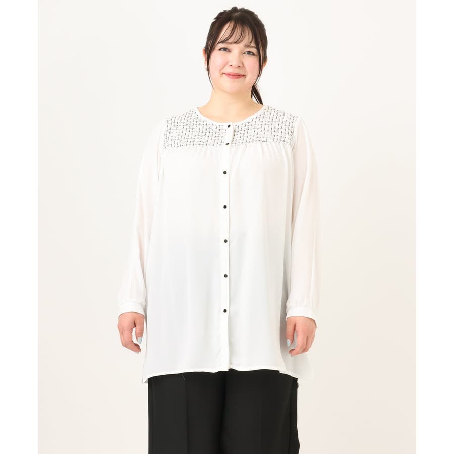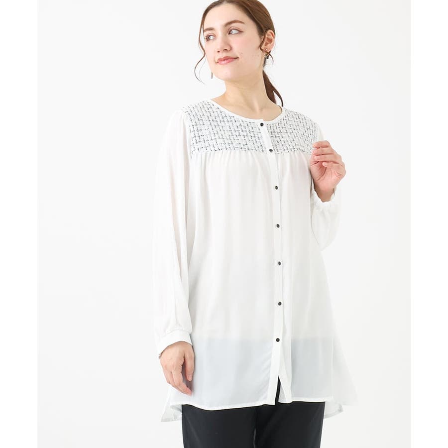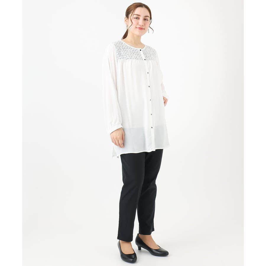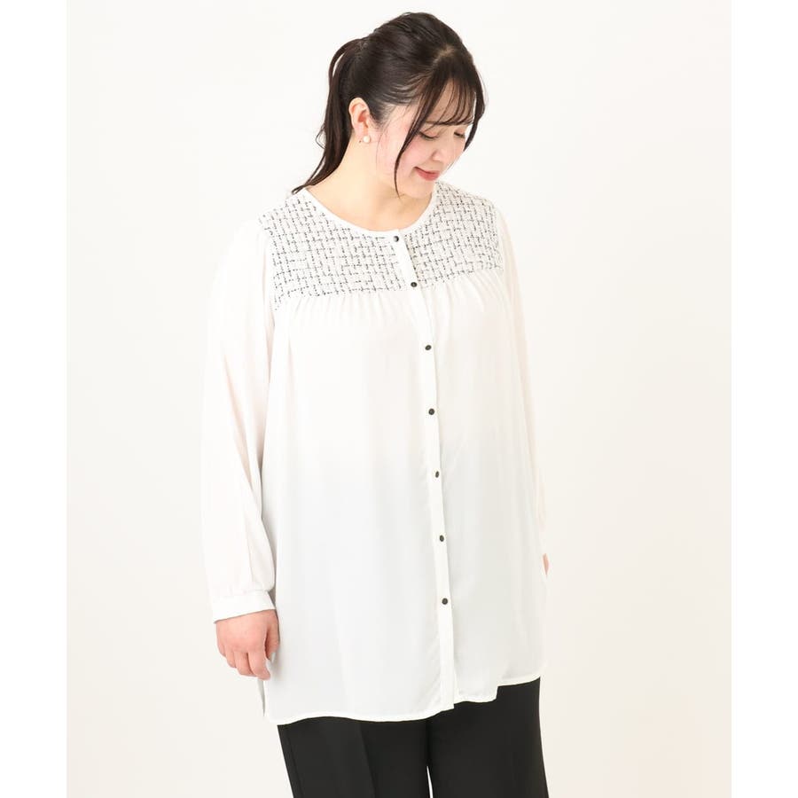 前のヨーク部分にツイード素材を使用しジョーゼットとドッキングさせたキレイ目にも着用いただけるブラウスです。