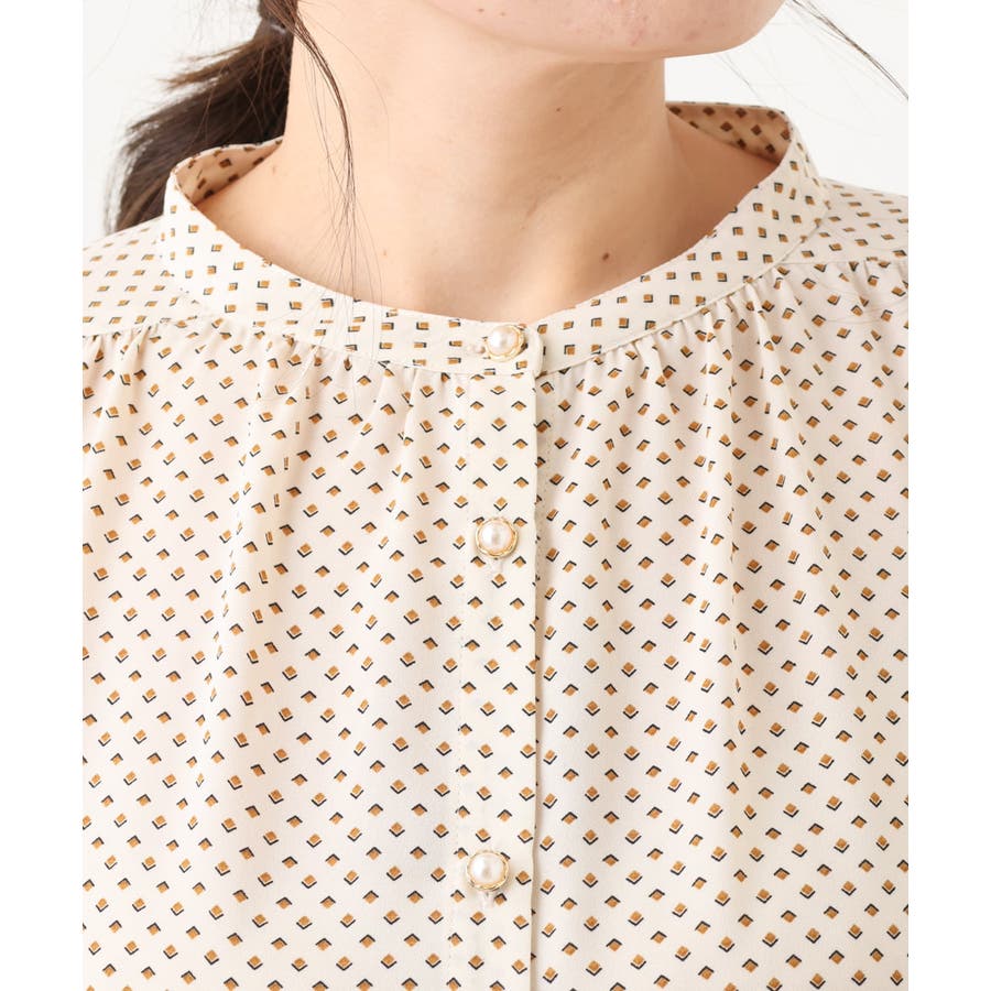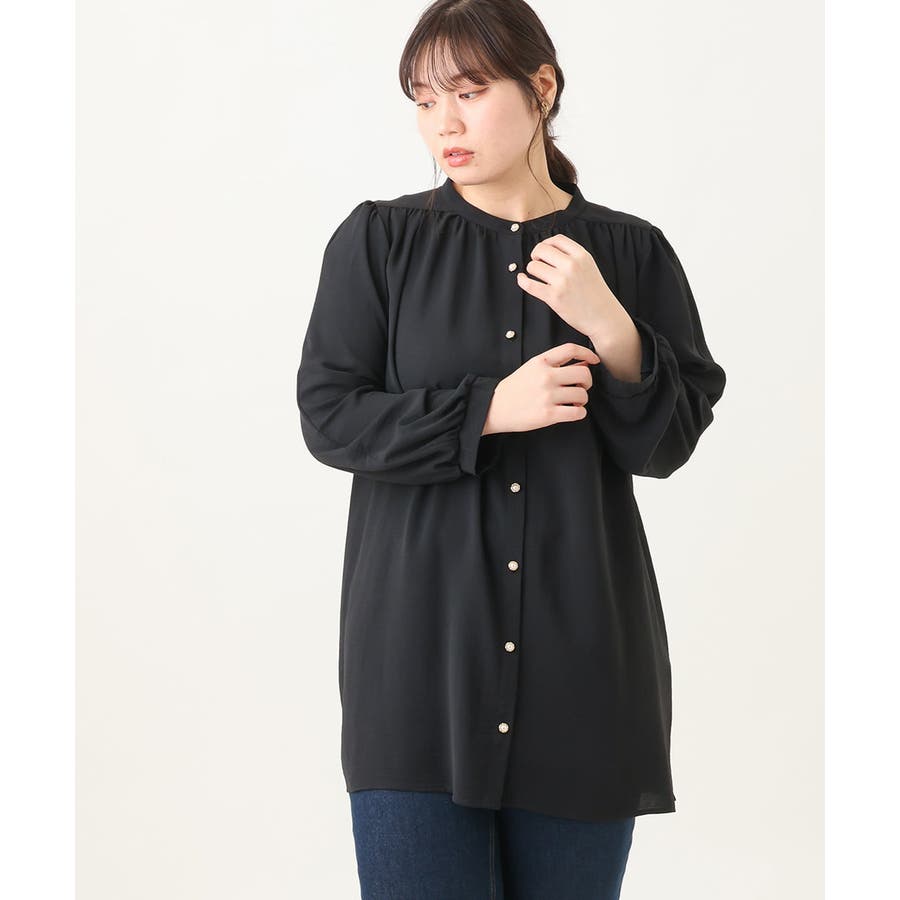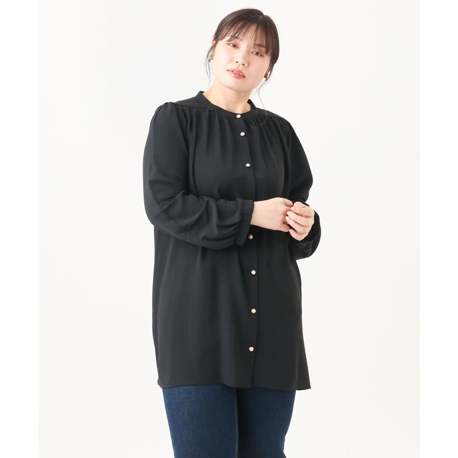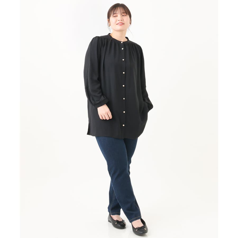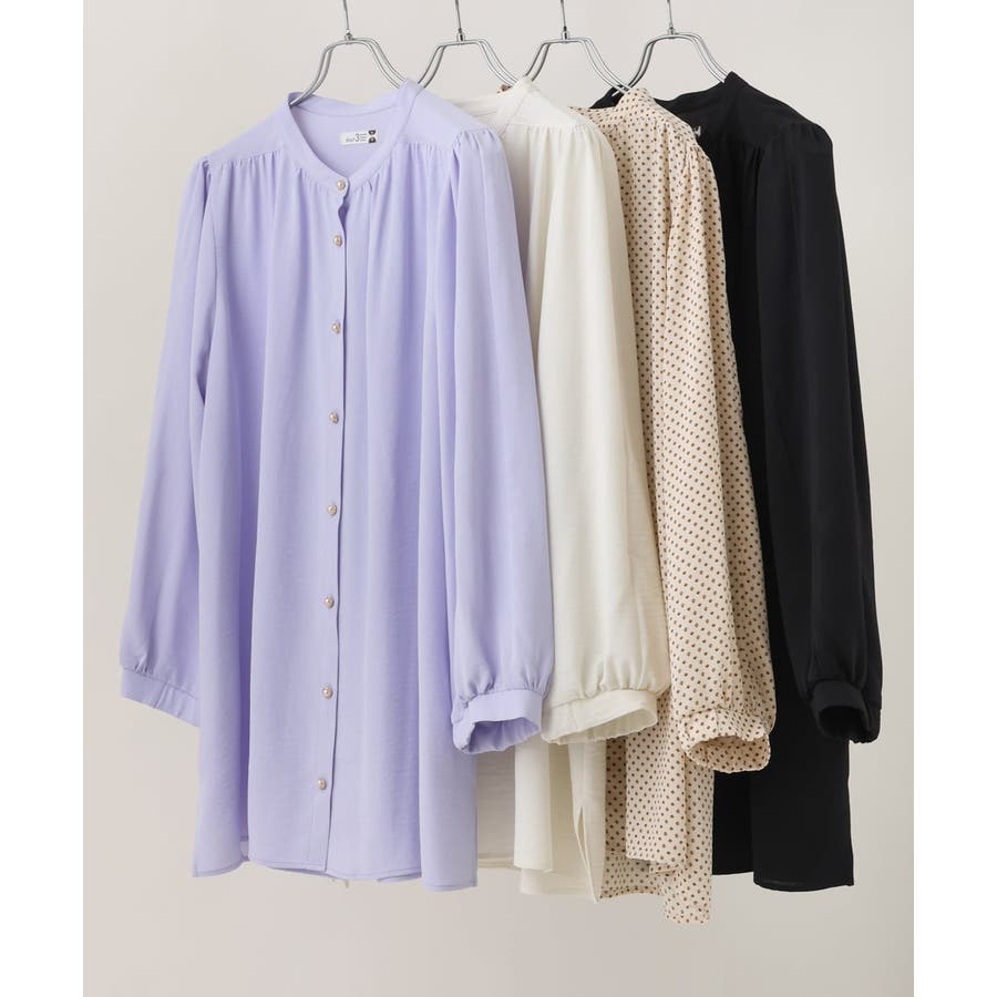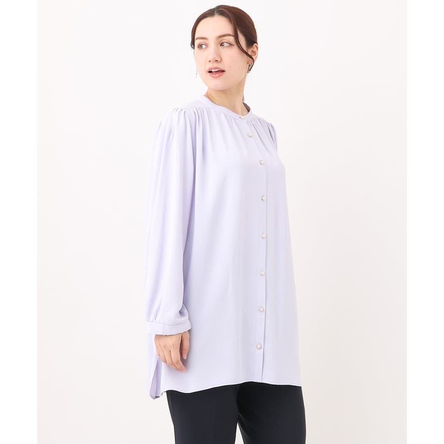 ヨークのギャザーとパール風ボタンがフェミニンなアイテムです。