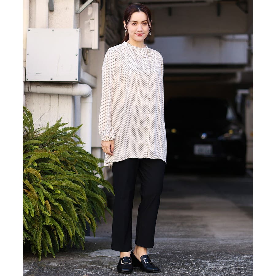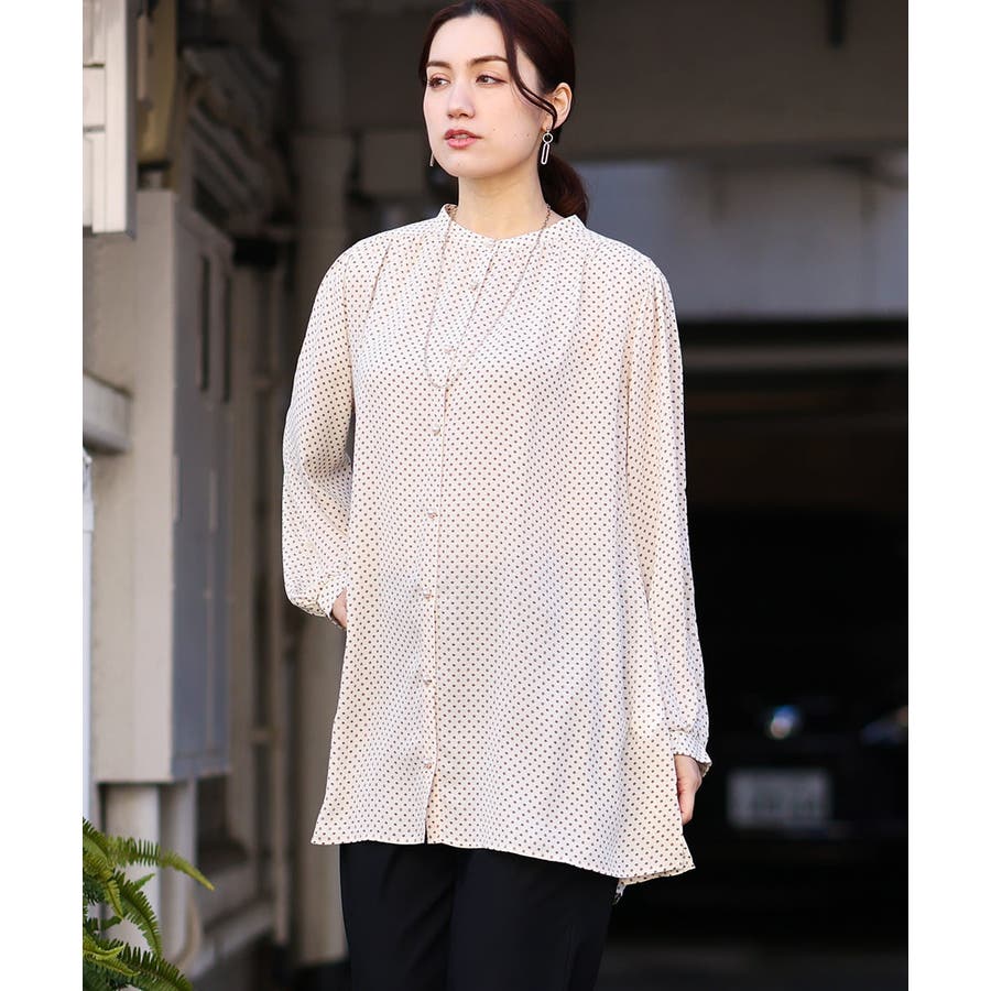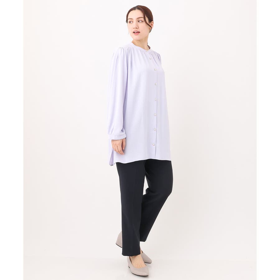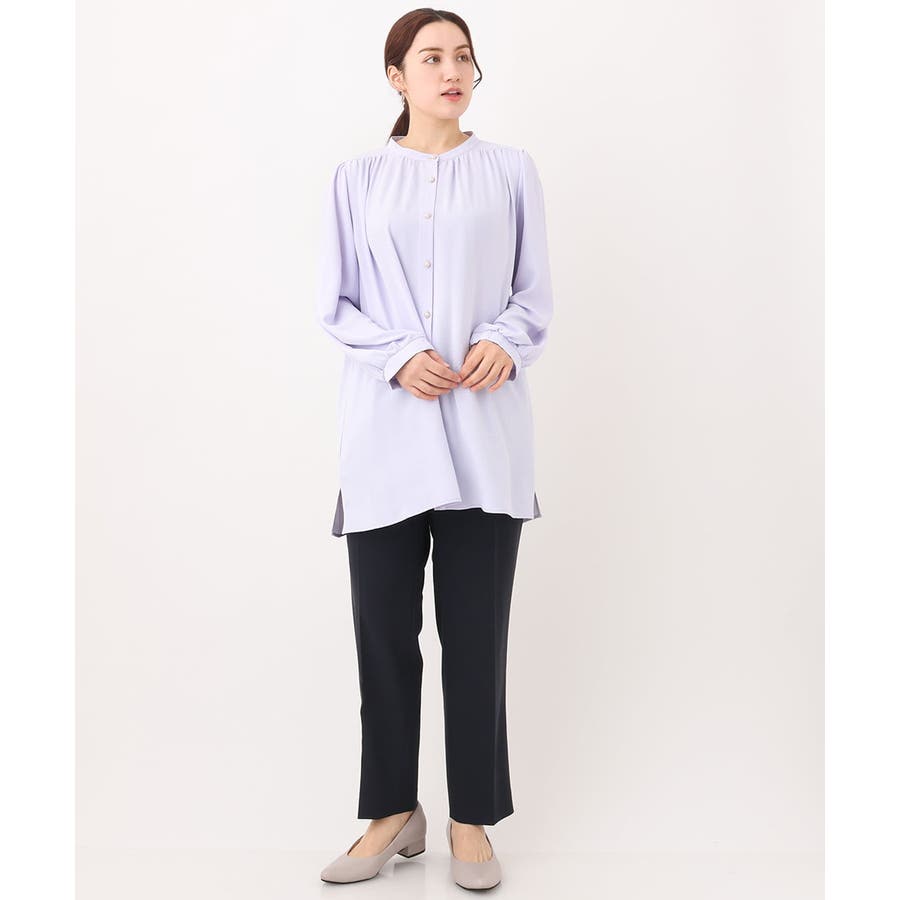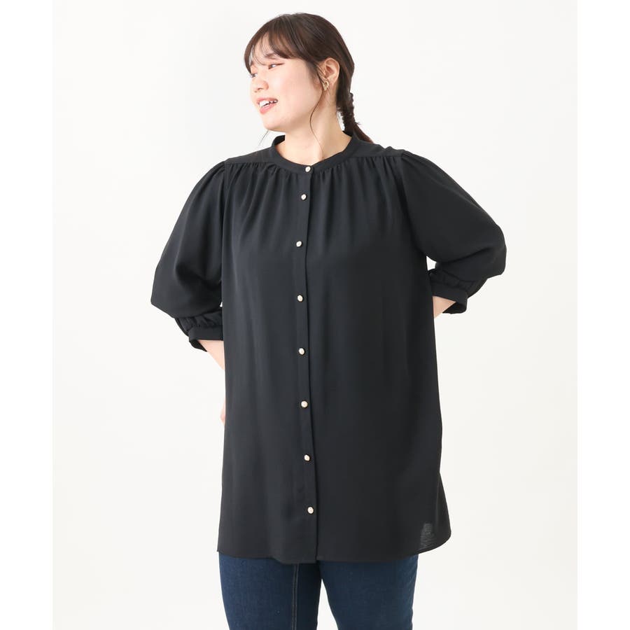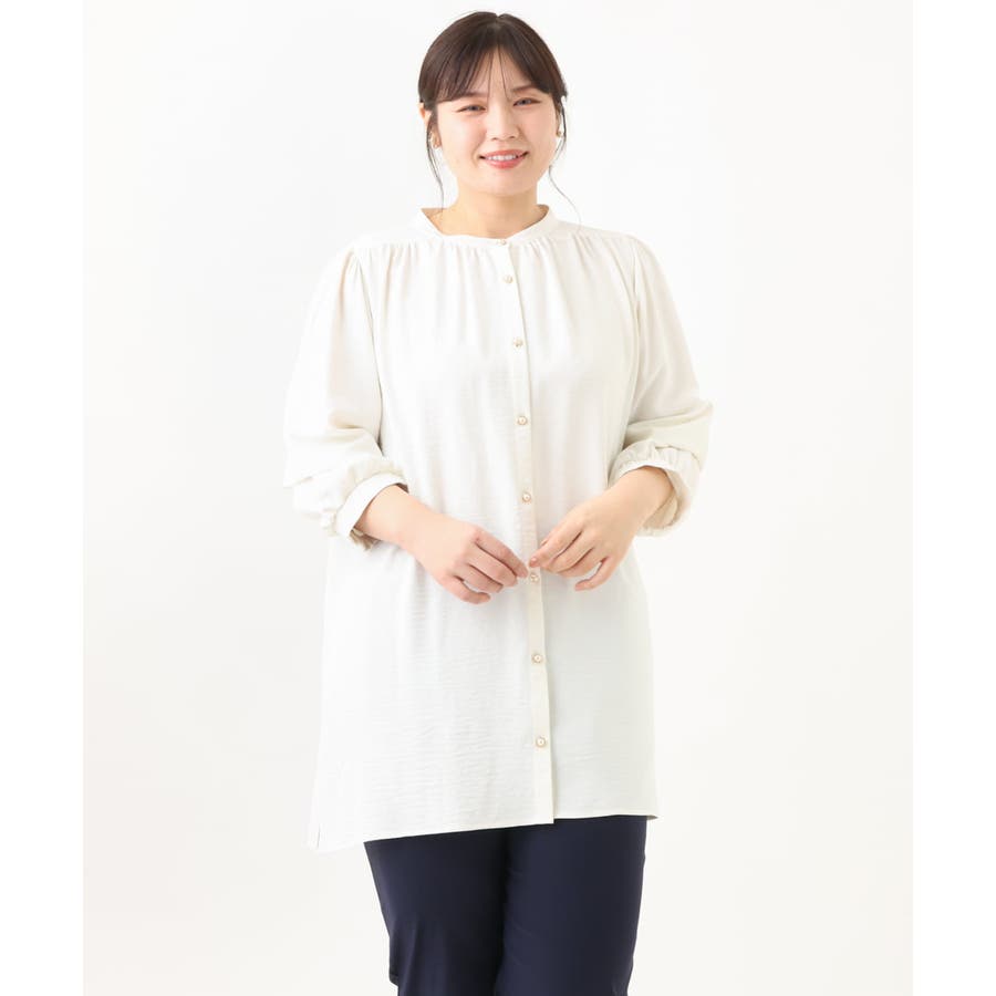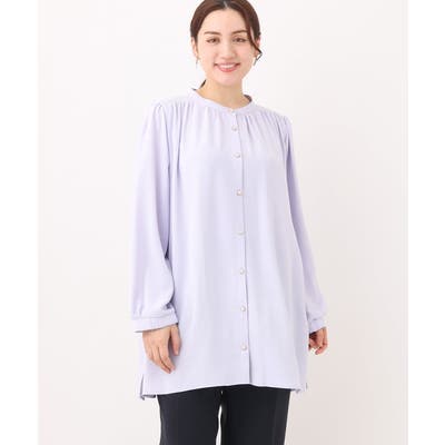 ヨークのギャザーとパール風ボタンがフェミニンなアイテムです。