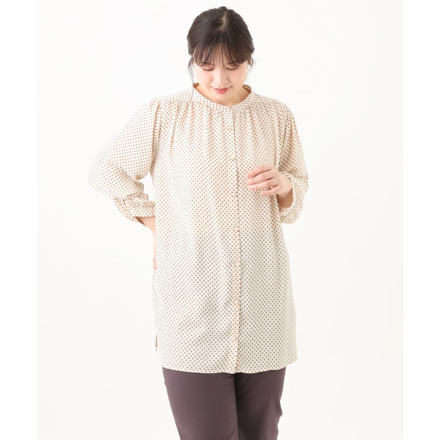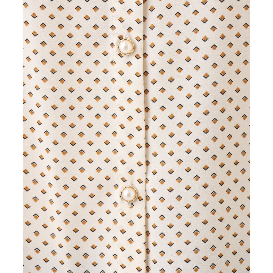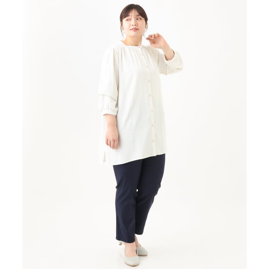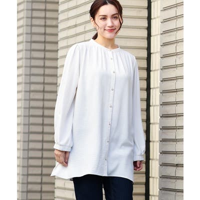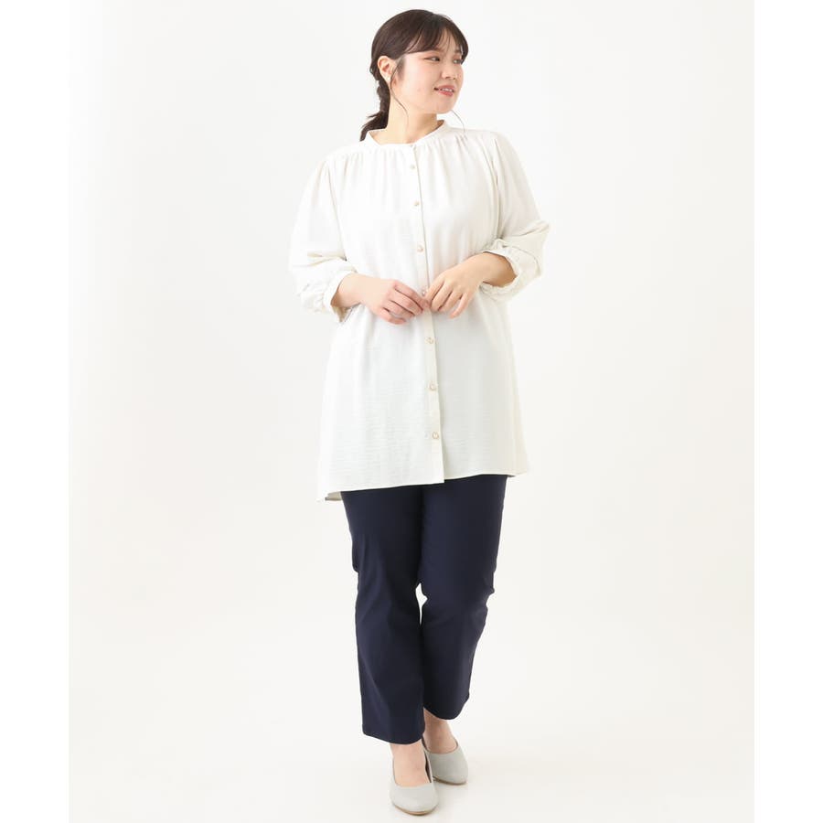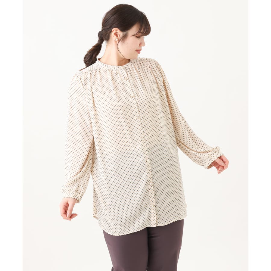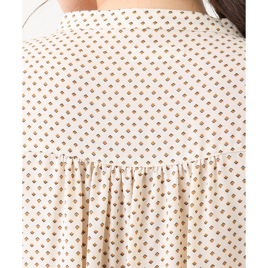 ヨークのギャザーとパール風ボタンがフェミニンなアイテムです。