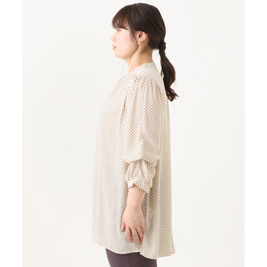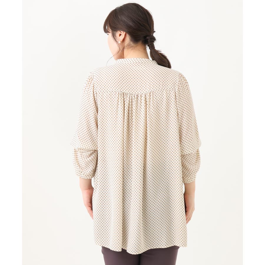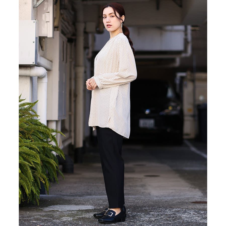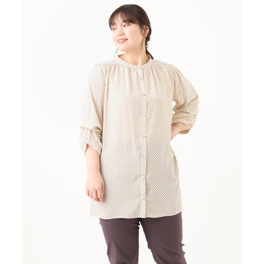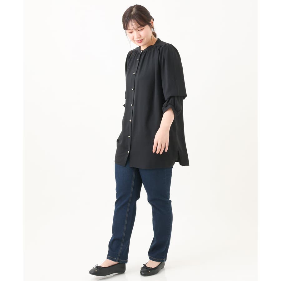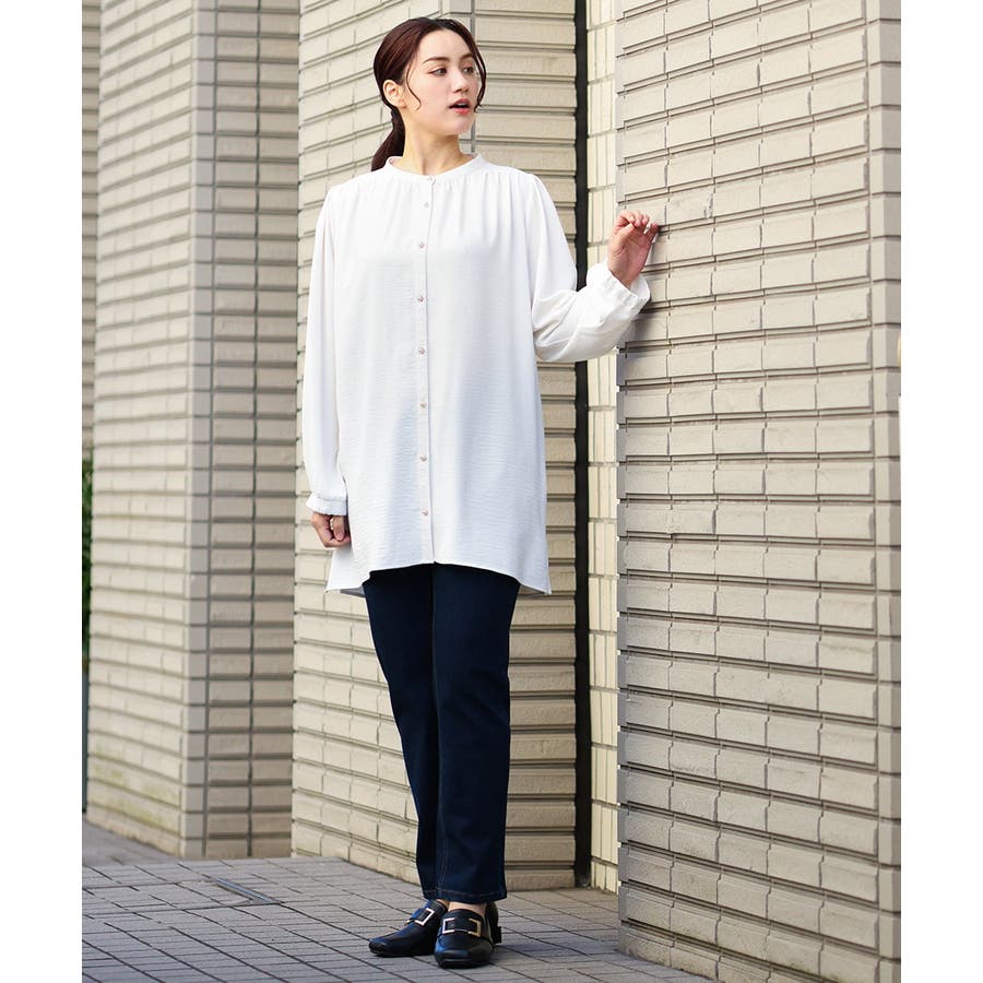 ヨークのギャザーとパール風ボタンがフェミニンなアイテムです。