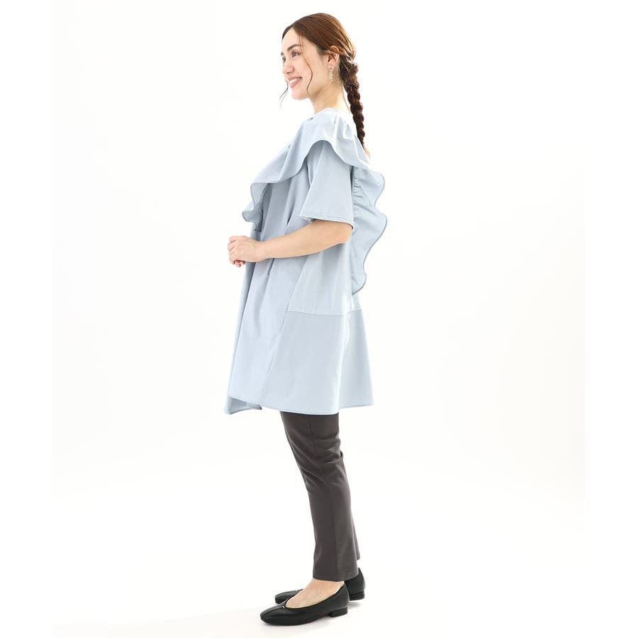 左肩にたっぷりと施したラッフルディテールが印象的な1枚着チュニックです。