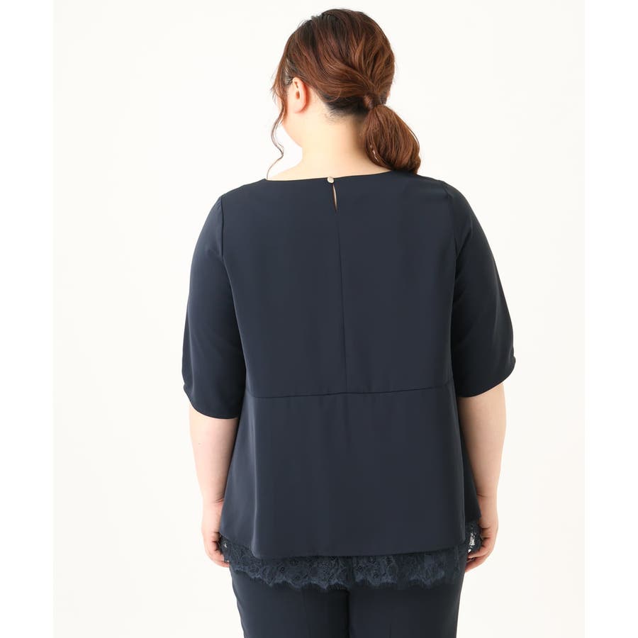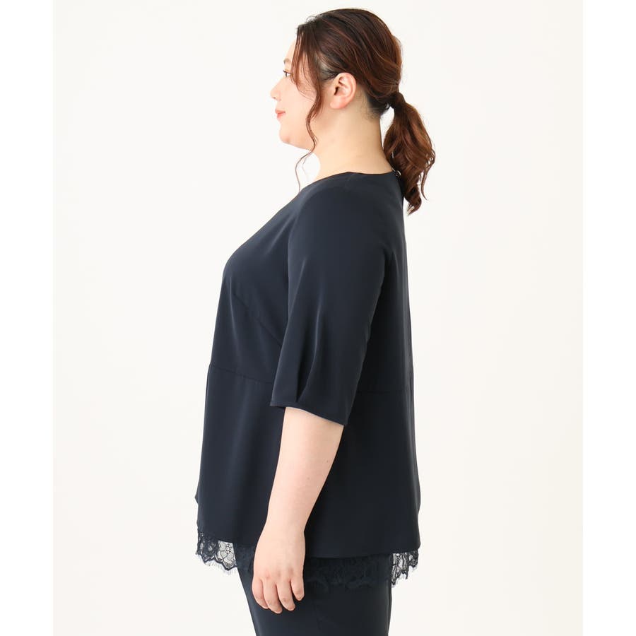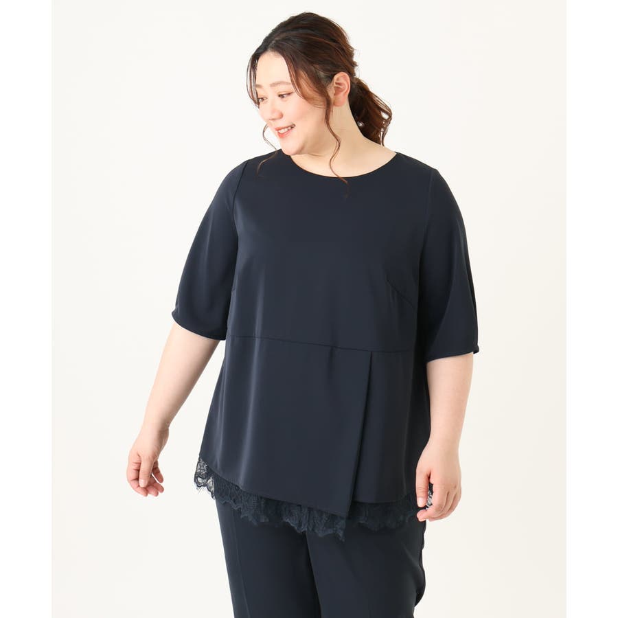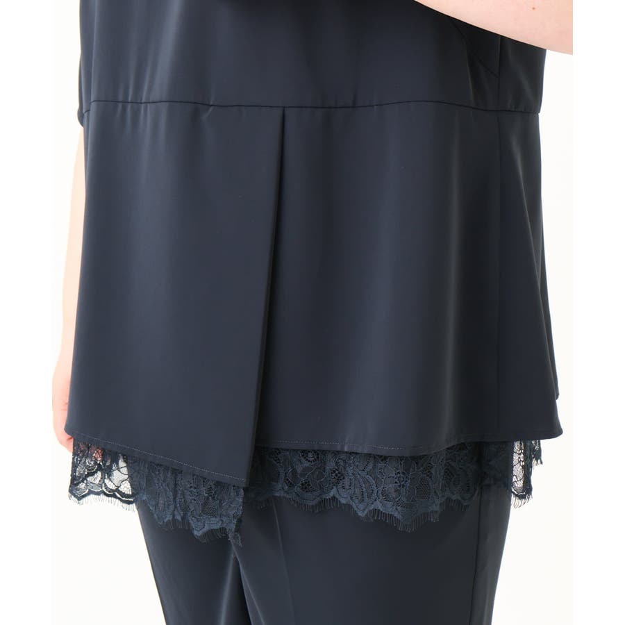 トップスはイレヘムにカッティングされたシルエットにスカラカットしたレースをレイヤードさせた繊細なディテール。