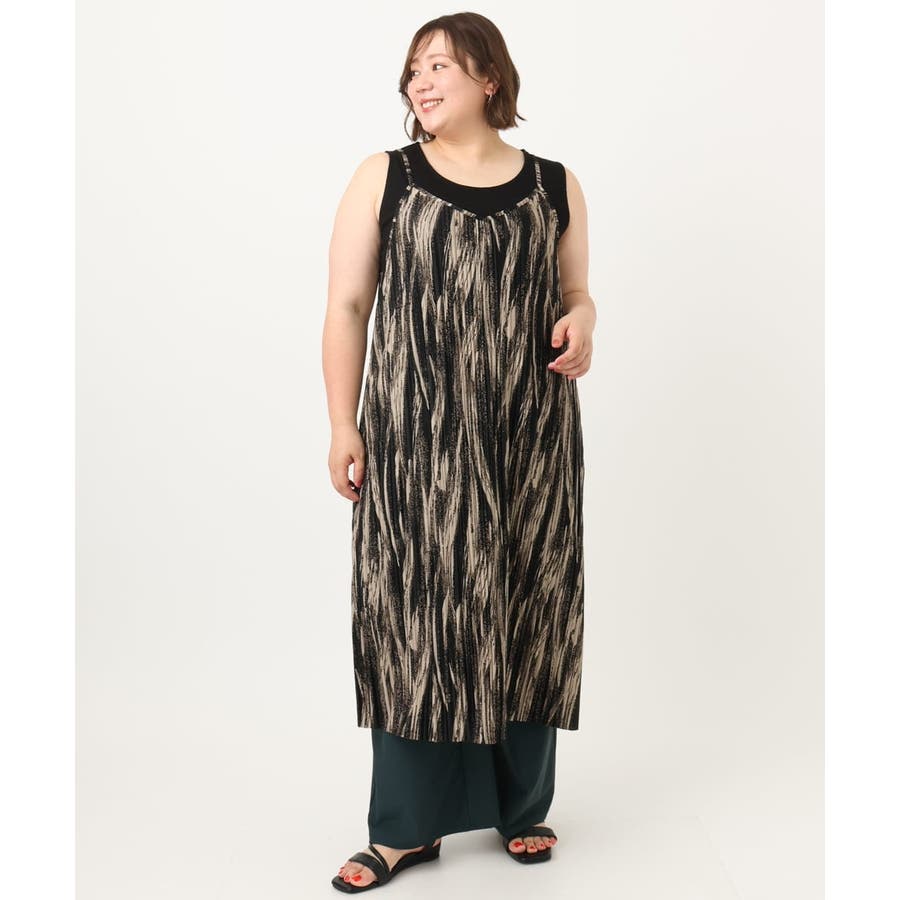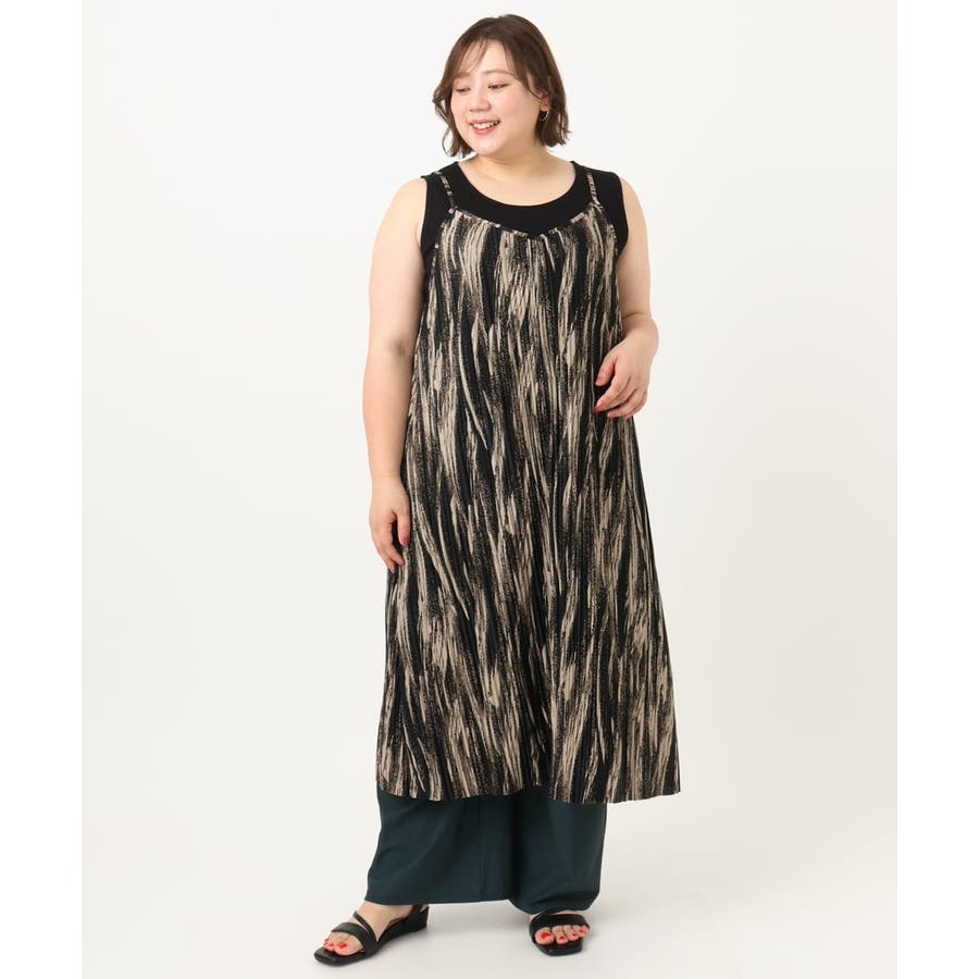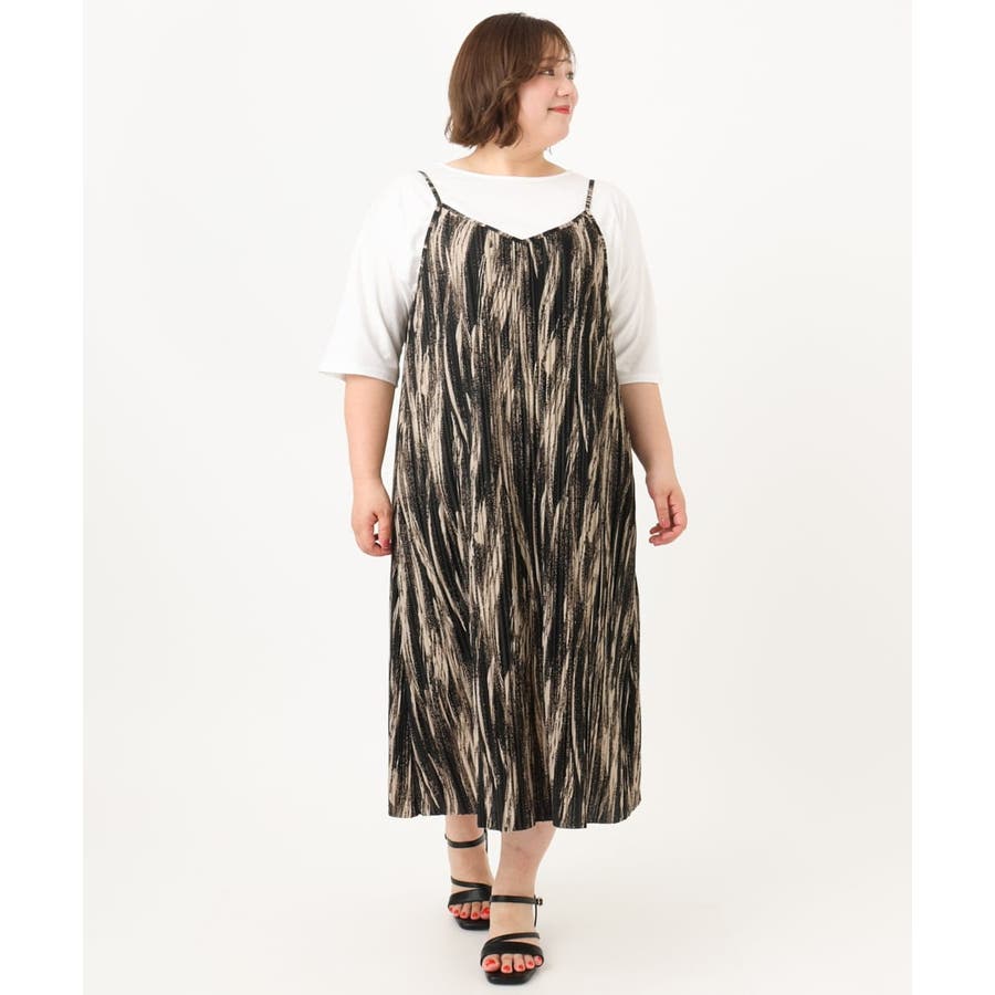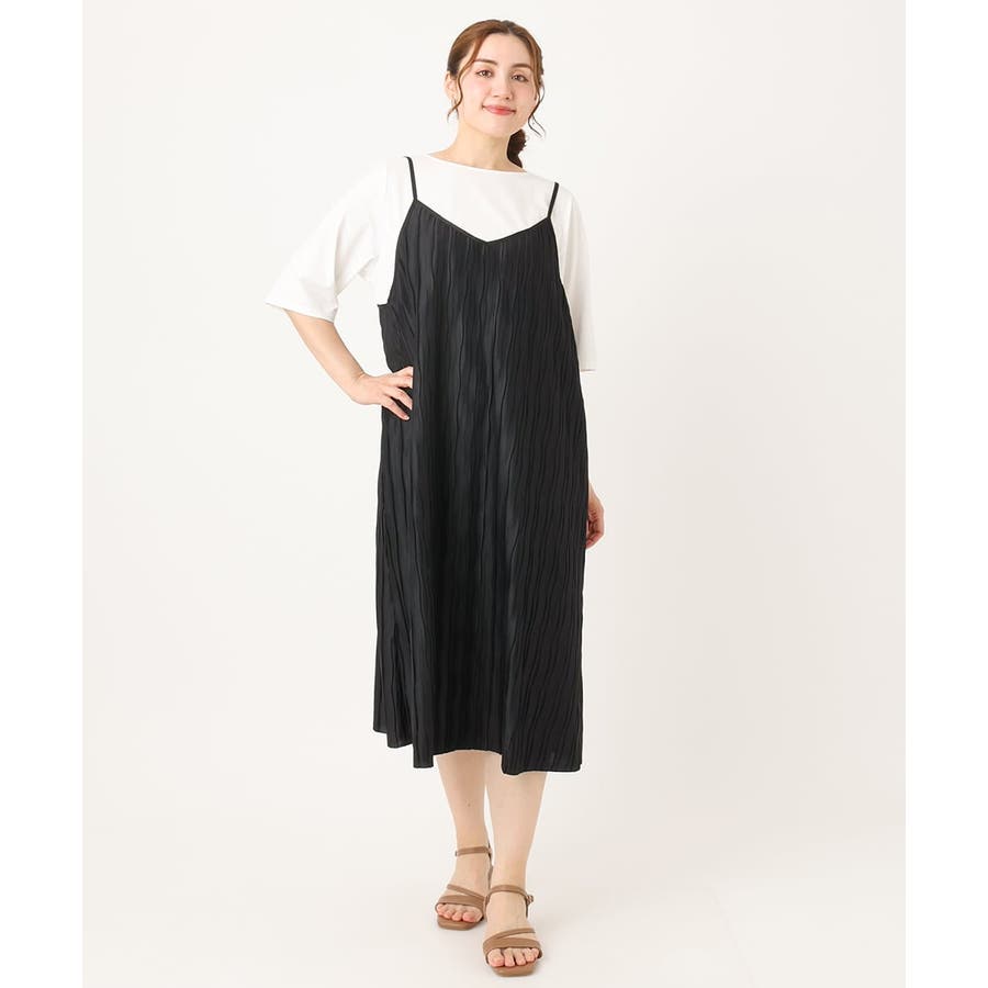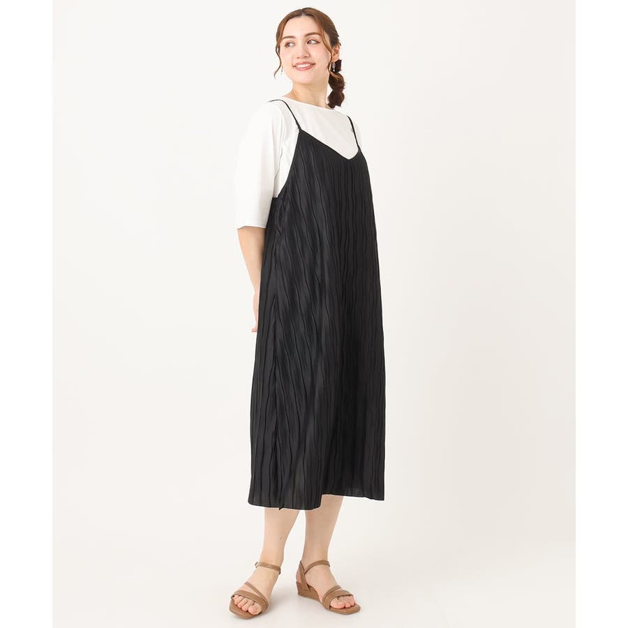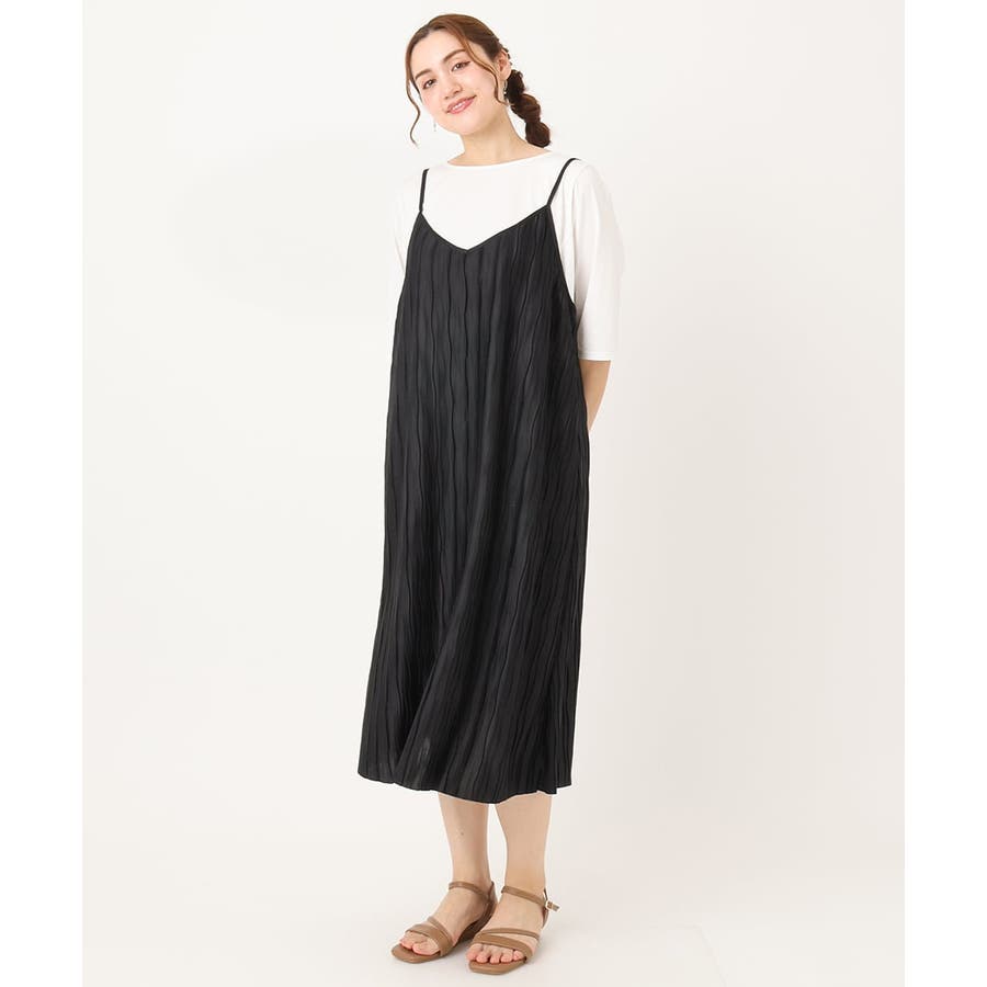 体のラインを拾いにくいランダムプリーツのキャミソールワンピース。