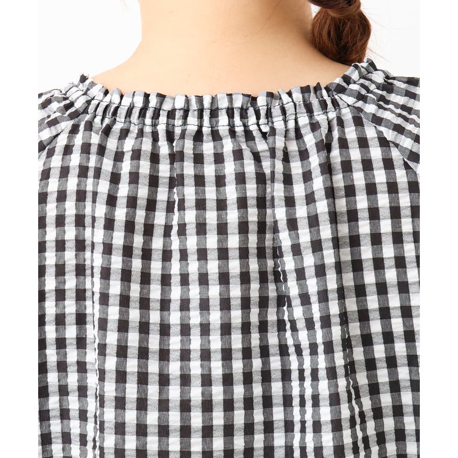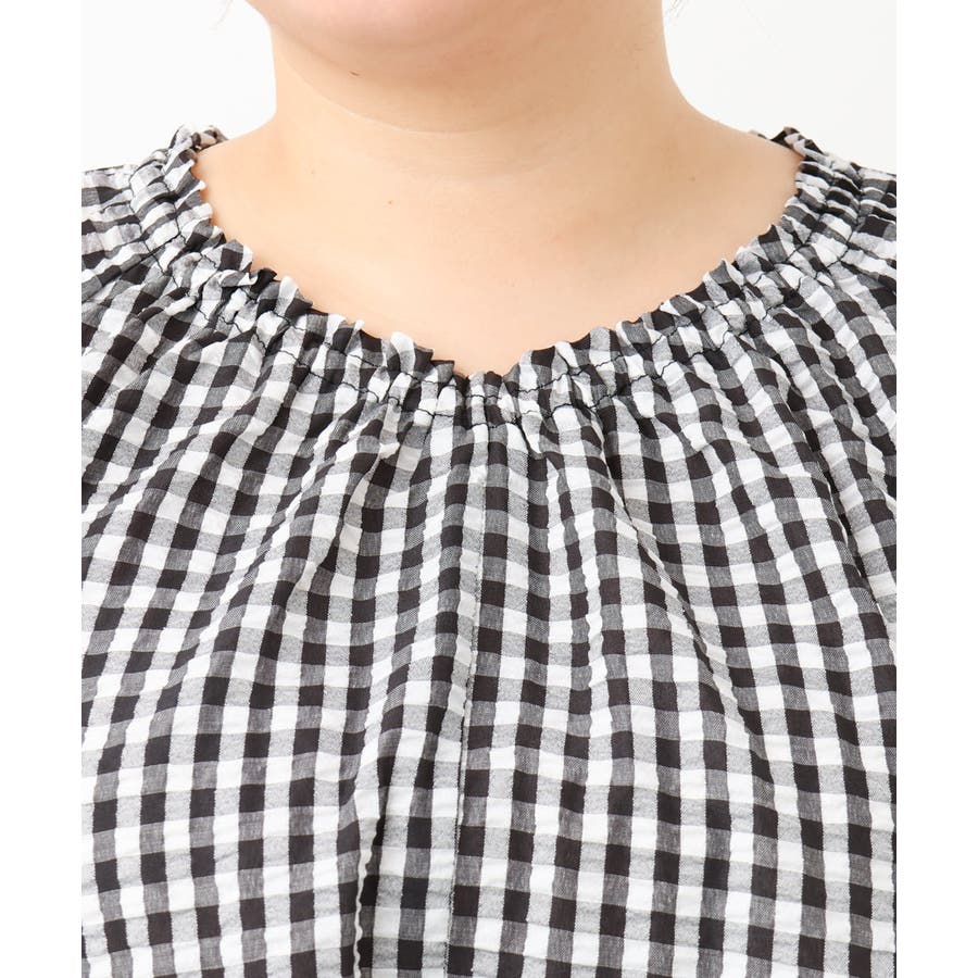 ギャザーの入った浅めのVネックが首周りをすっきり細見せ。
