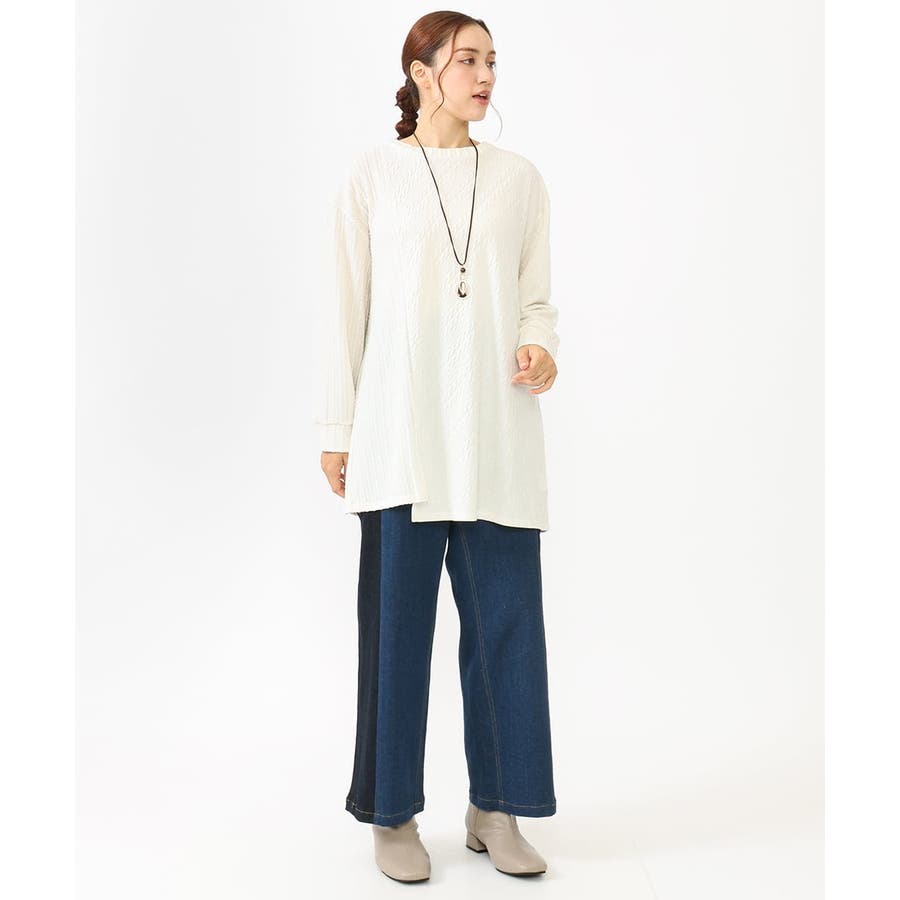 ドロップショルダーのゆったりシルエットに、アシメヘムで腰回りもカバー。