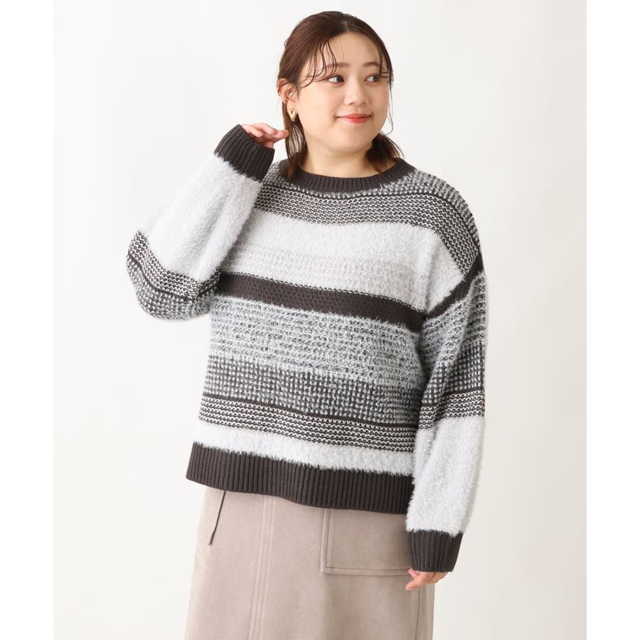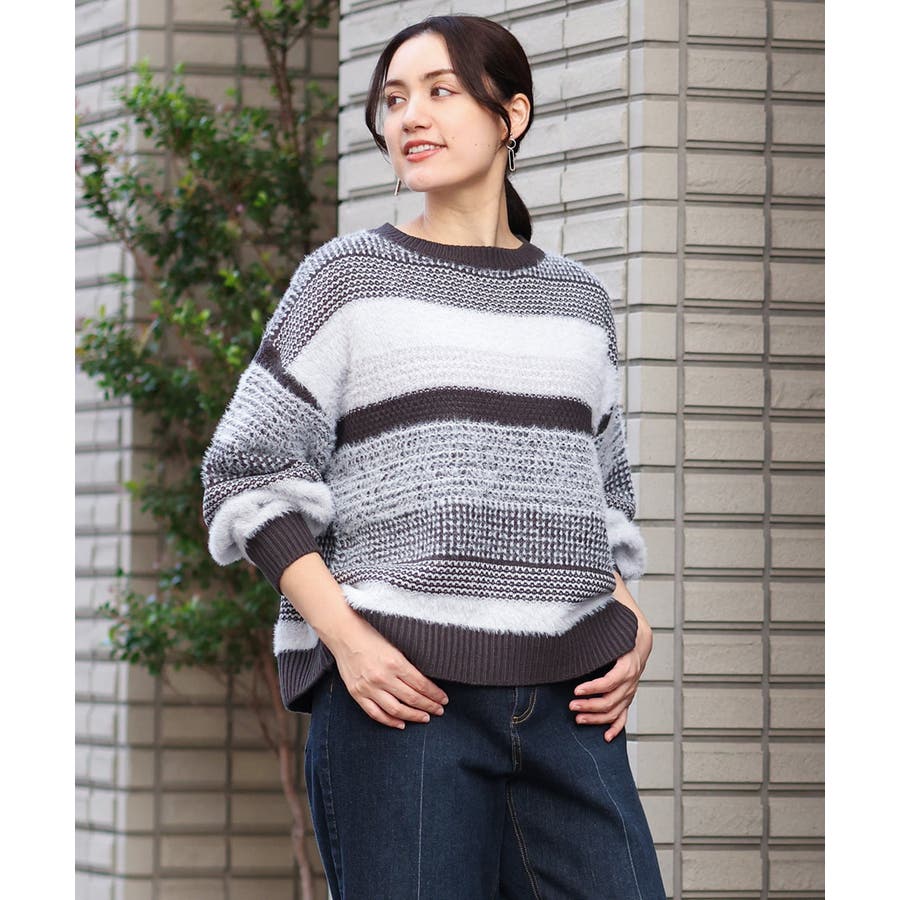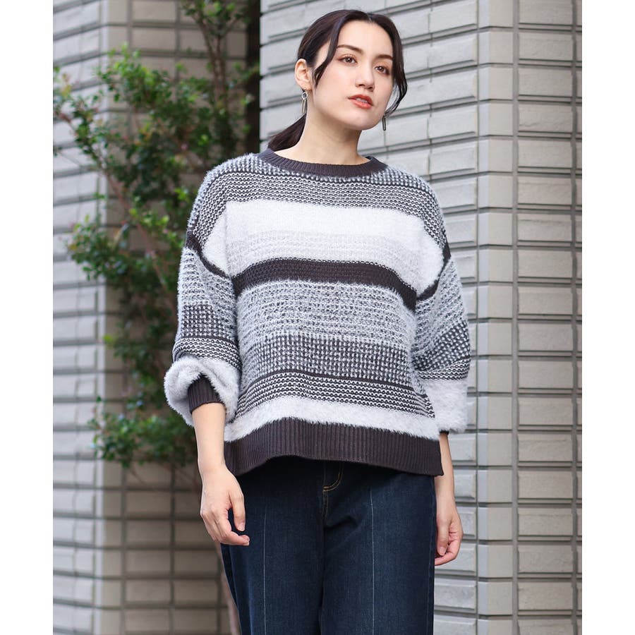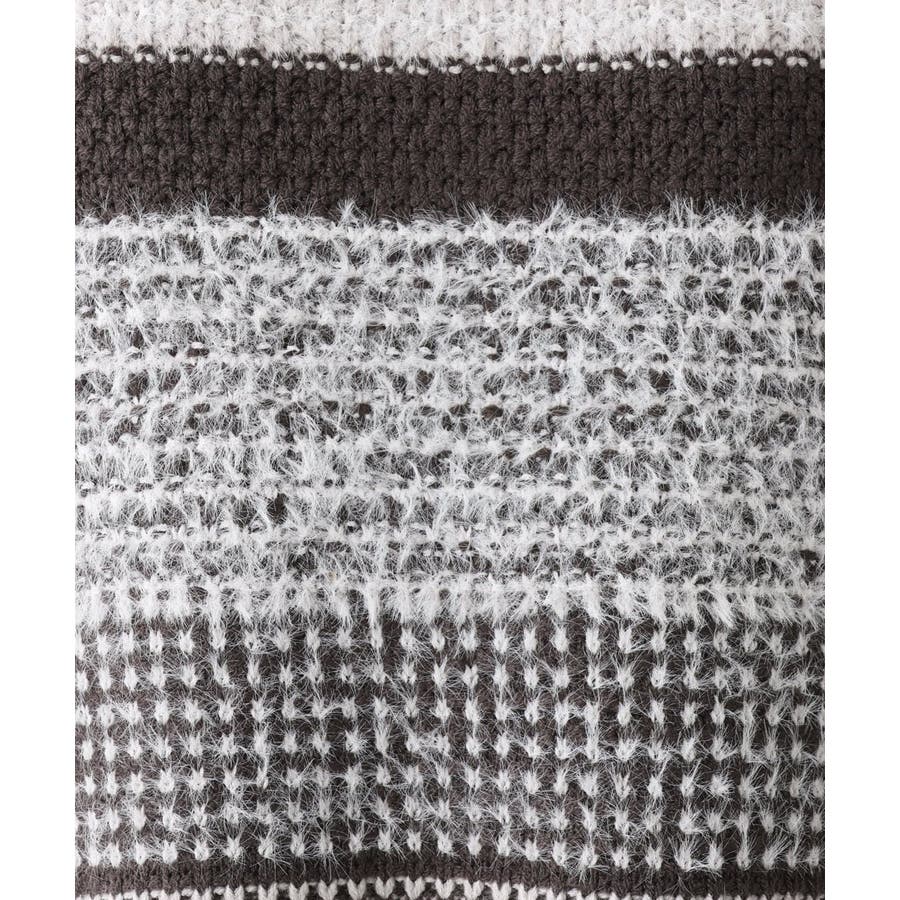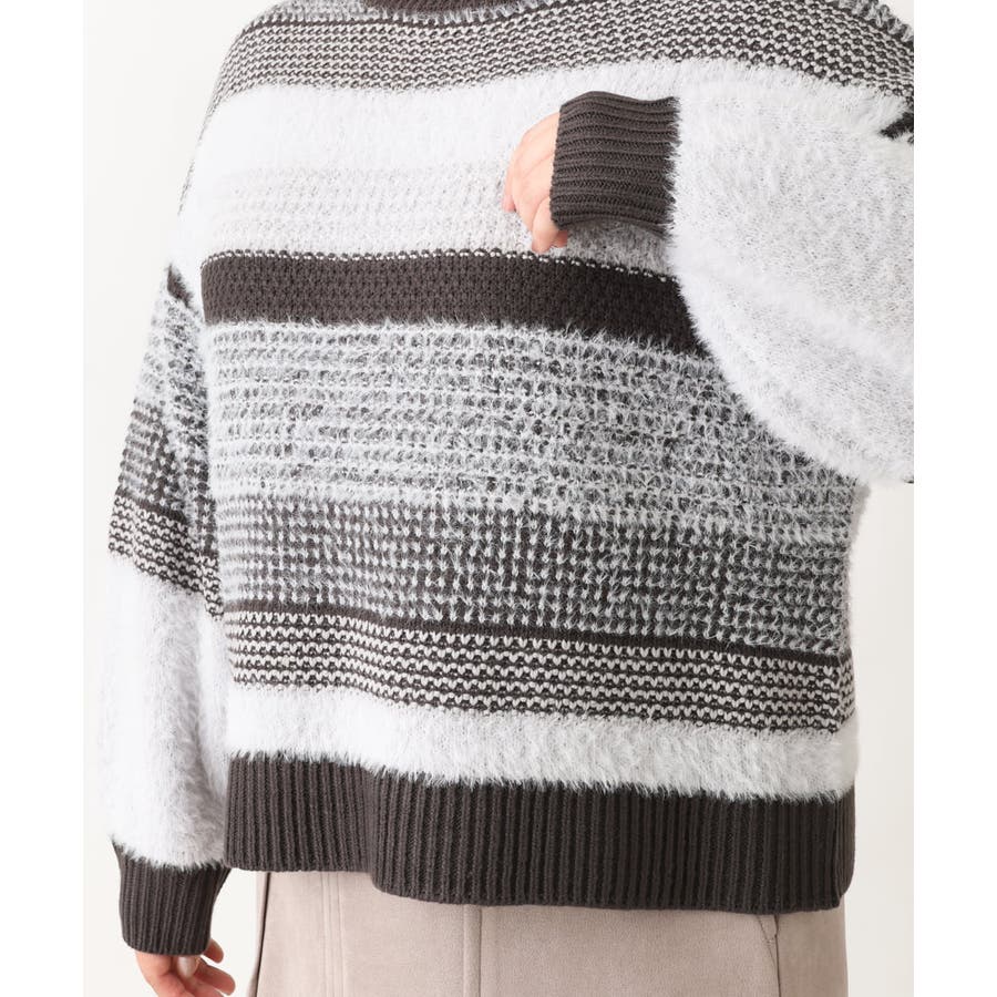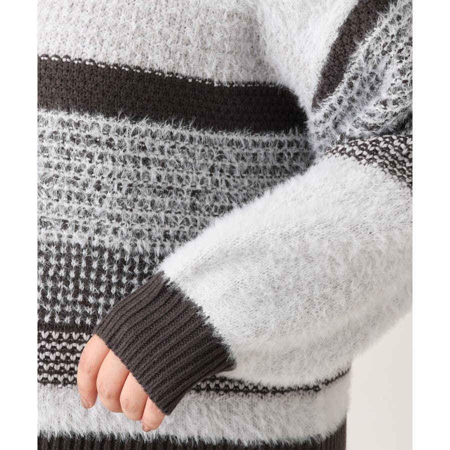 アクリルの糸とナイロンシャギーの糸を変わり編み風にボーダー柄に編んだニット。