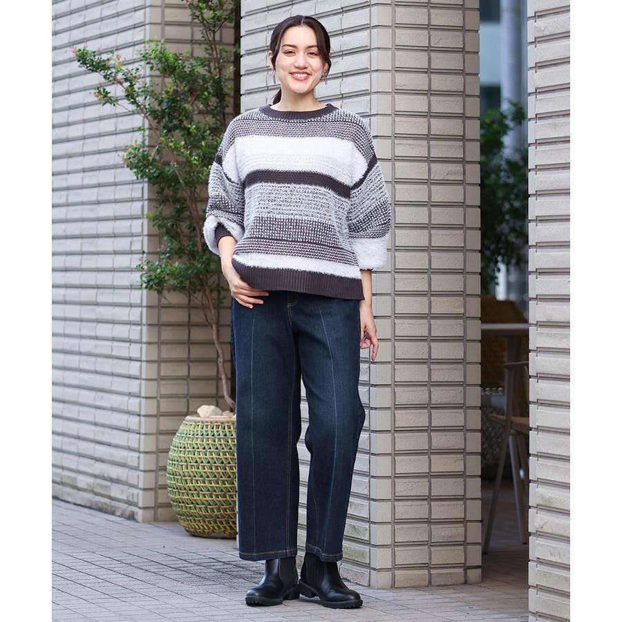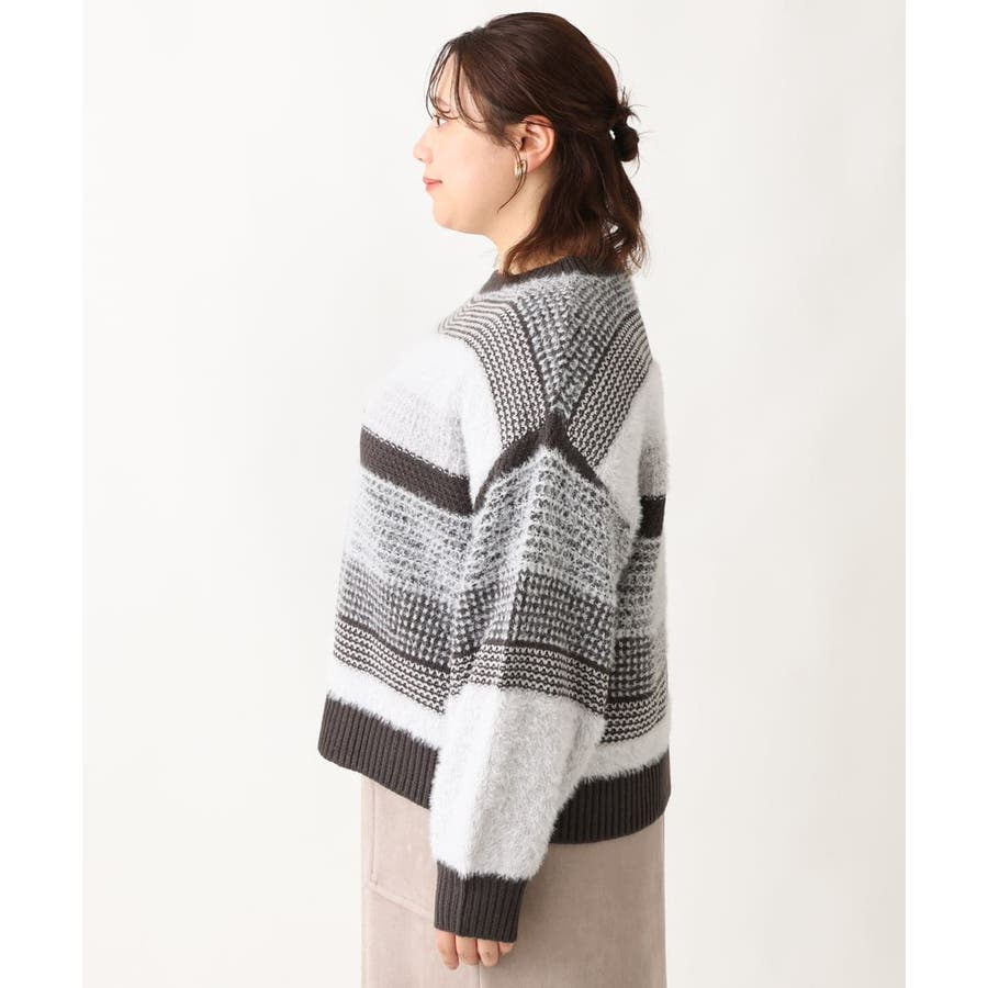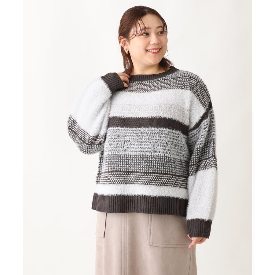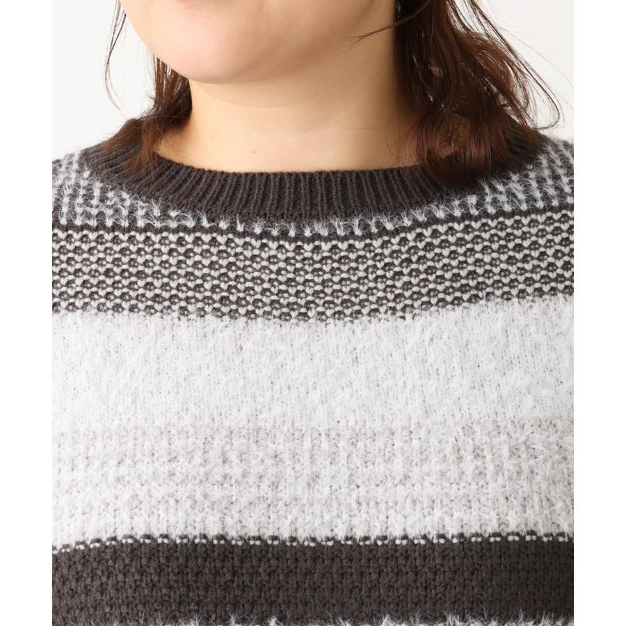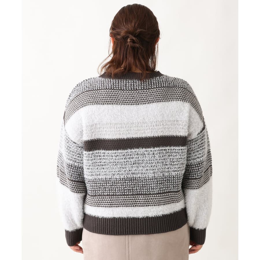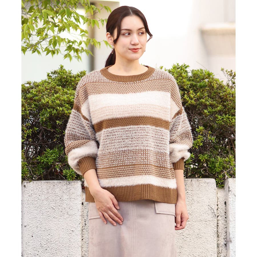 アクリルの糸とナイロンシャギーの糸を変わり編み風にボーダー柄に編んだニット。