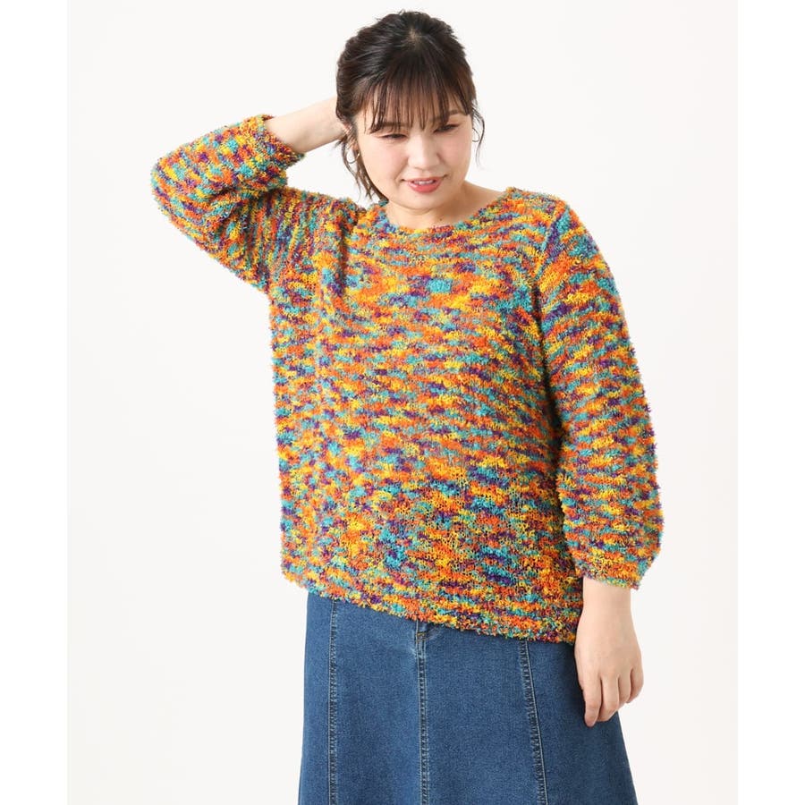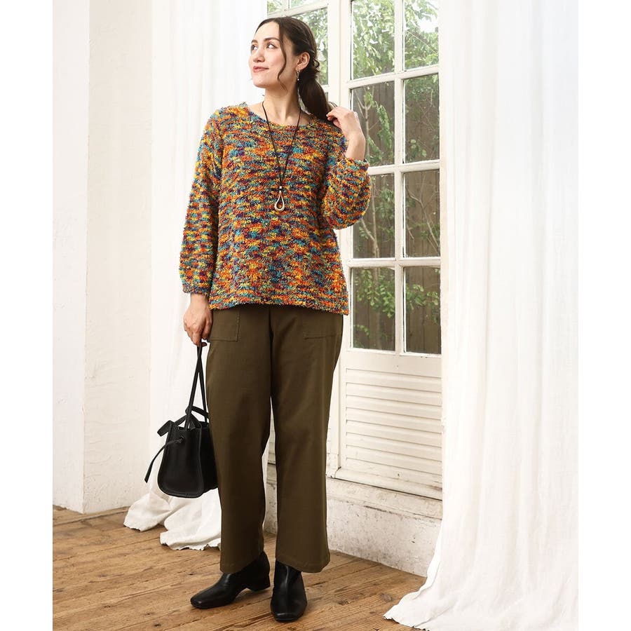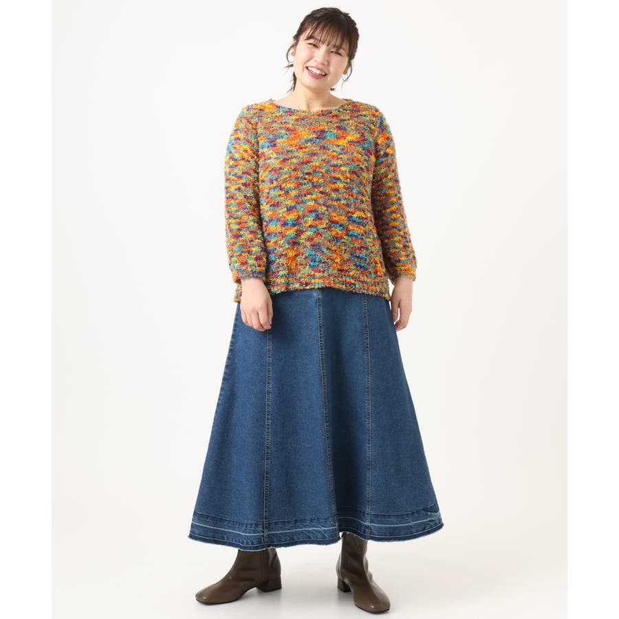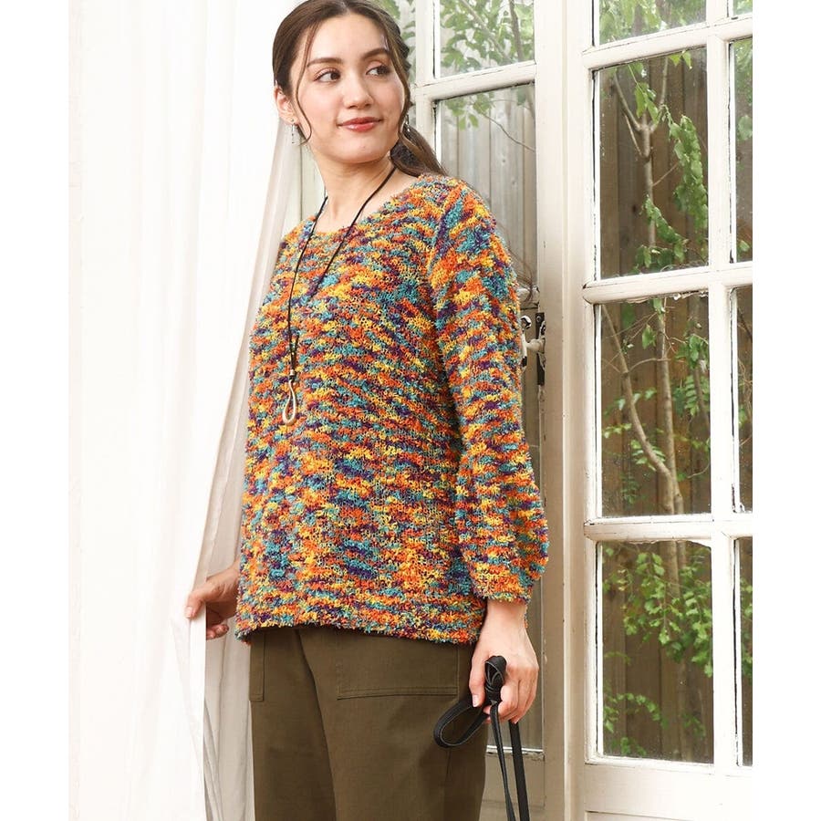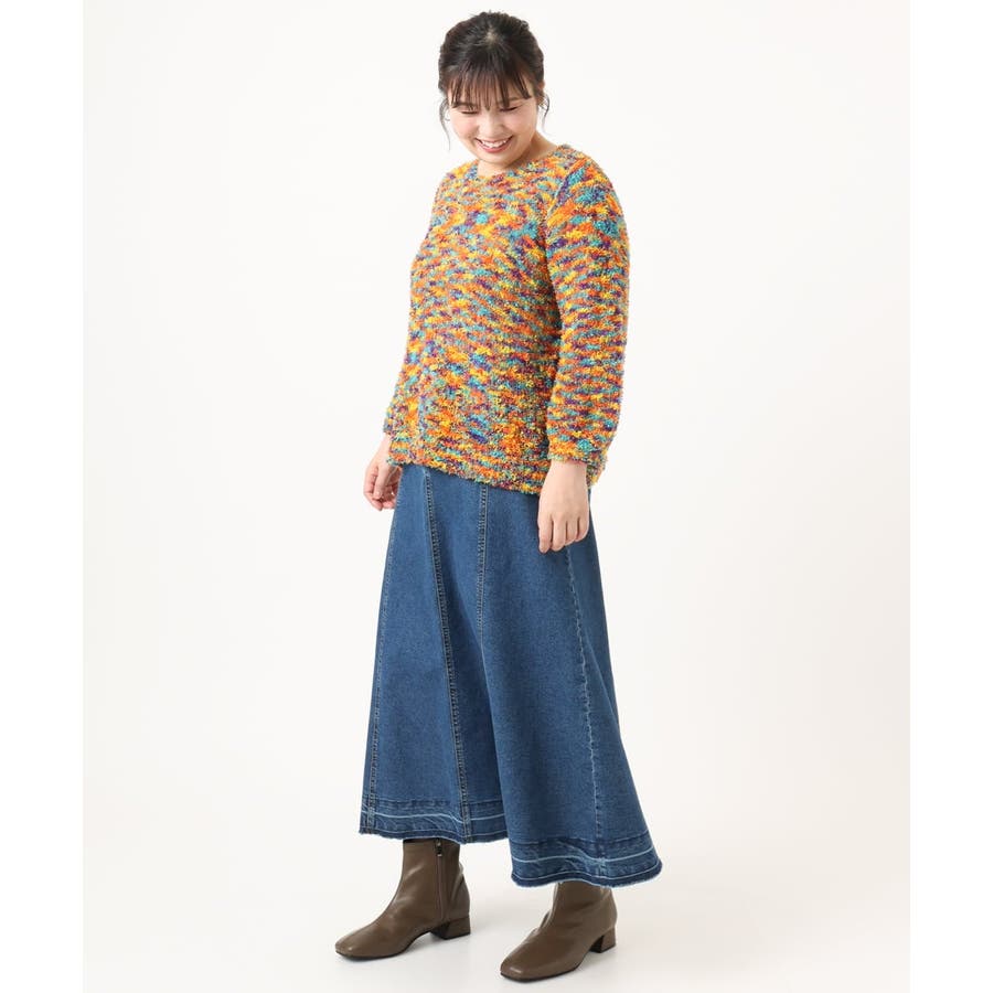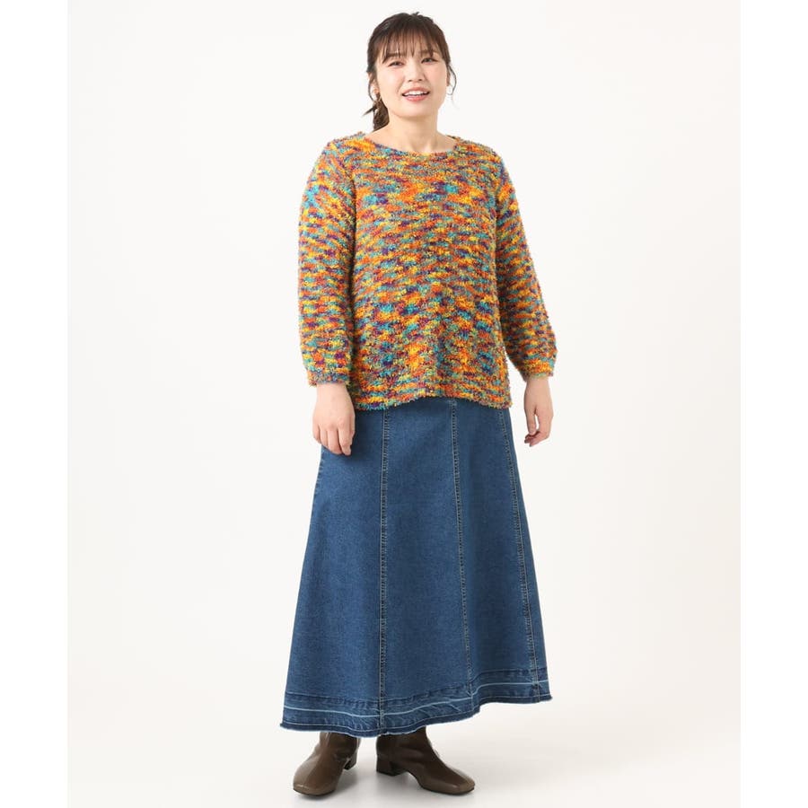 オレンジ(15)はポップなミックスカラーをコーディネートの主役に、ボトムはシンプルなデニムやベイカーパンツ合わせが◎