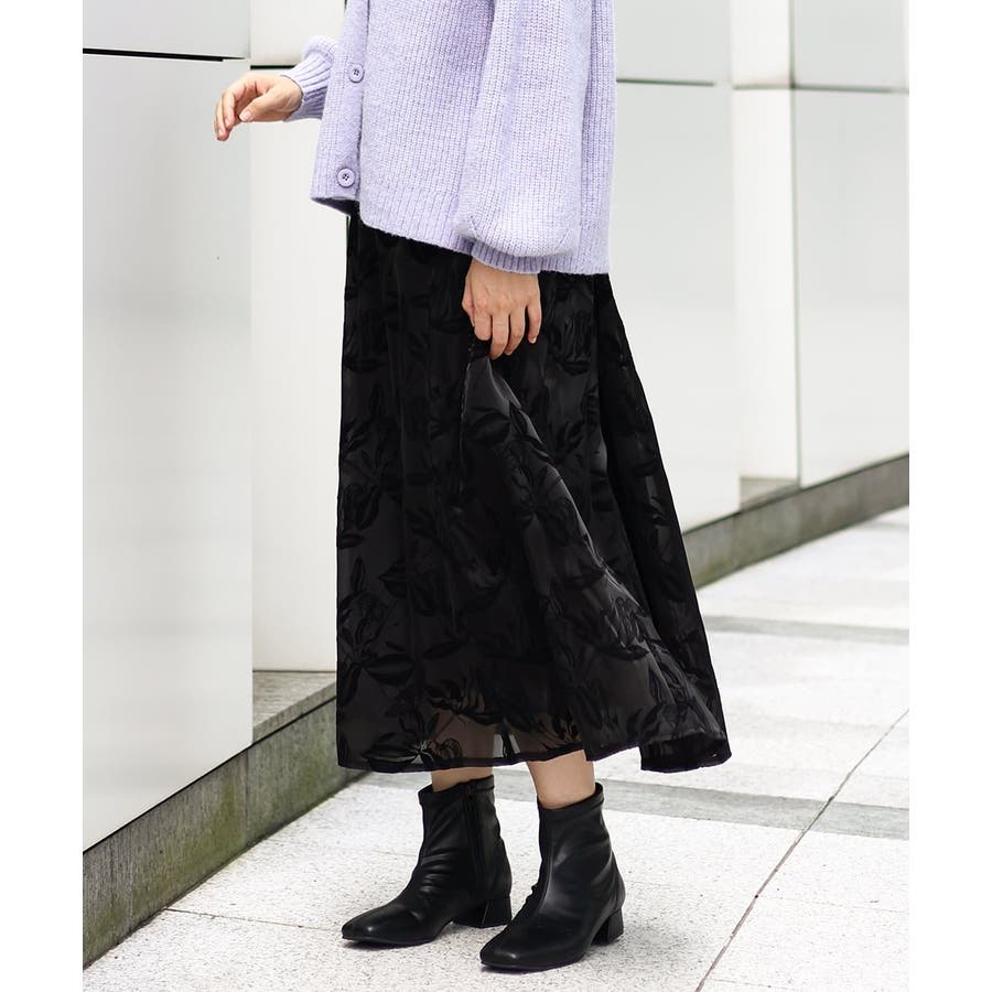 程よいハリとシアーな光沢素材が今年らしいフロッキープリントのスカート。