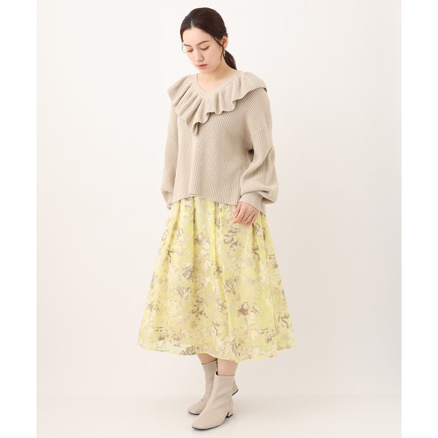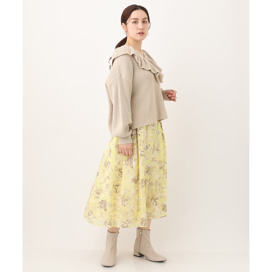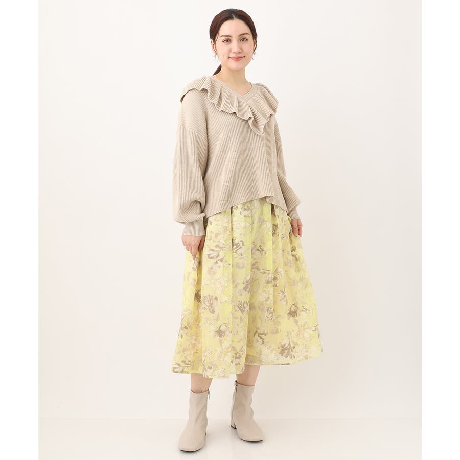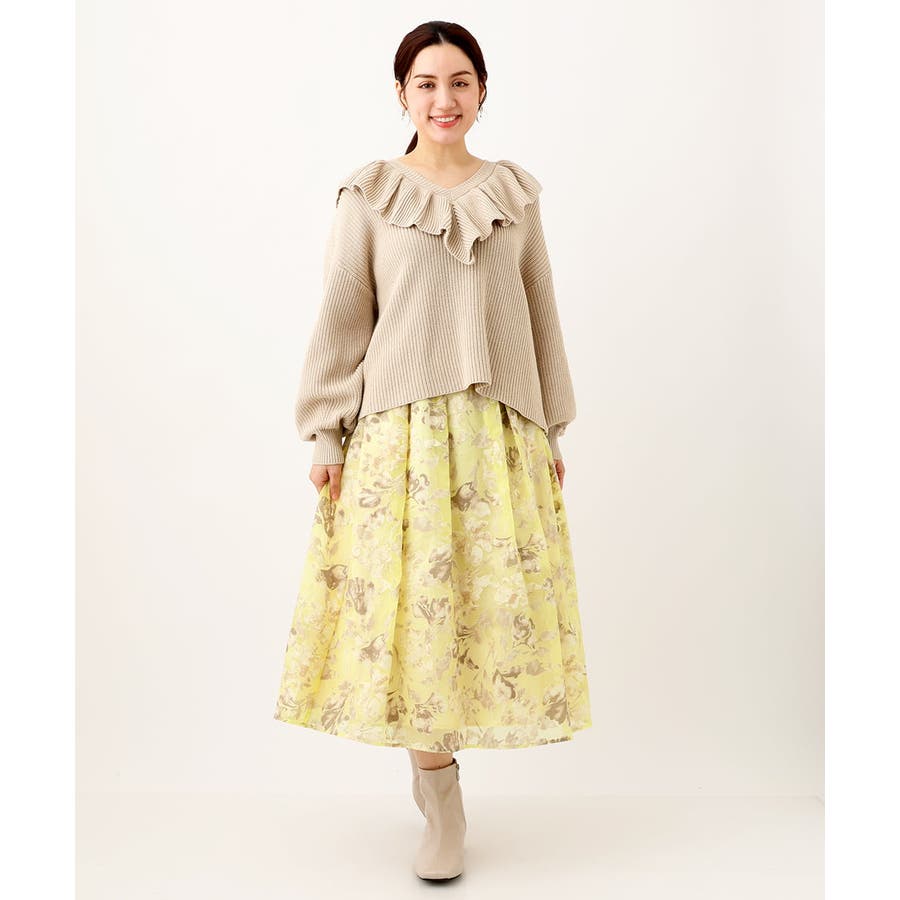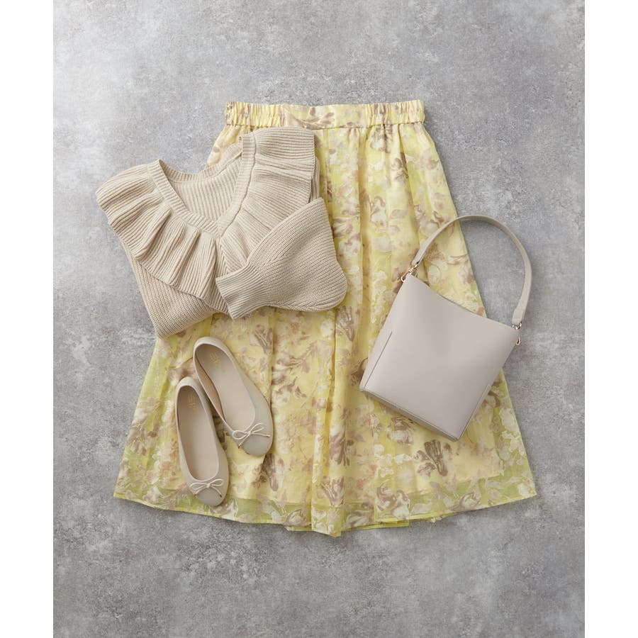 今年らしいシアーで少し張りのあるオパール生地は春らしいスタイリングのポイントになるイエローベースのフラワープリント。